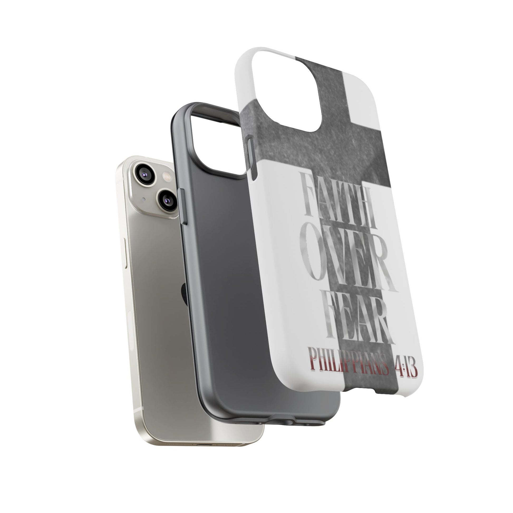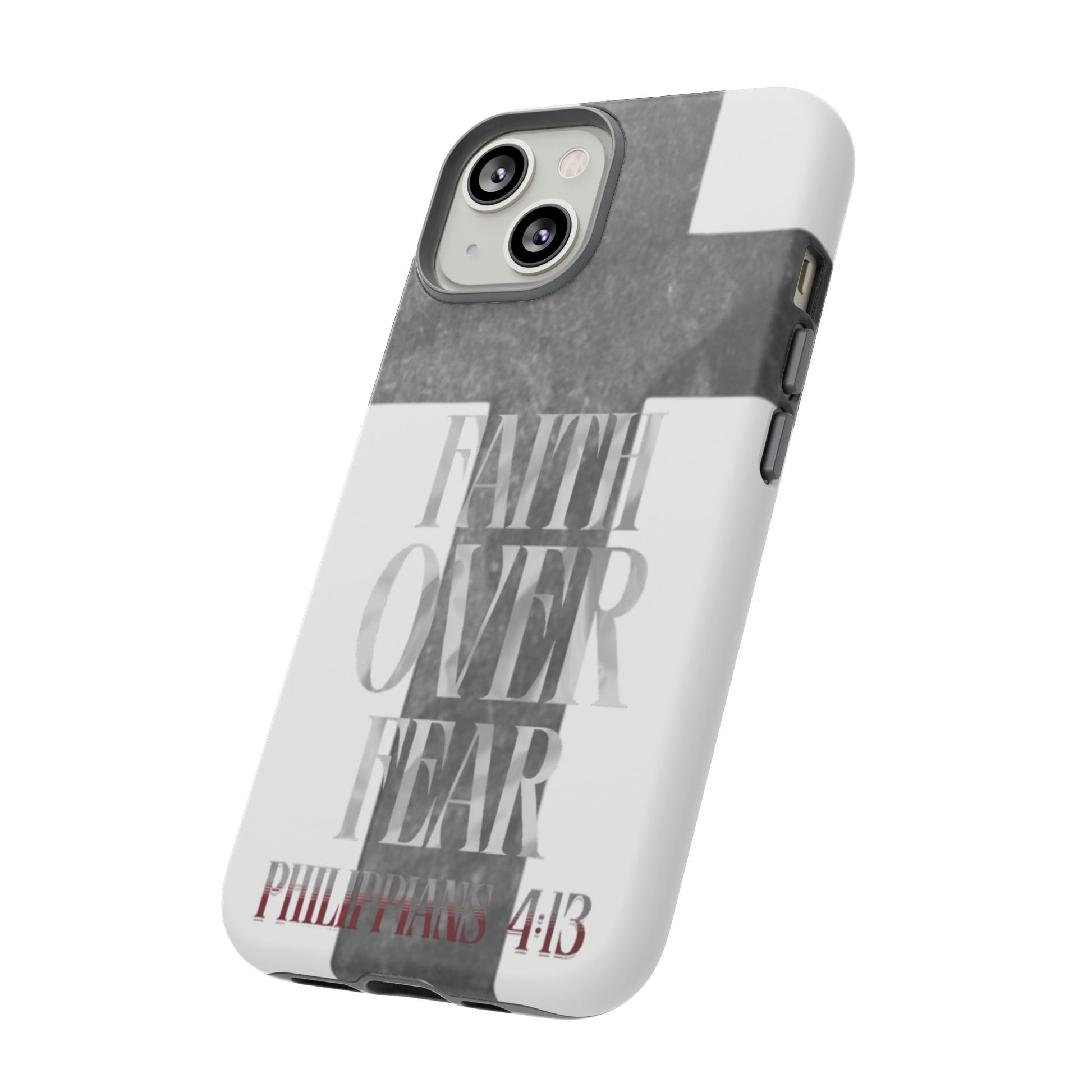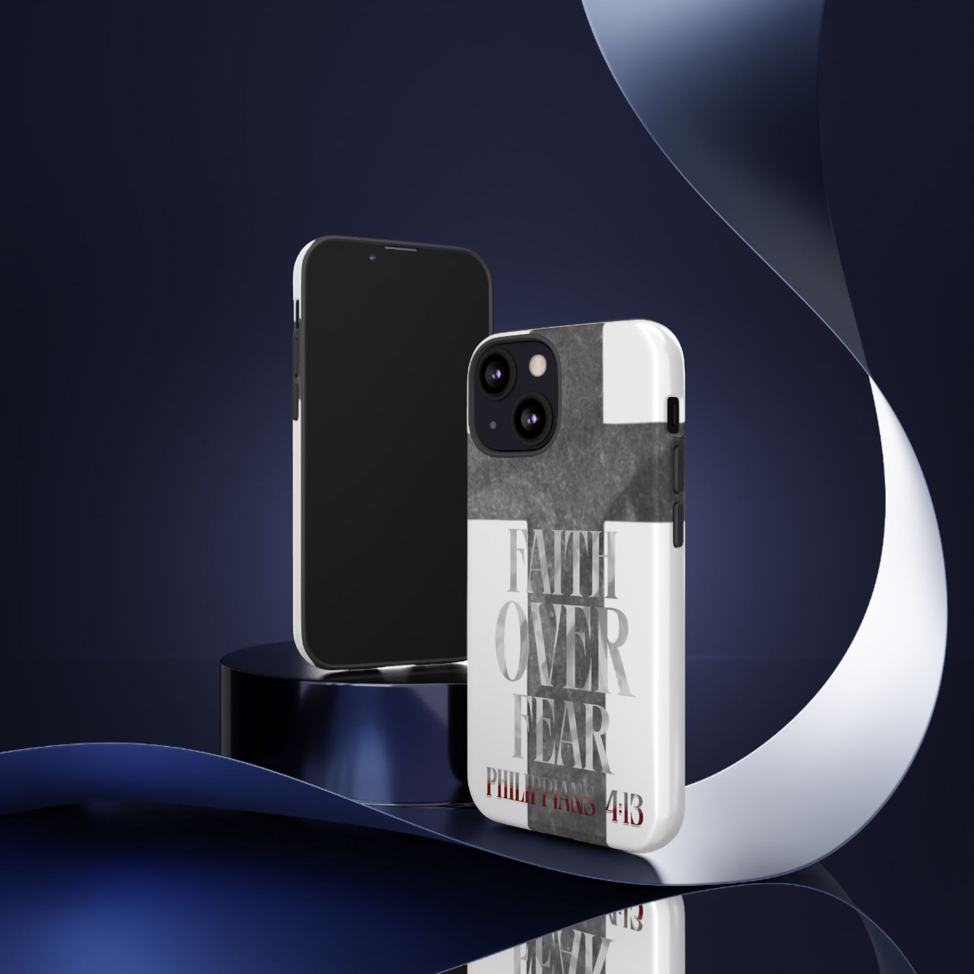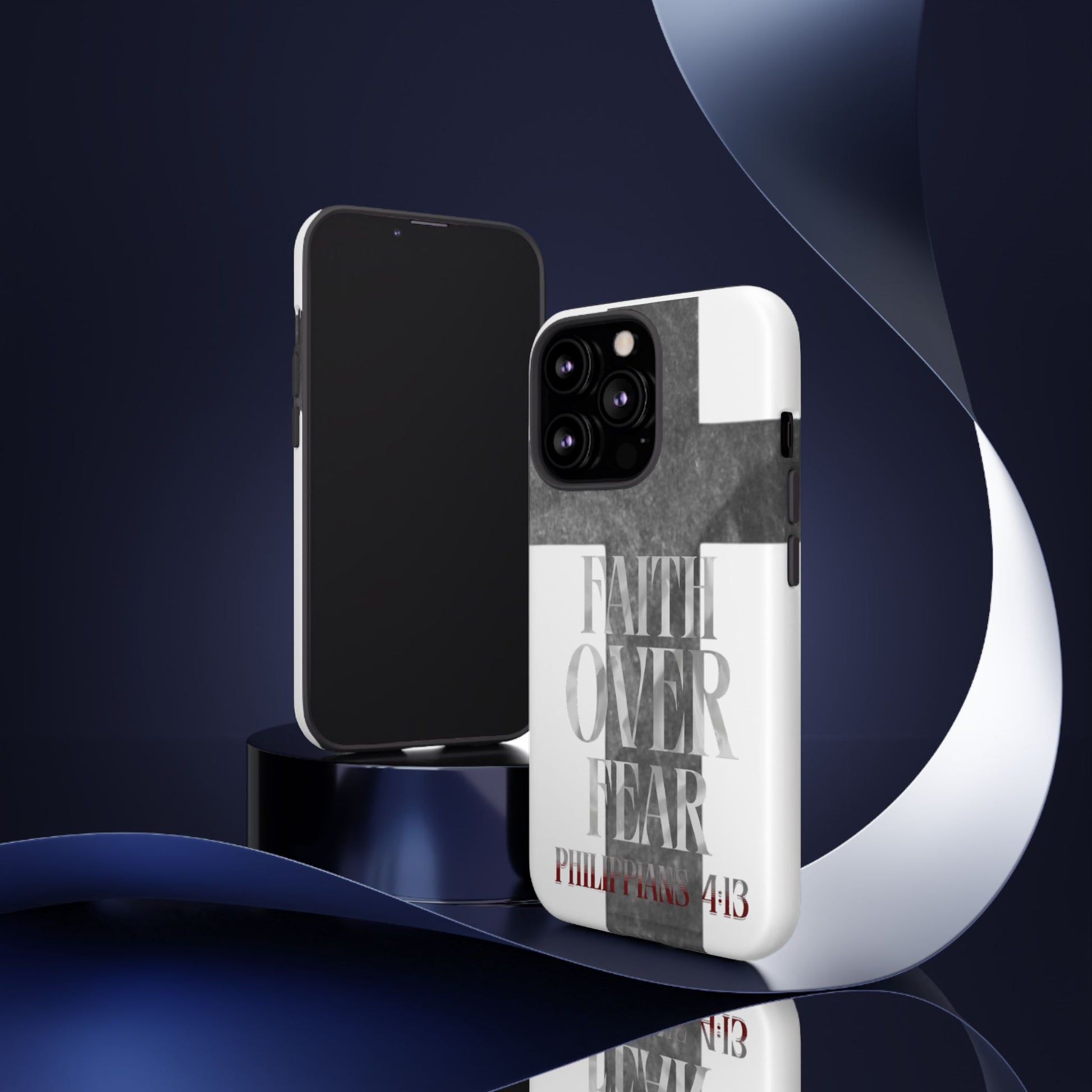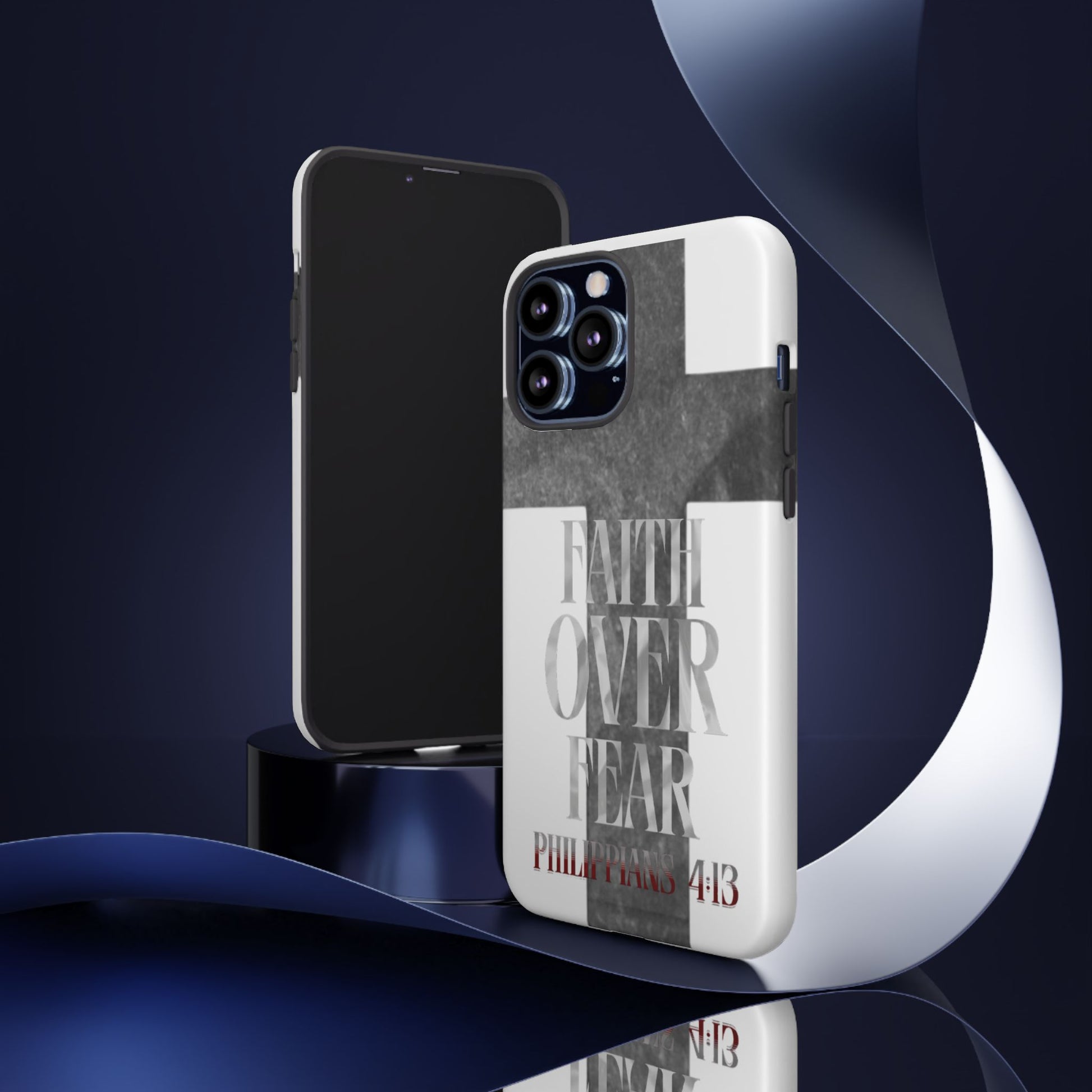 This Phone Case with the design Faith Over Fear on a white background exudes positivity and resilience. Perfect for individuals who value faith and strength in overcoming challenges. Ideal for Christians and spiritual individuals. Relevant for gifts on occasions like birthdays, Christmas, Easter, and as a token of support during tough times.