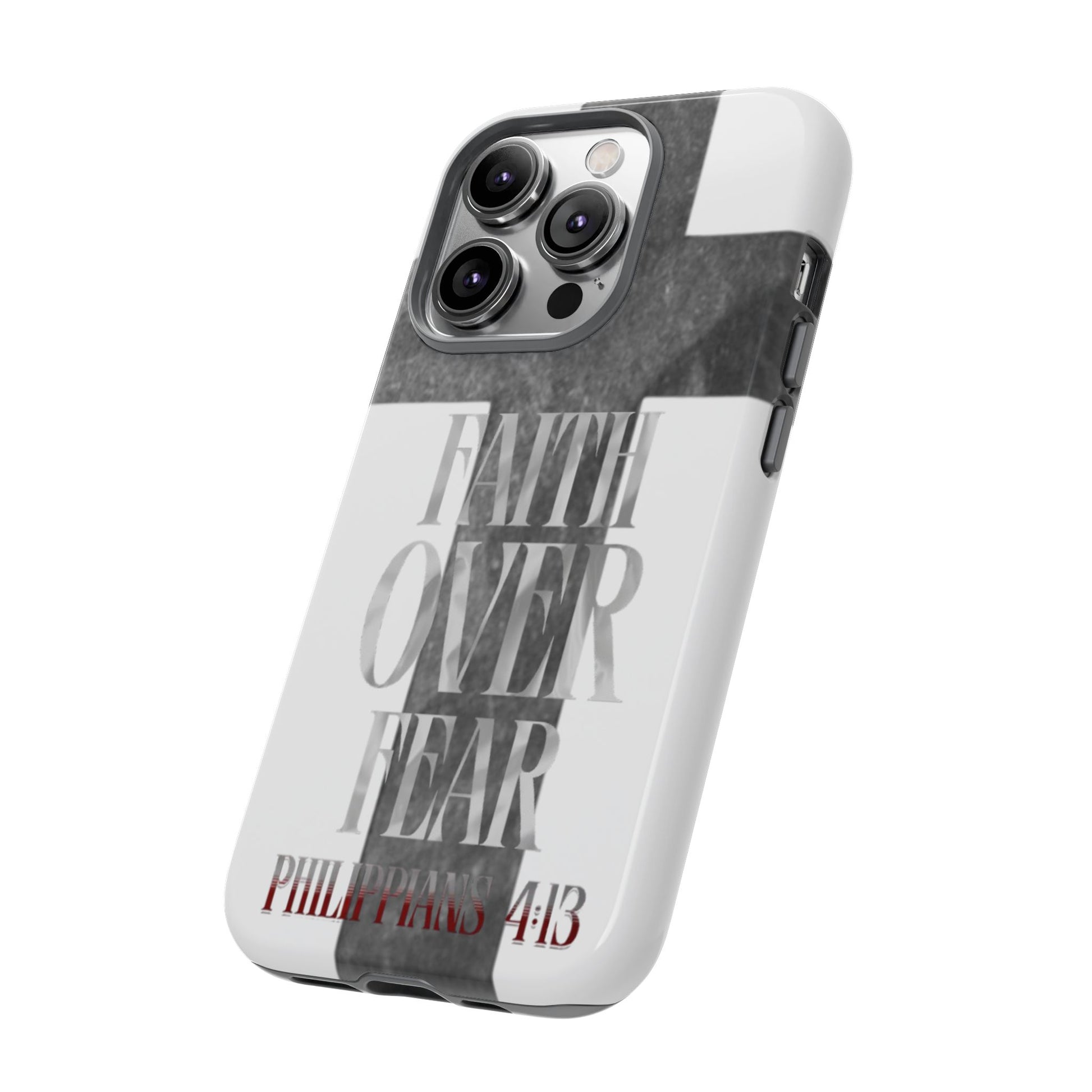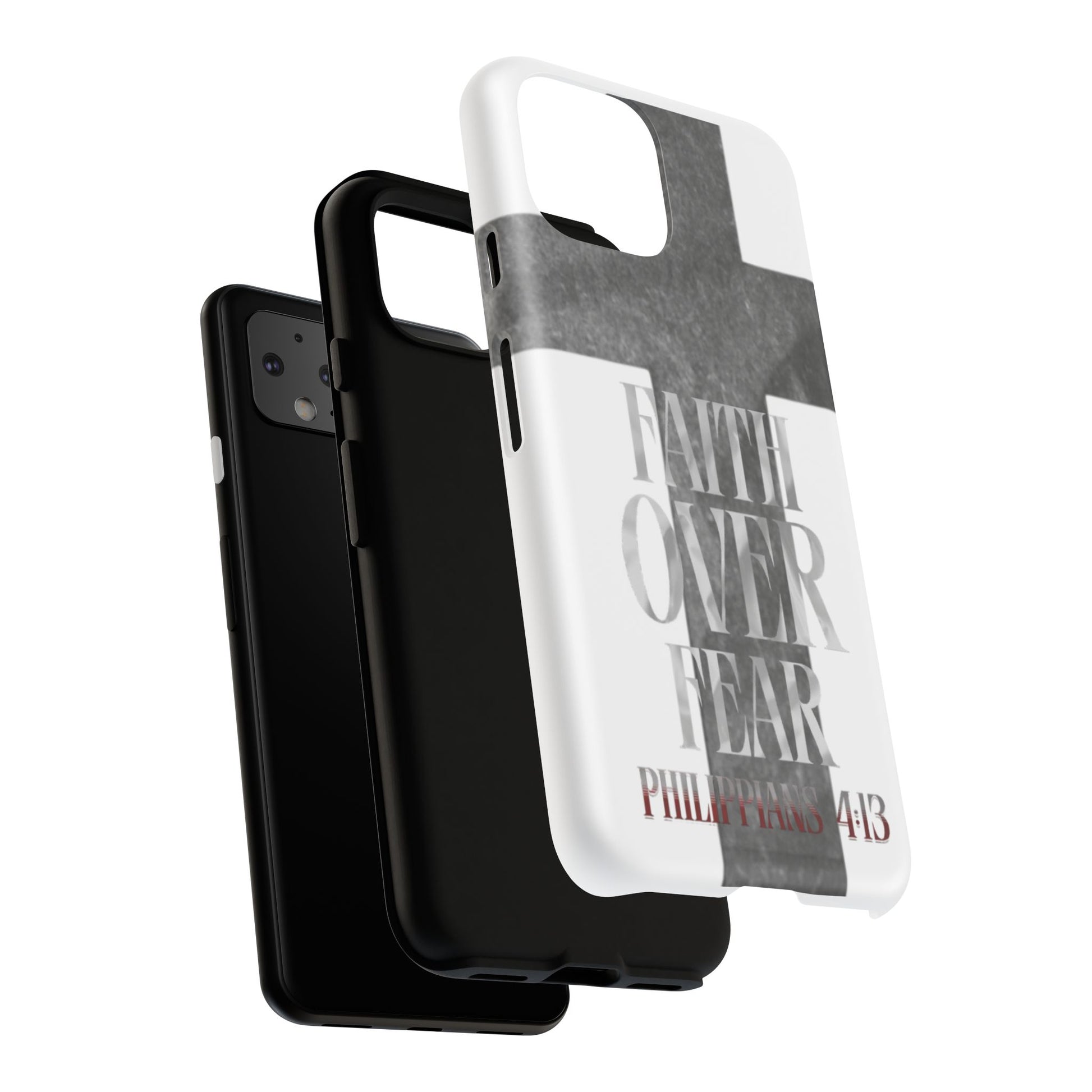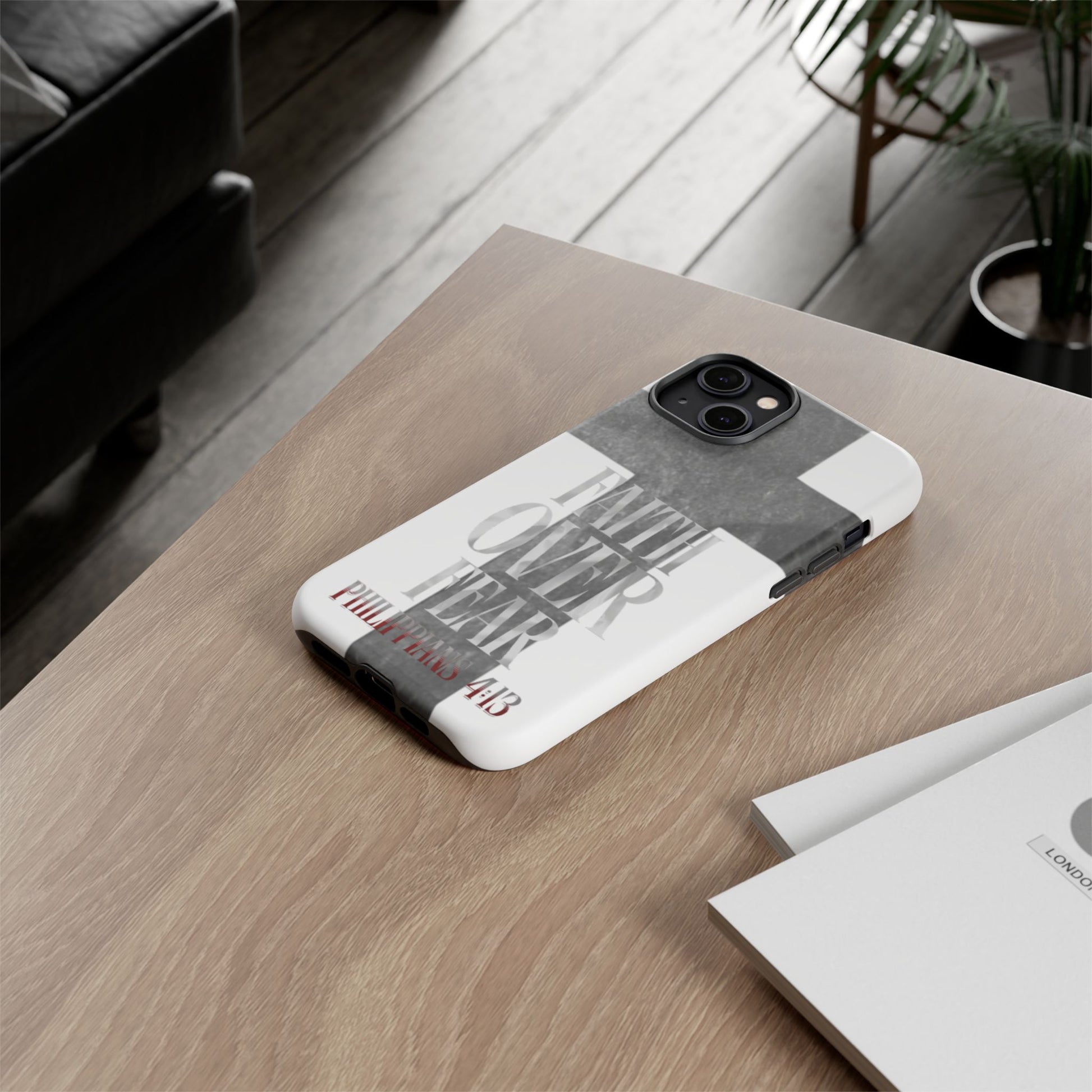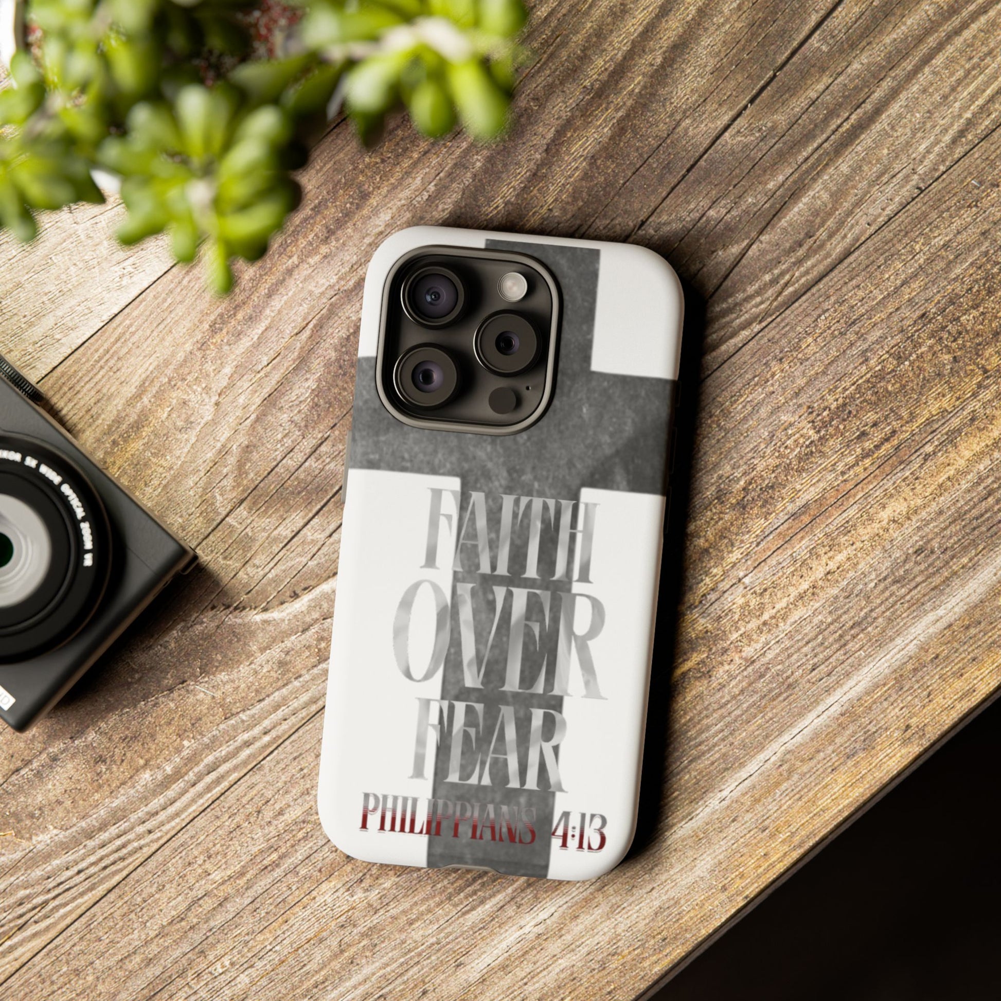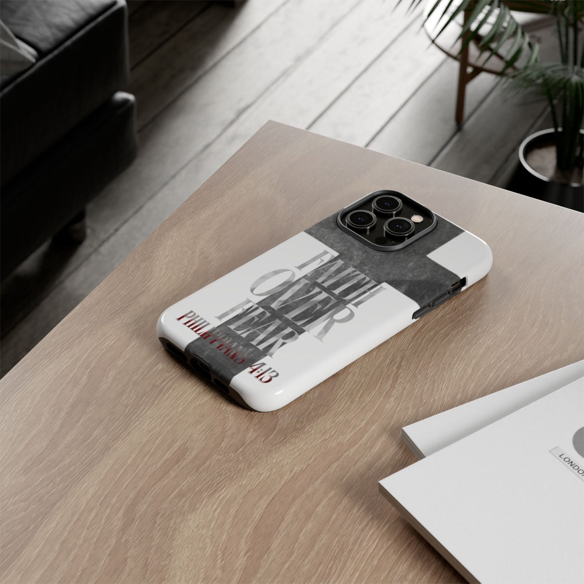 This Phone Case with the design Faith Over Fear on a white background exudes positivity and resilience. Perfect for individuals who value faith and strength in overcoming challenges. Ideal for Christians and spiritual individuals. Relevant for gifts on occasions like birthdays, Christmas, Easter, and as a token of support during tough times.