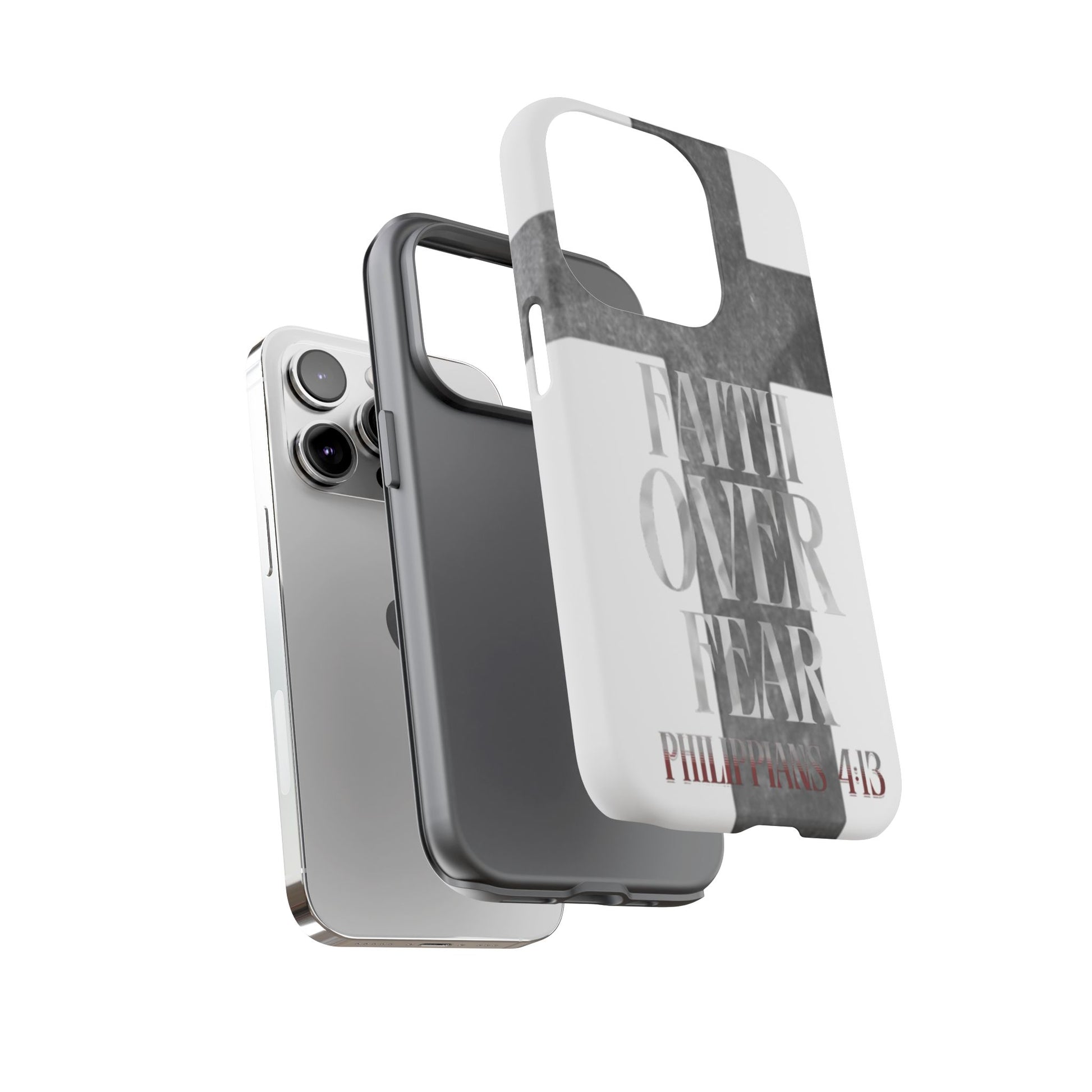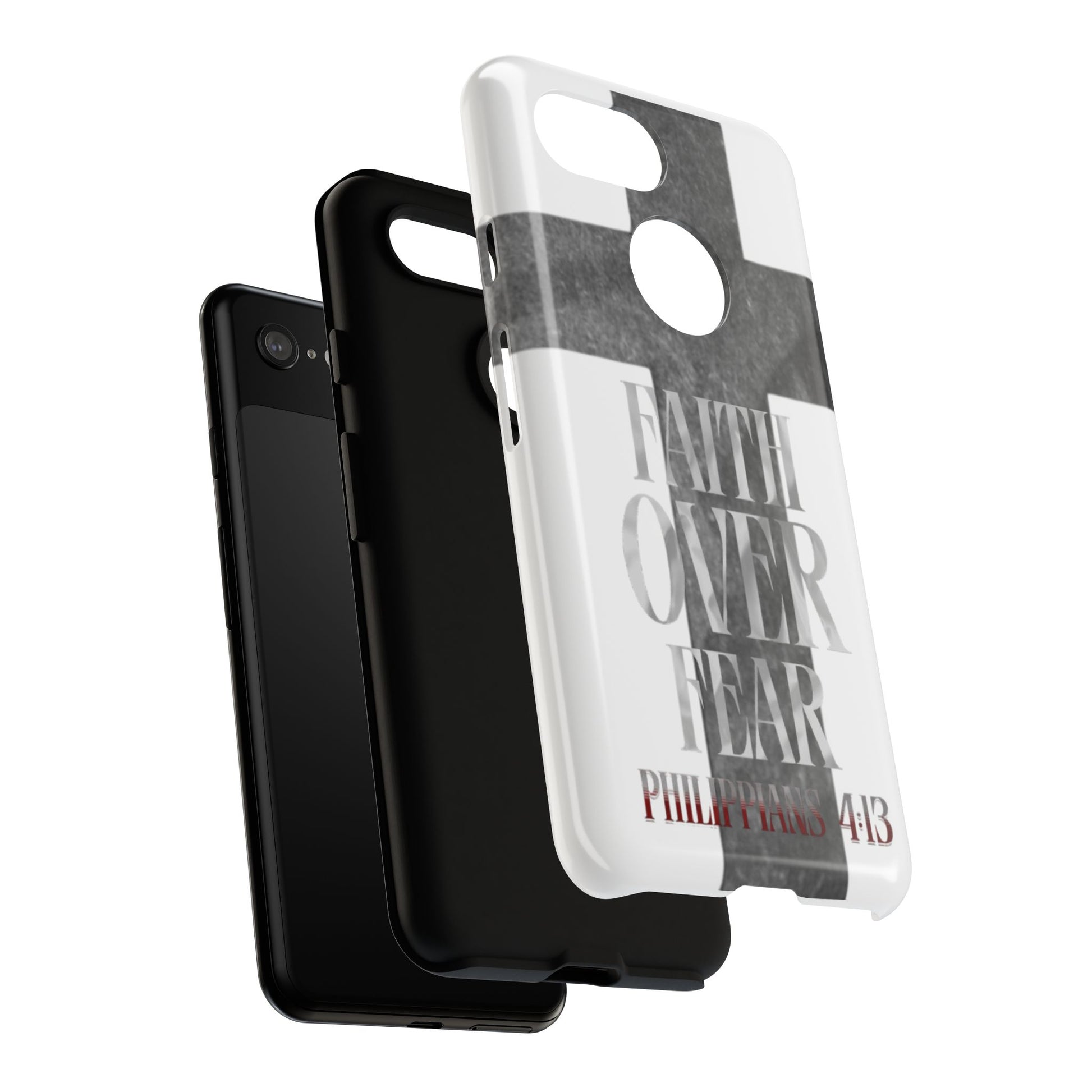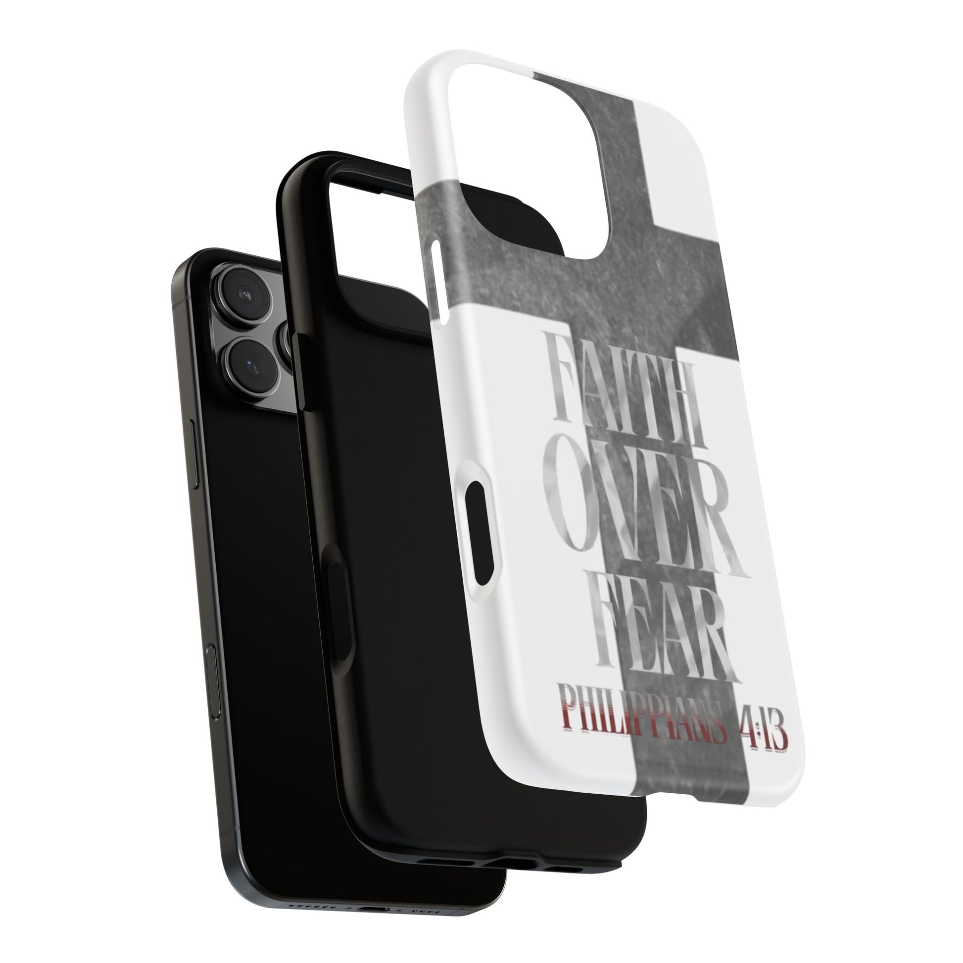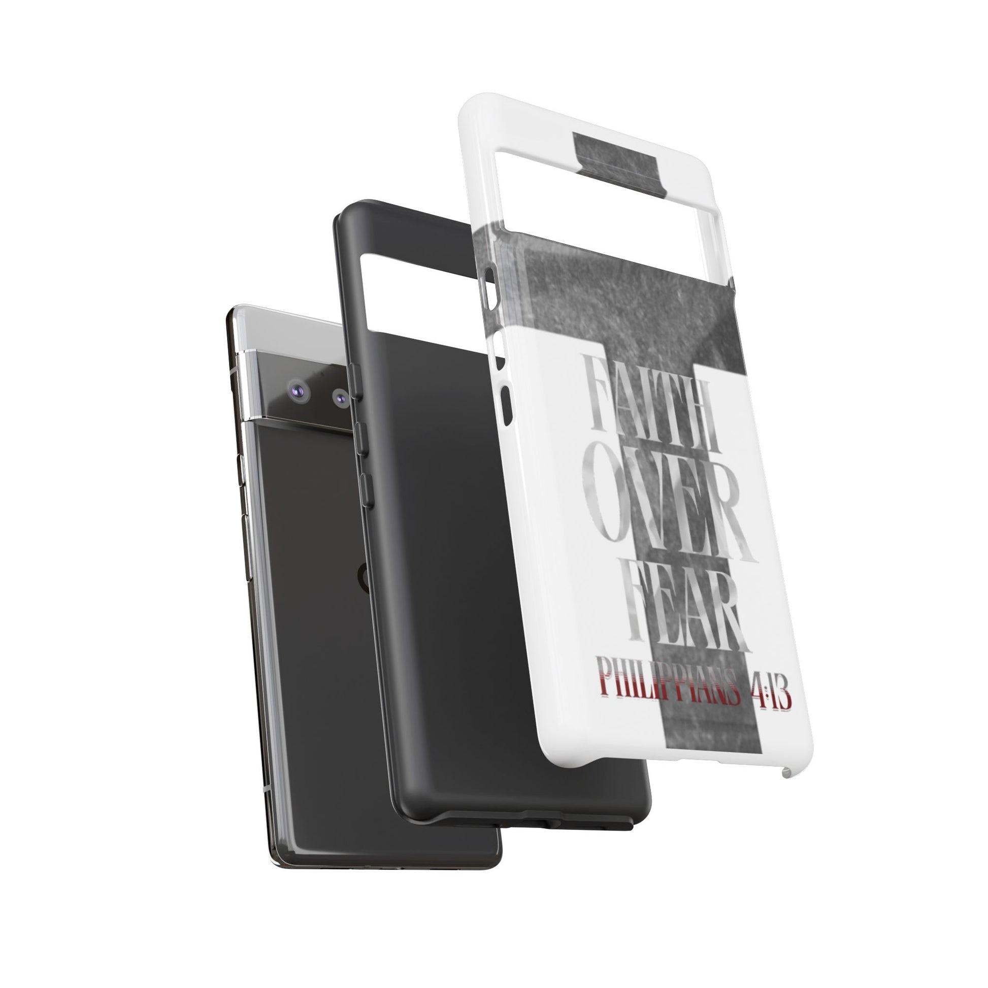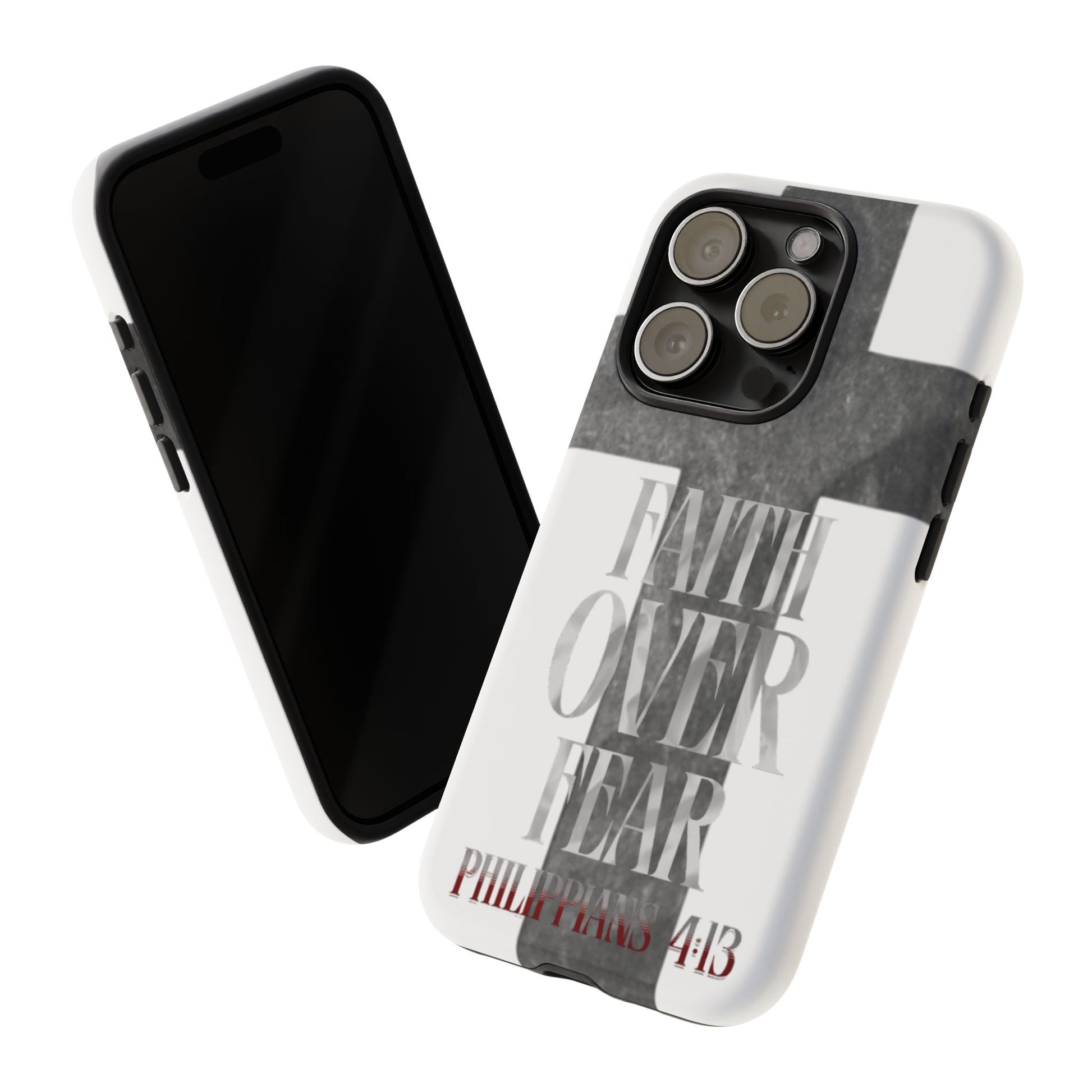 This Phone Case with the design Faith Over Fear on a white background exudes positivity and resilience. Perfect for individuals who value faith and strength in overcoming challenges. Ideal for Christians and spiritual individuals. Relevant for gifts on occasions like birthdays, Christmas, Easter, and as a token of support during tough times.