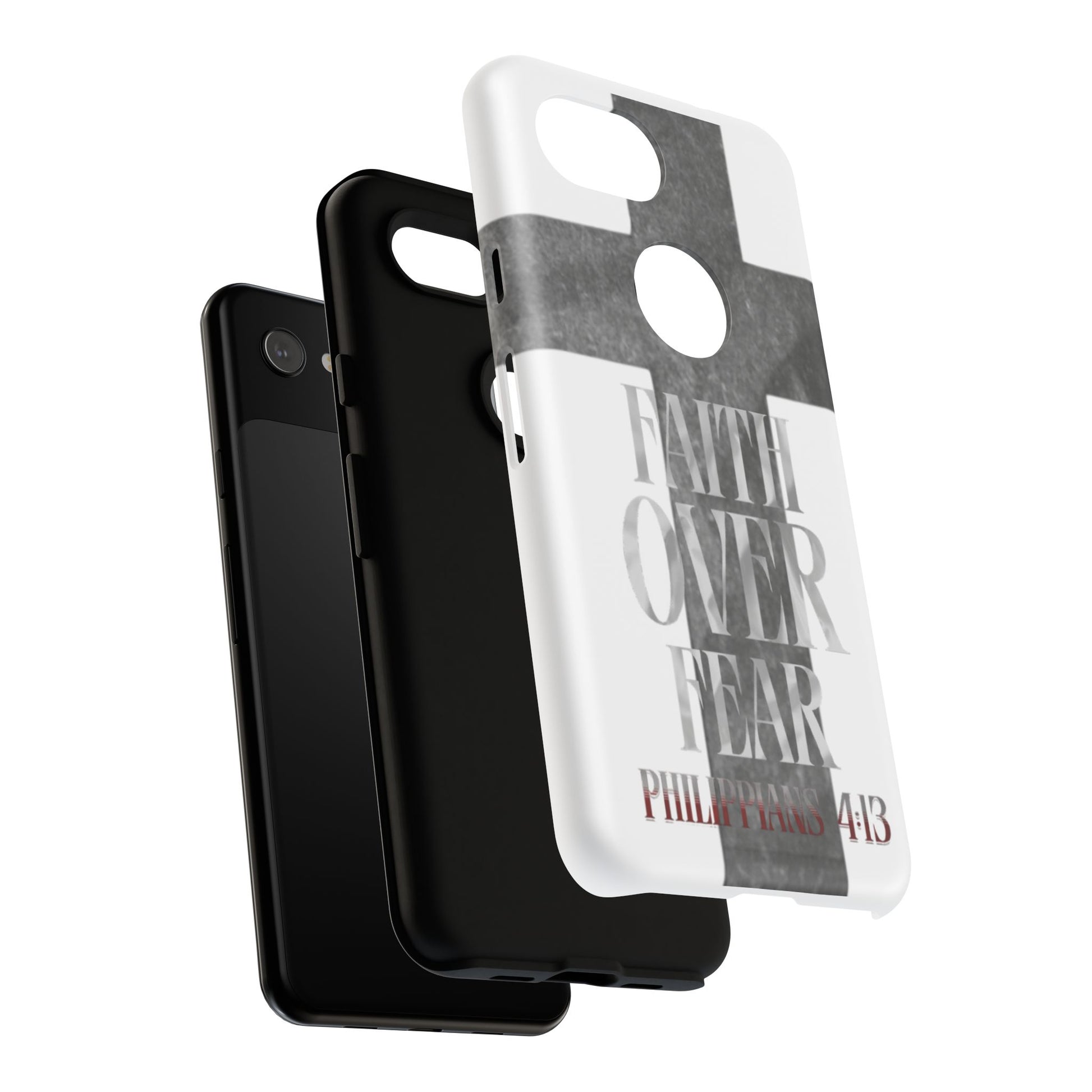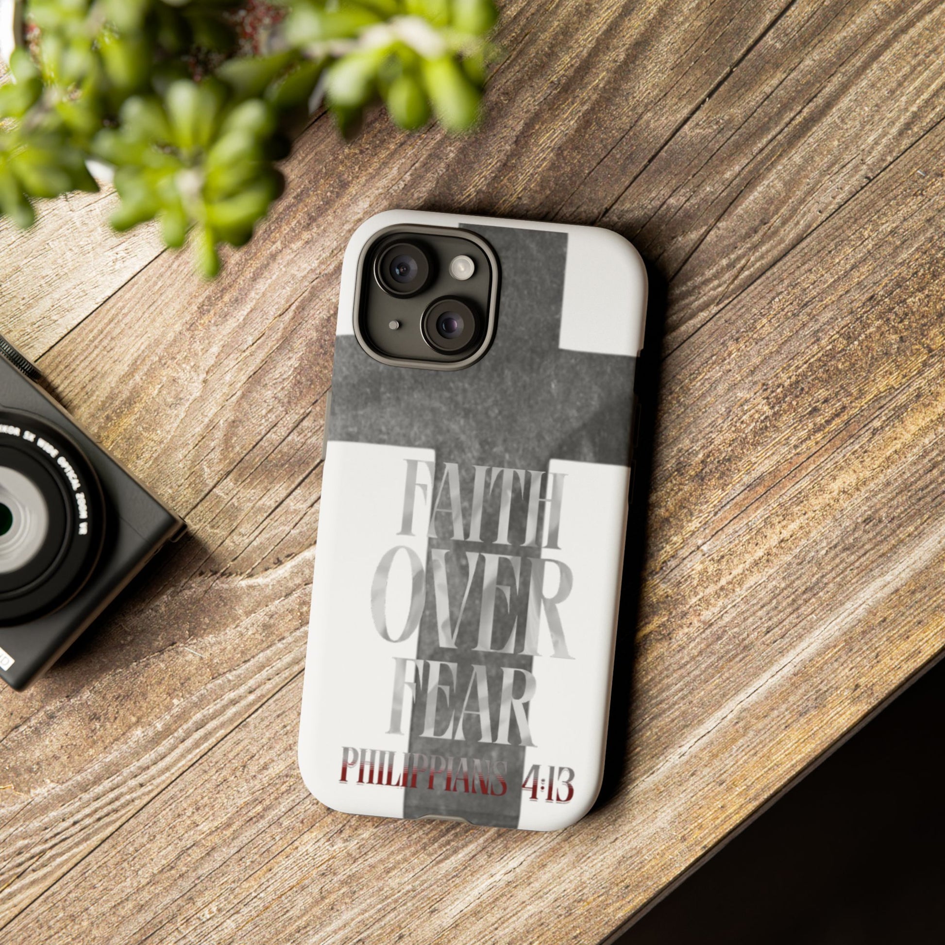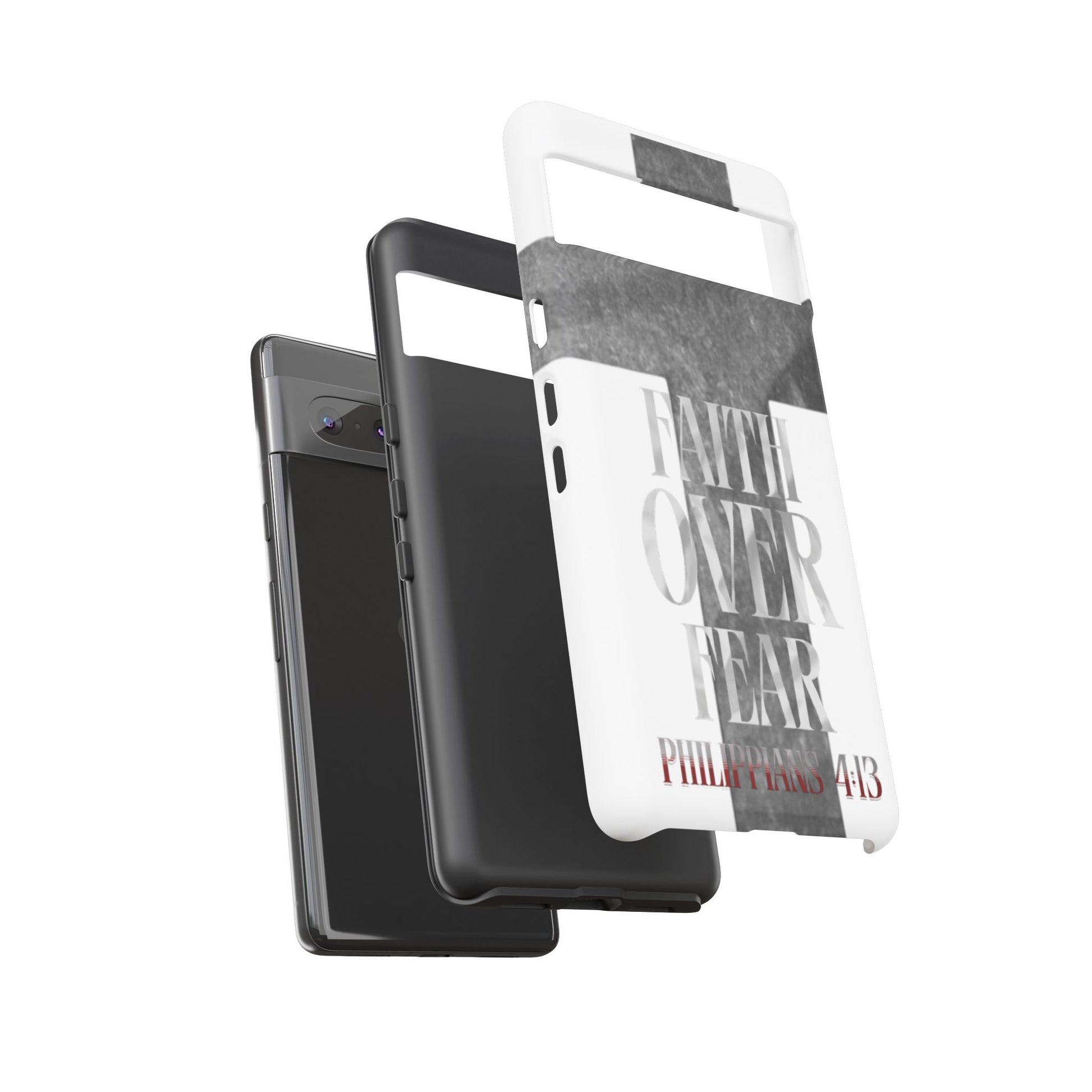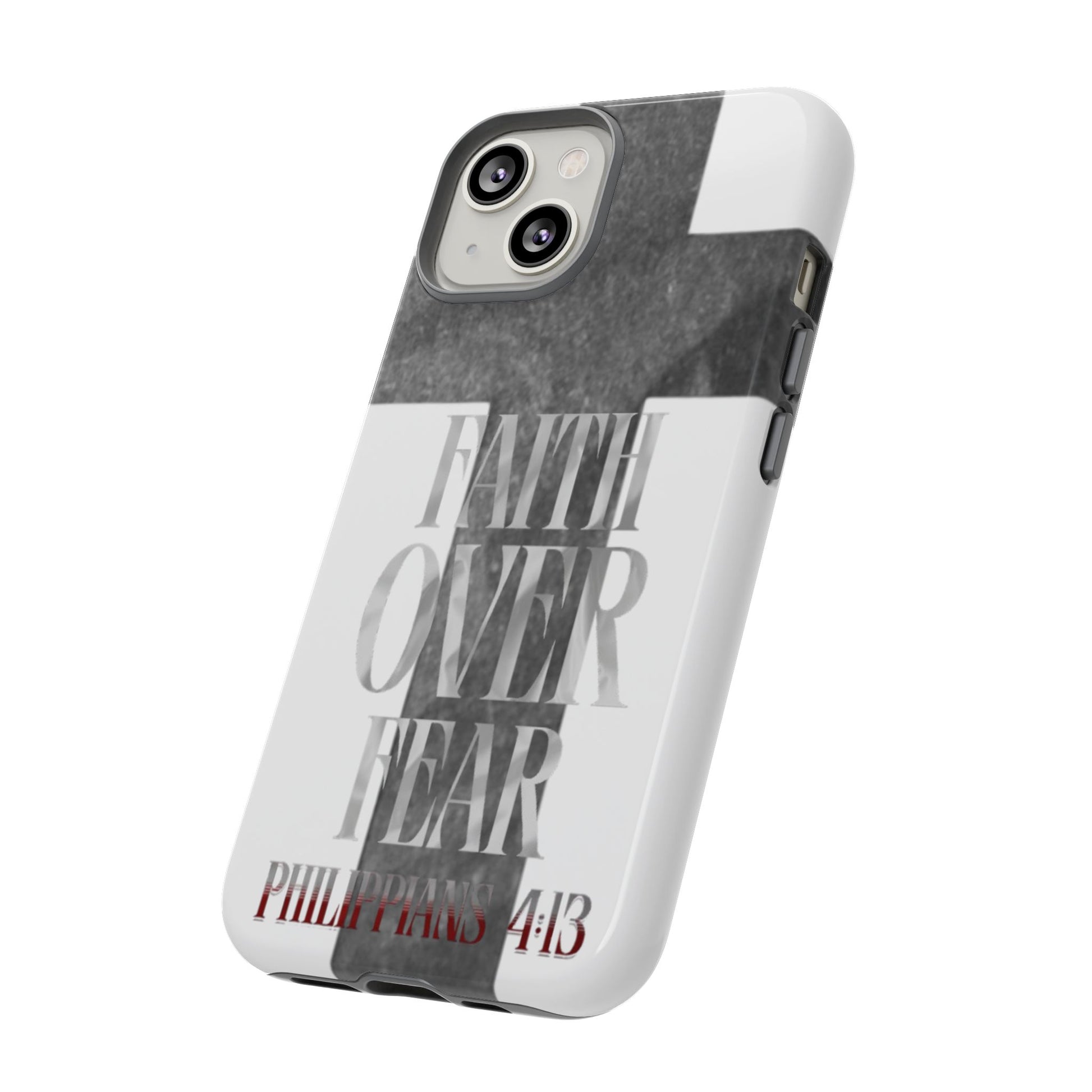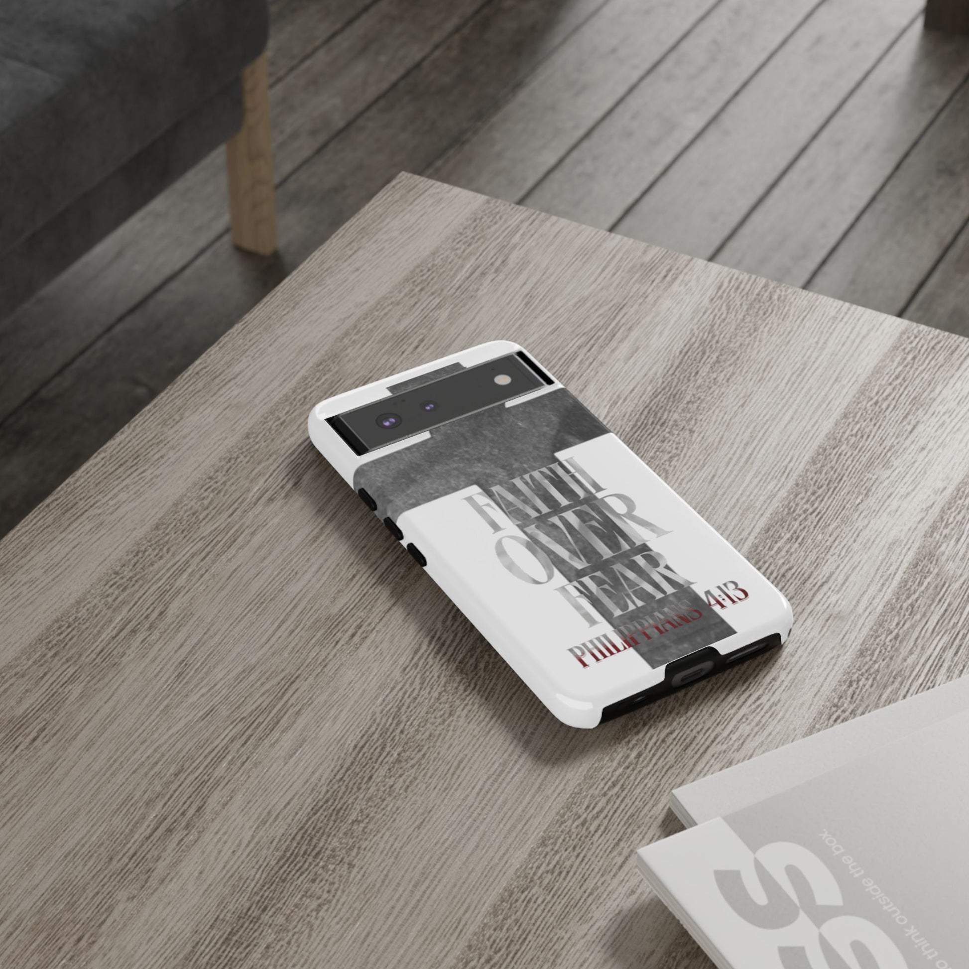 This Phone Case with the design Faith Over Fear on a white background exudes positivity and resilience. Perfect for individuals who value faith and strength in overcoming challenges. Ideal for Christians and spiritual individuals. Relevant for gifts on occasions like birthdays, Christmas, Easter, and as a token of support during tough times.