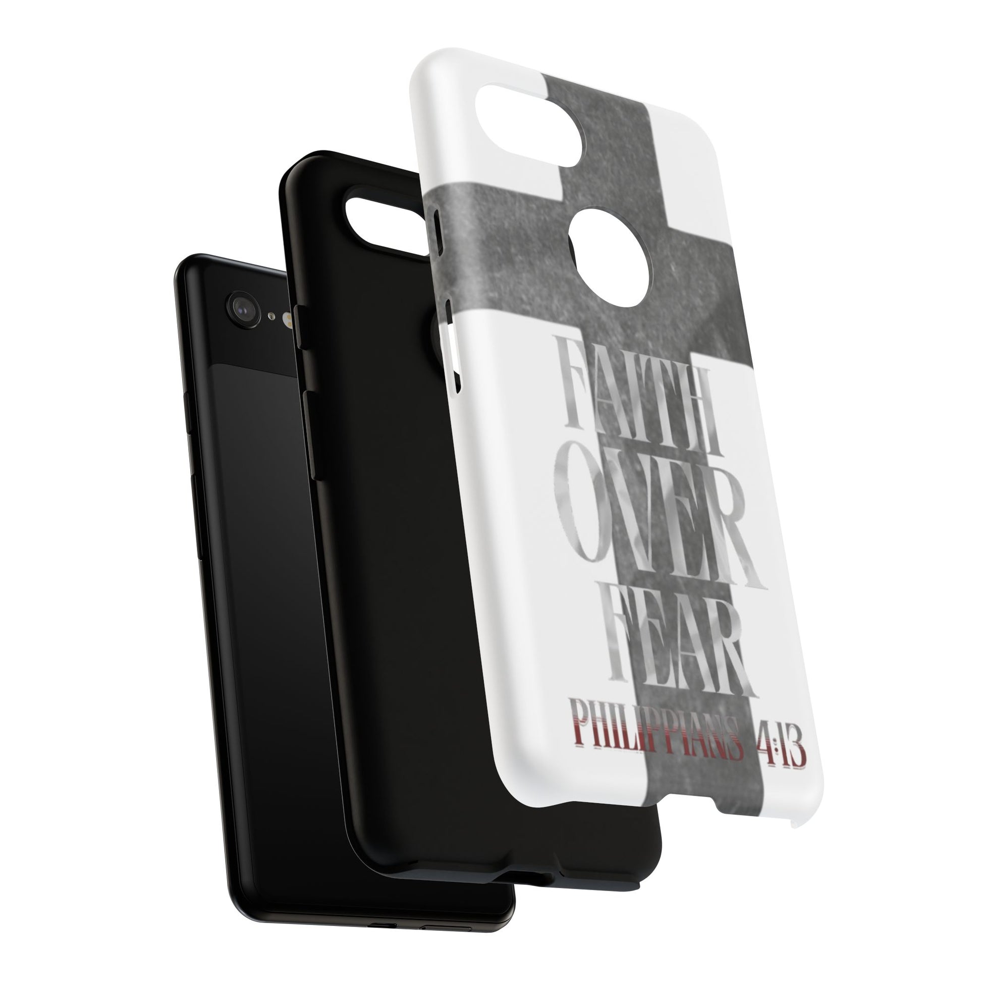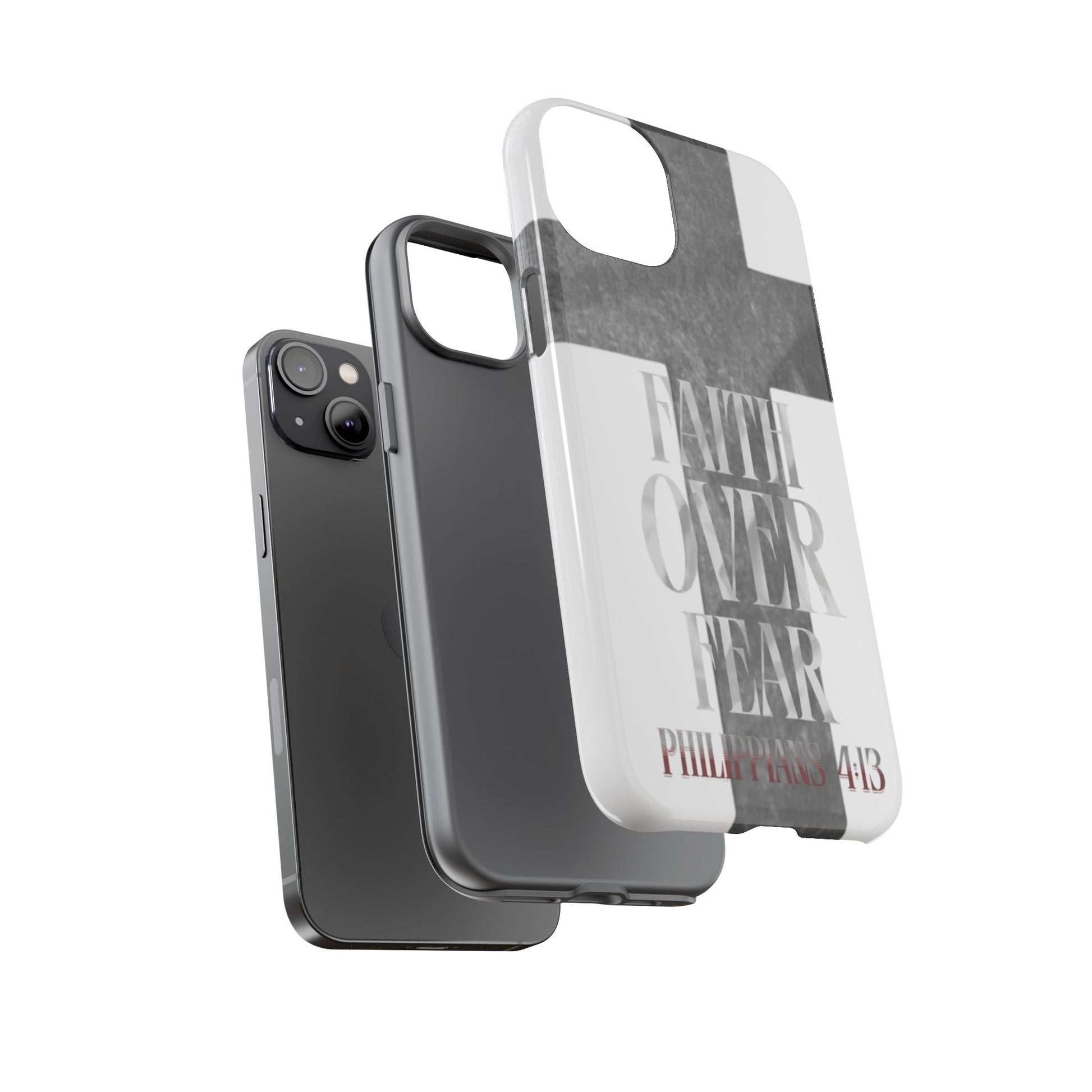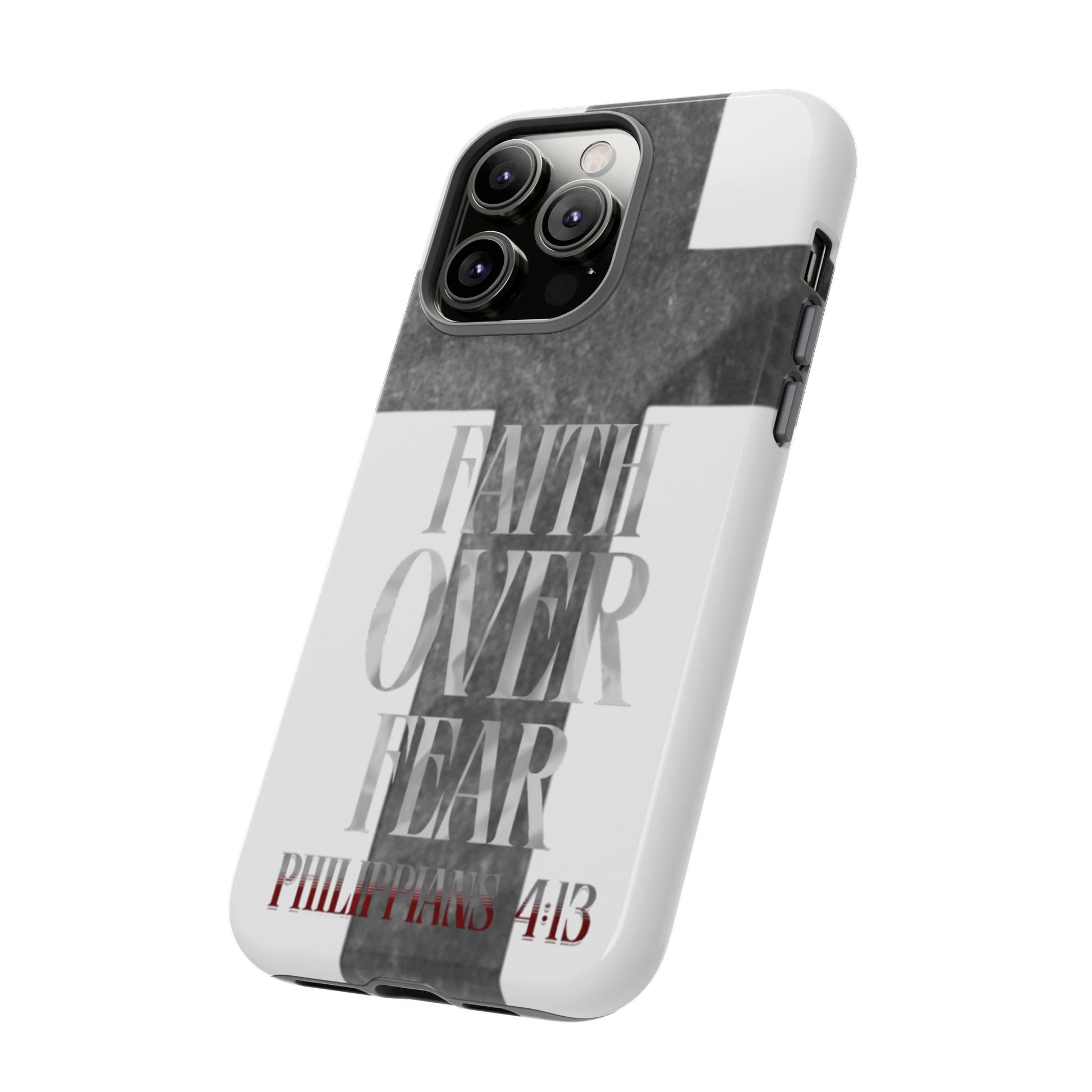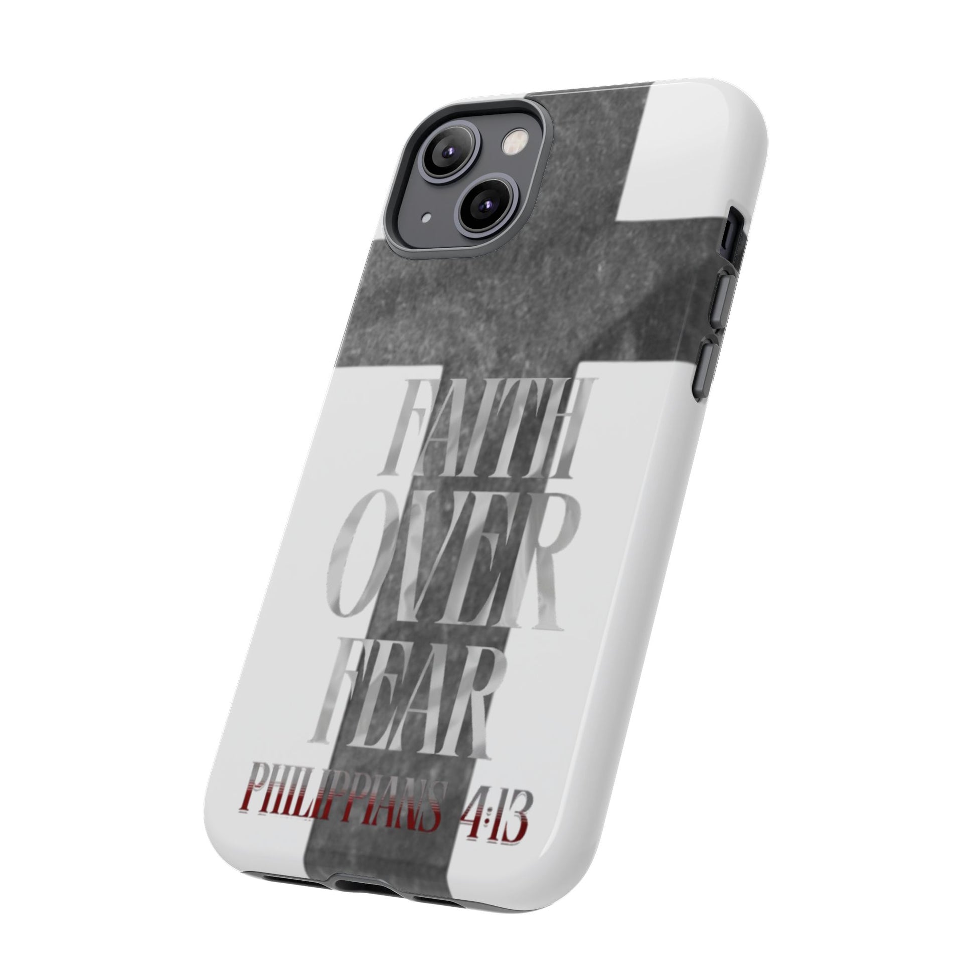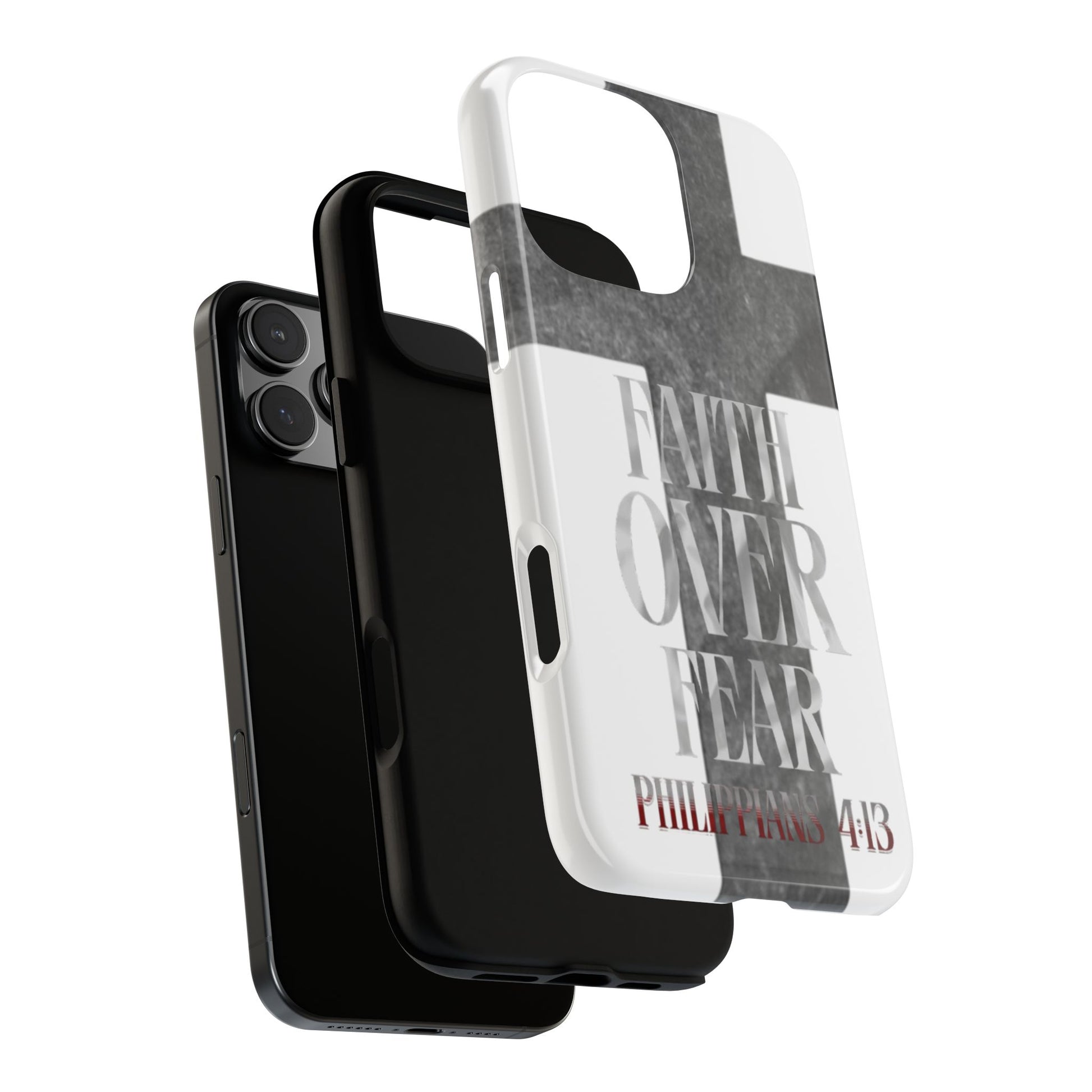 This Phone Case with the design Faith Over Fear on a white background exudes positivity and resilience. Perfect for individuals who value faith and strength in overcoming challenges. Ideal for Christians and spiritual individuals. Relevant for gifts on occasions like birthdays, Christmas, Easter, and as a token of support during tough times.