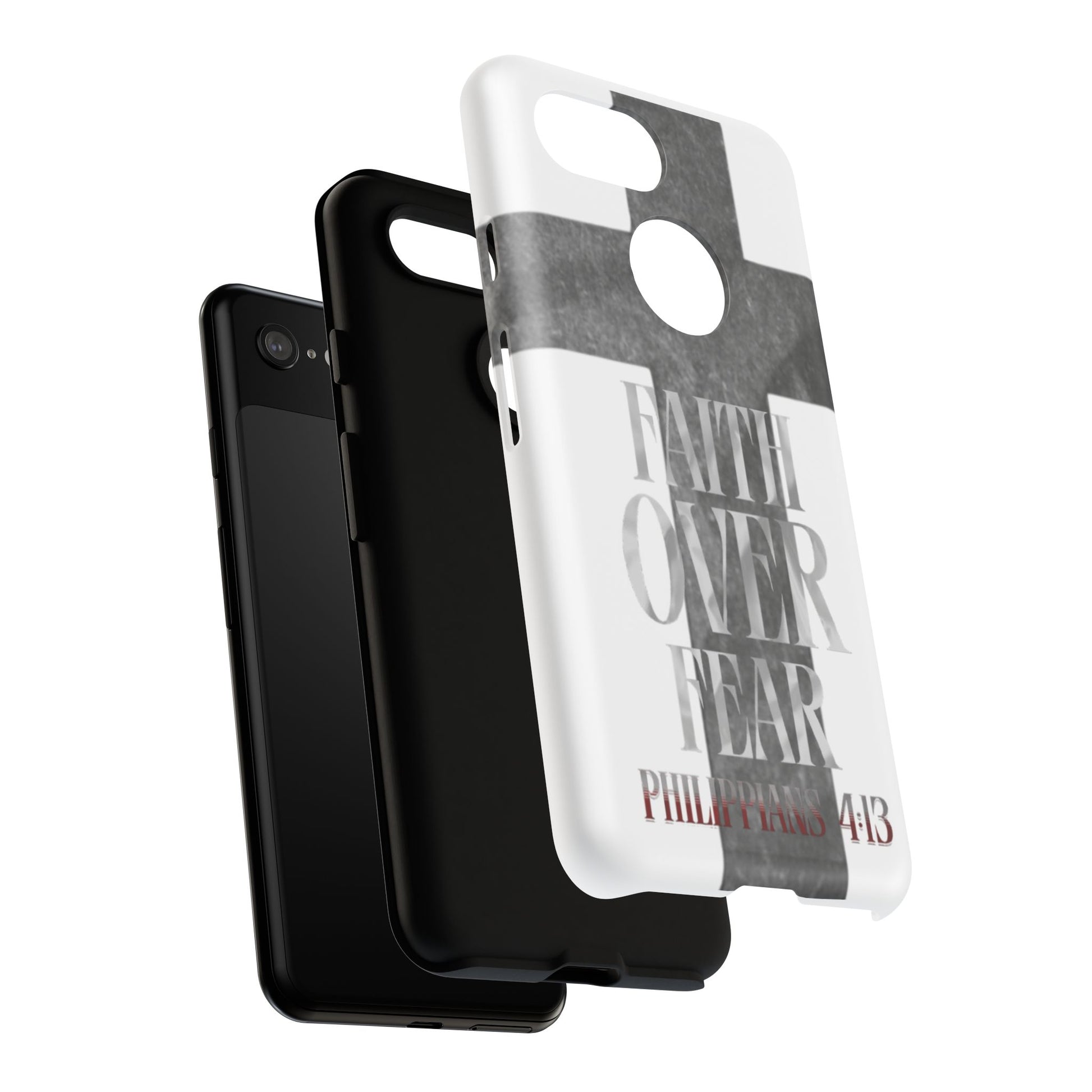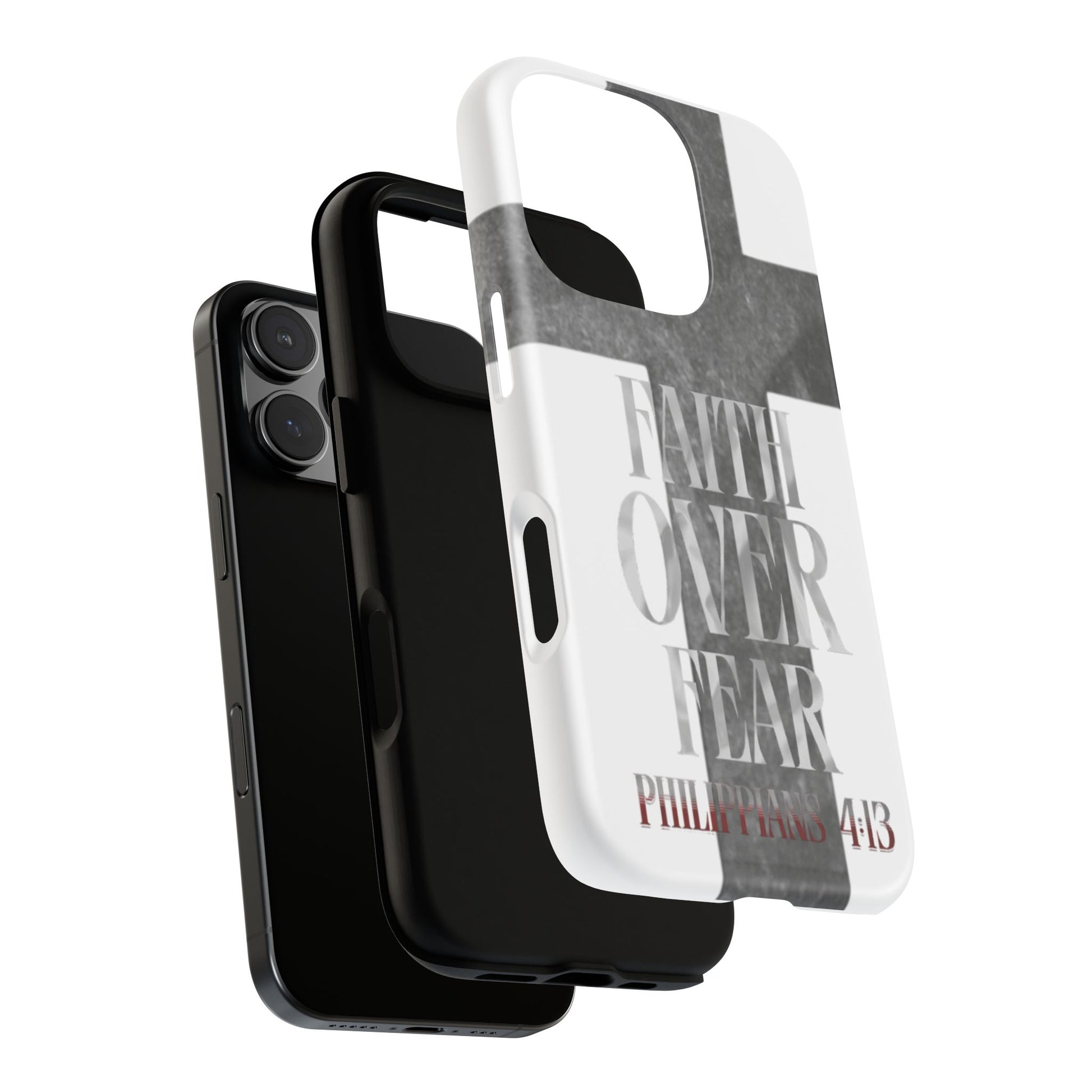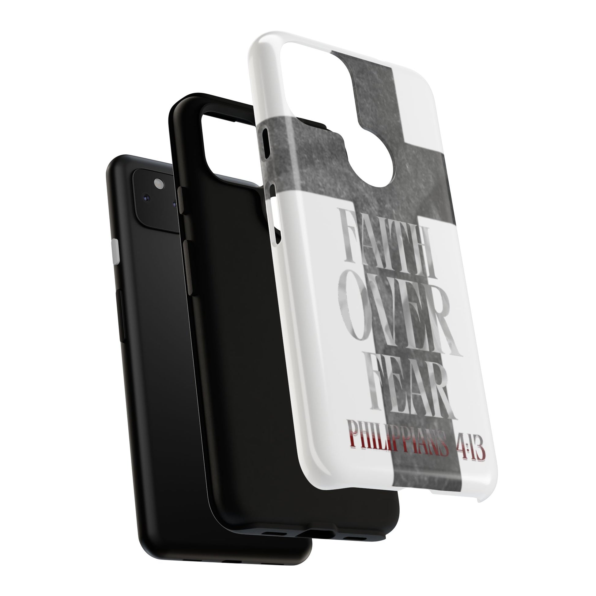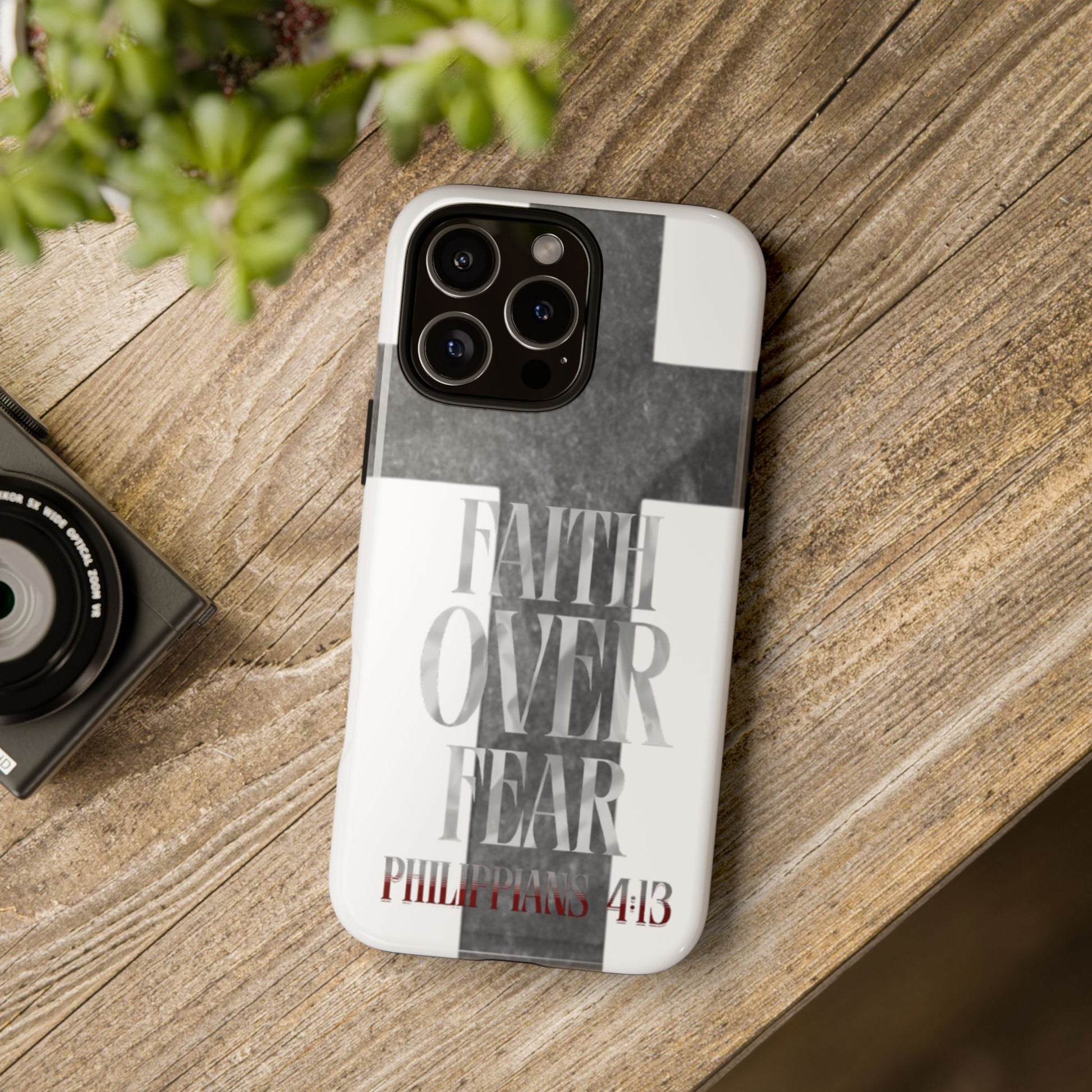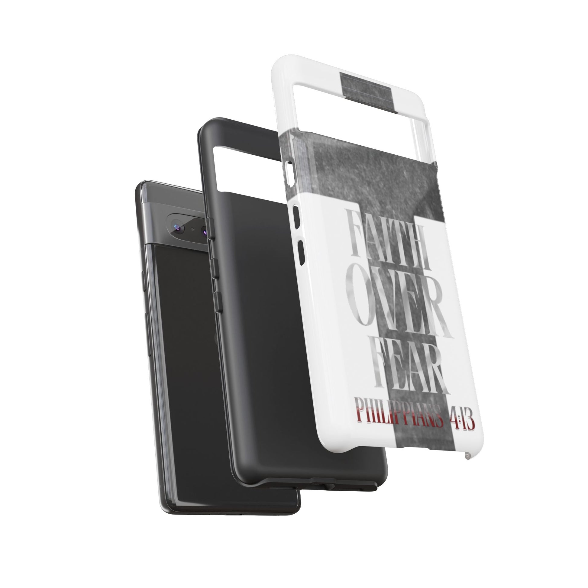 This Phone Case with the design Faith Over Fear on a white background exudes positivity and resilience. Perfect for individuals who value faith and strength in overcoming challenges. Ideal for Christians and spiritual individuals. Relevant for gifts on occasions like birthdays, Christmas, Easter, and as a token of support during tough times.