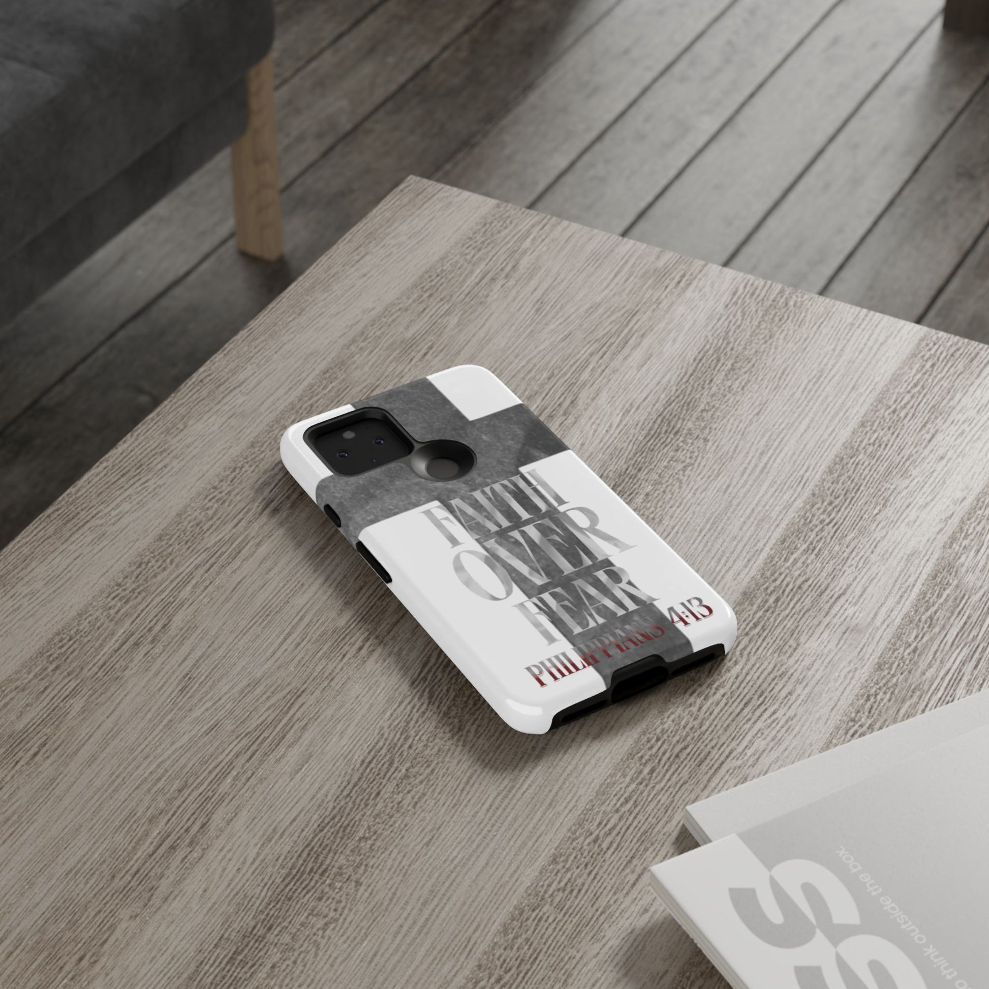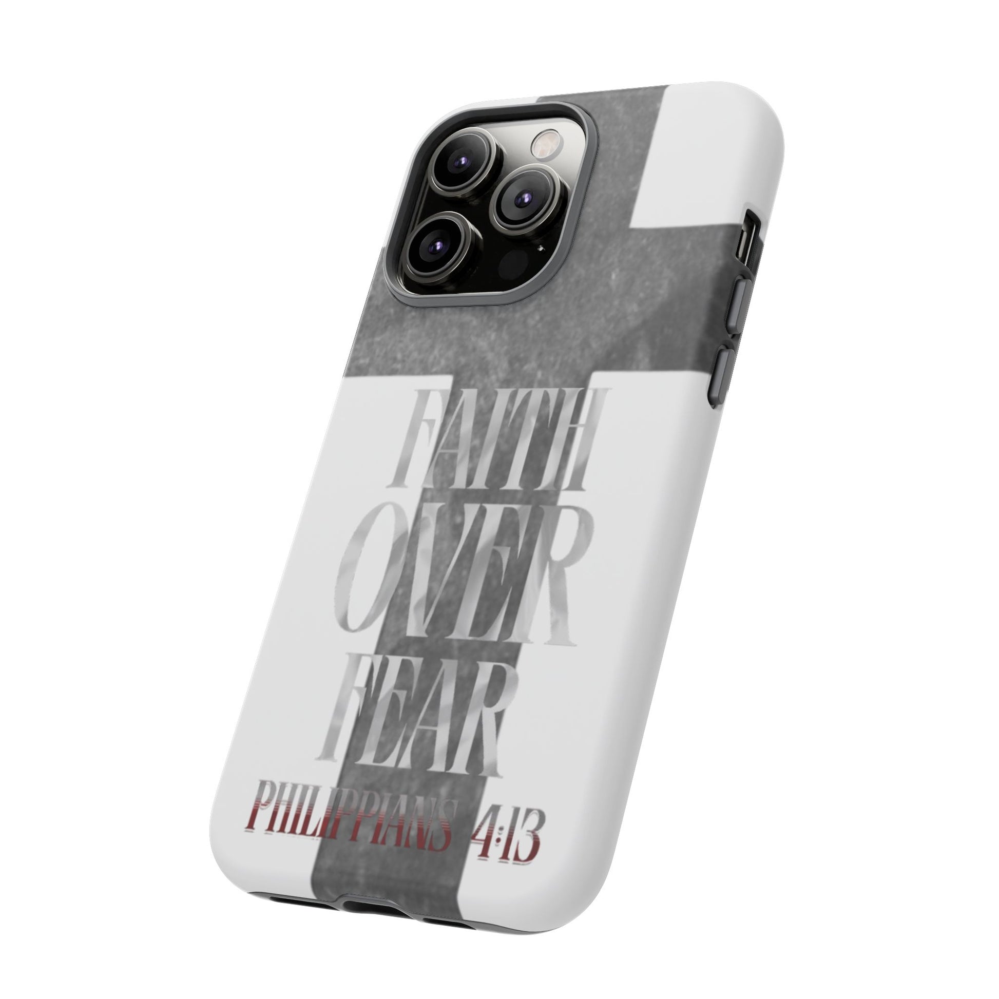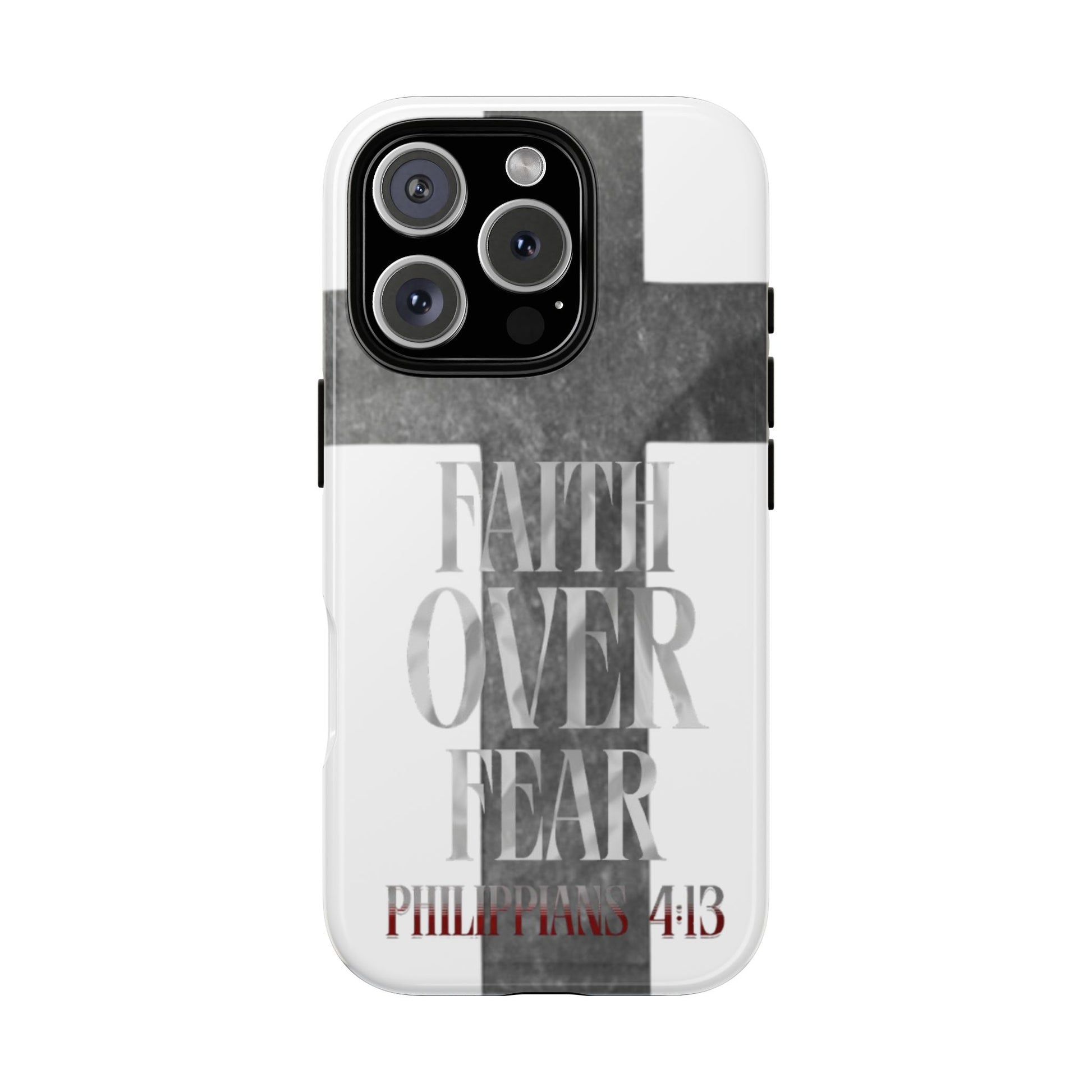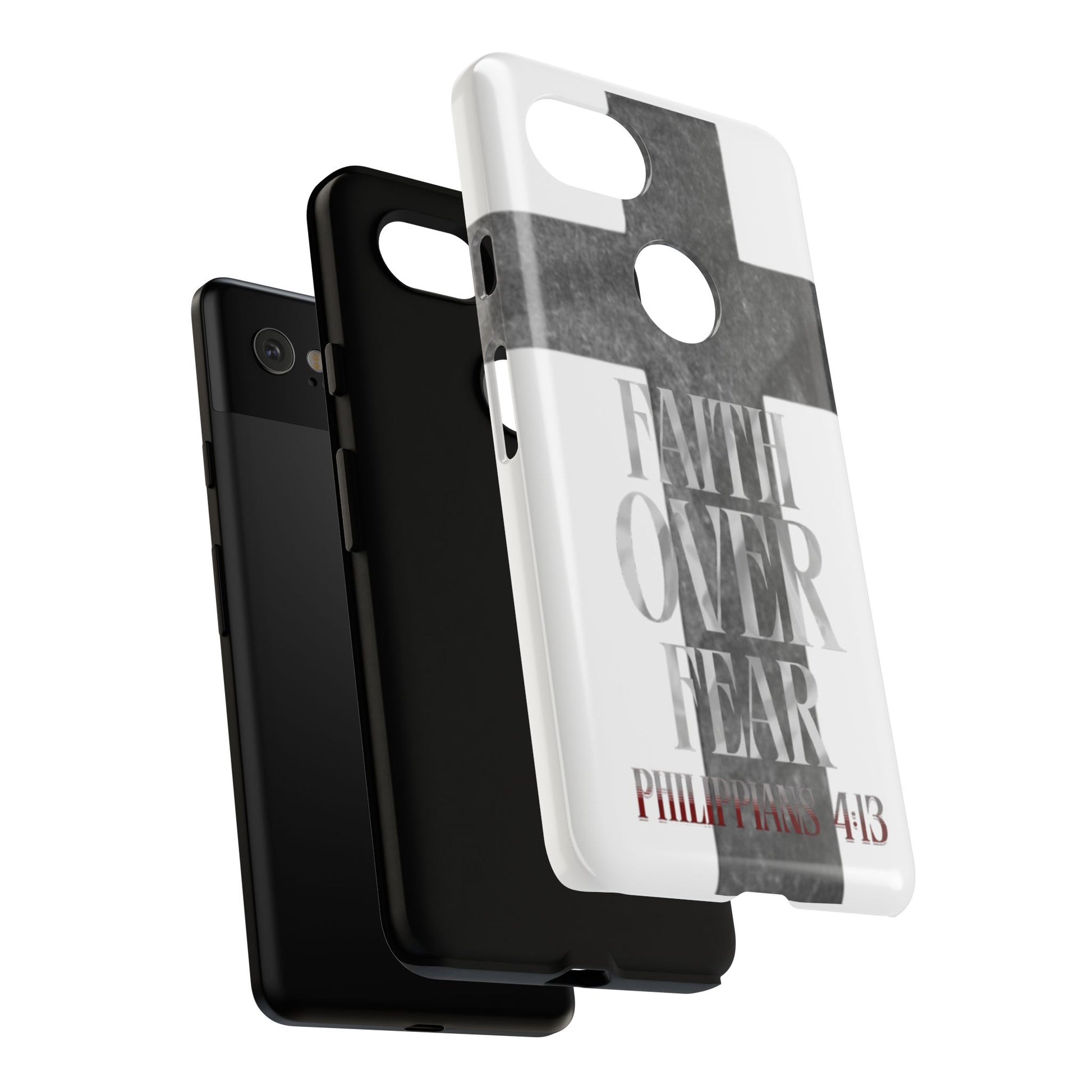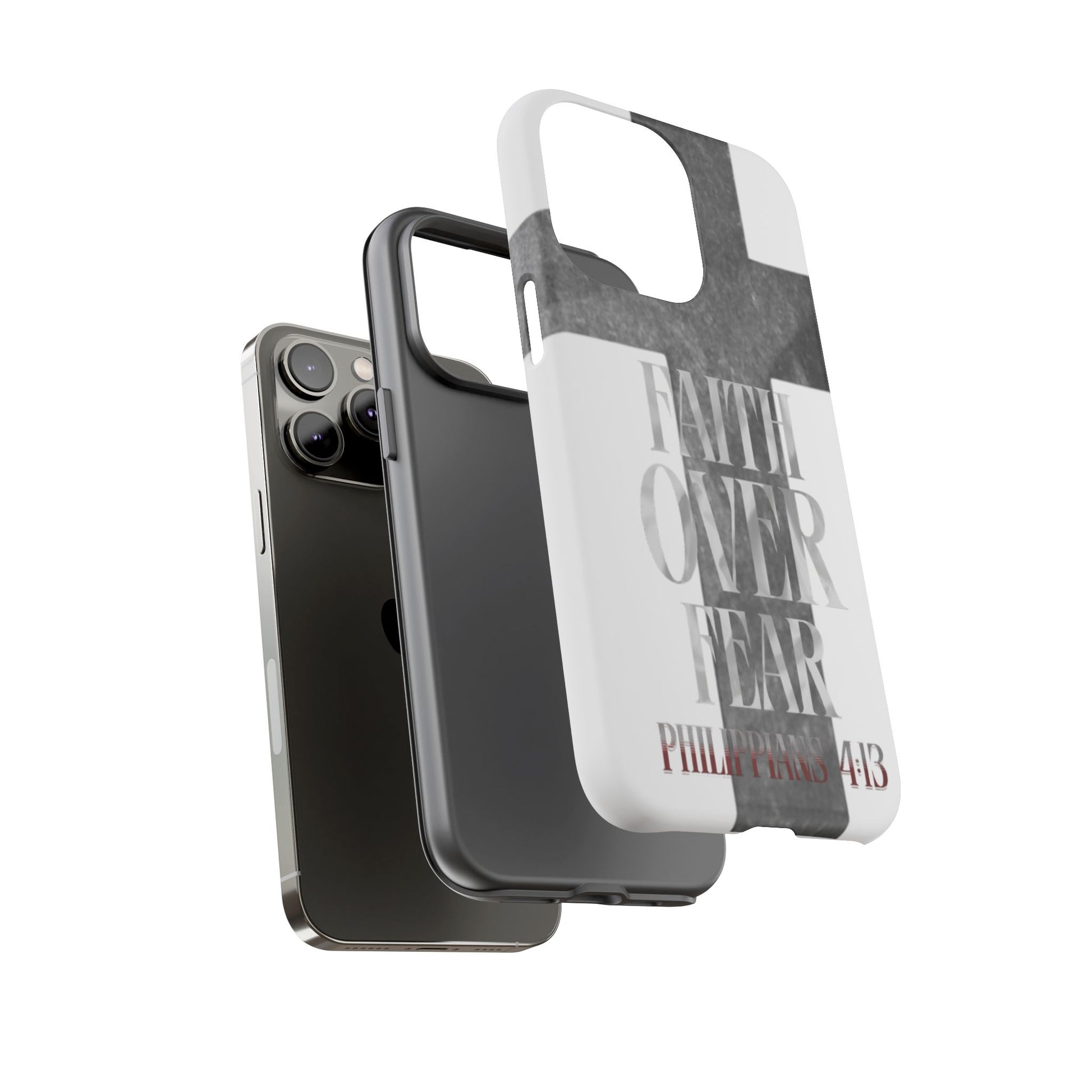 This Phone Case with the design Faith Over Fear on a white background exudes positivity and resilience. Perfect for individuals who value faith and strength in overcoming challenges. Ideal for Christians and spiritual individuals. Relevant for gifts on occasions like birthdays, Christmas, Easter, and as a token of support during tough times.