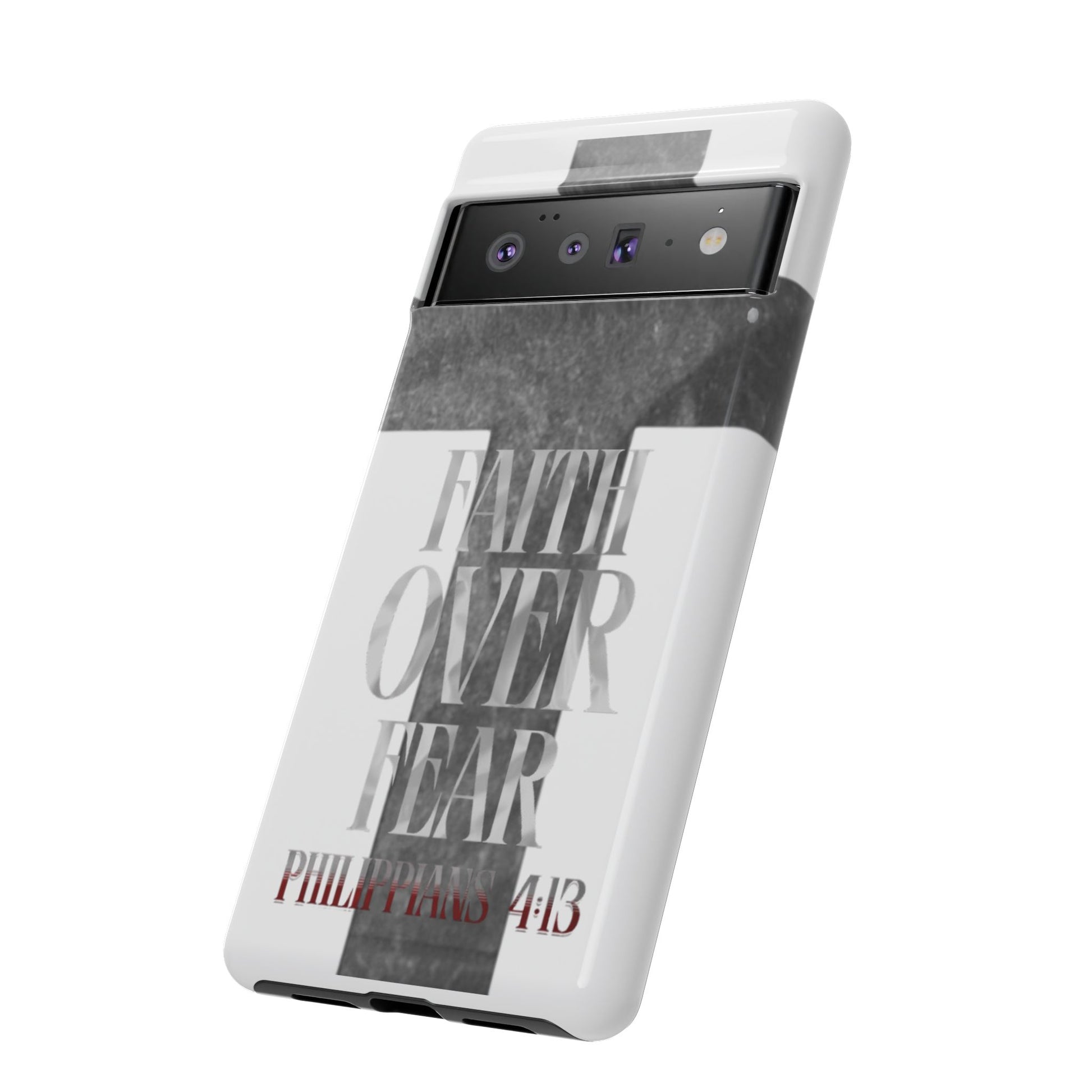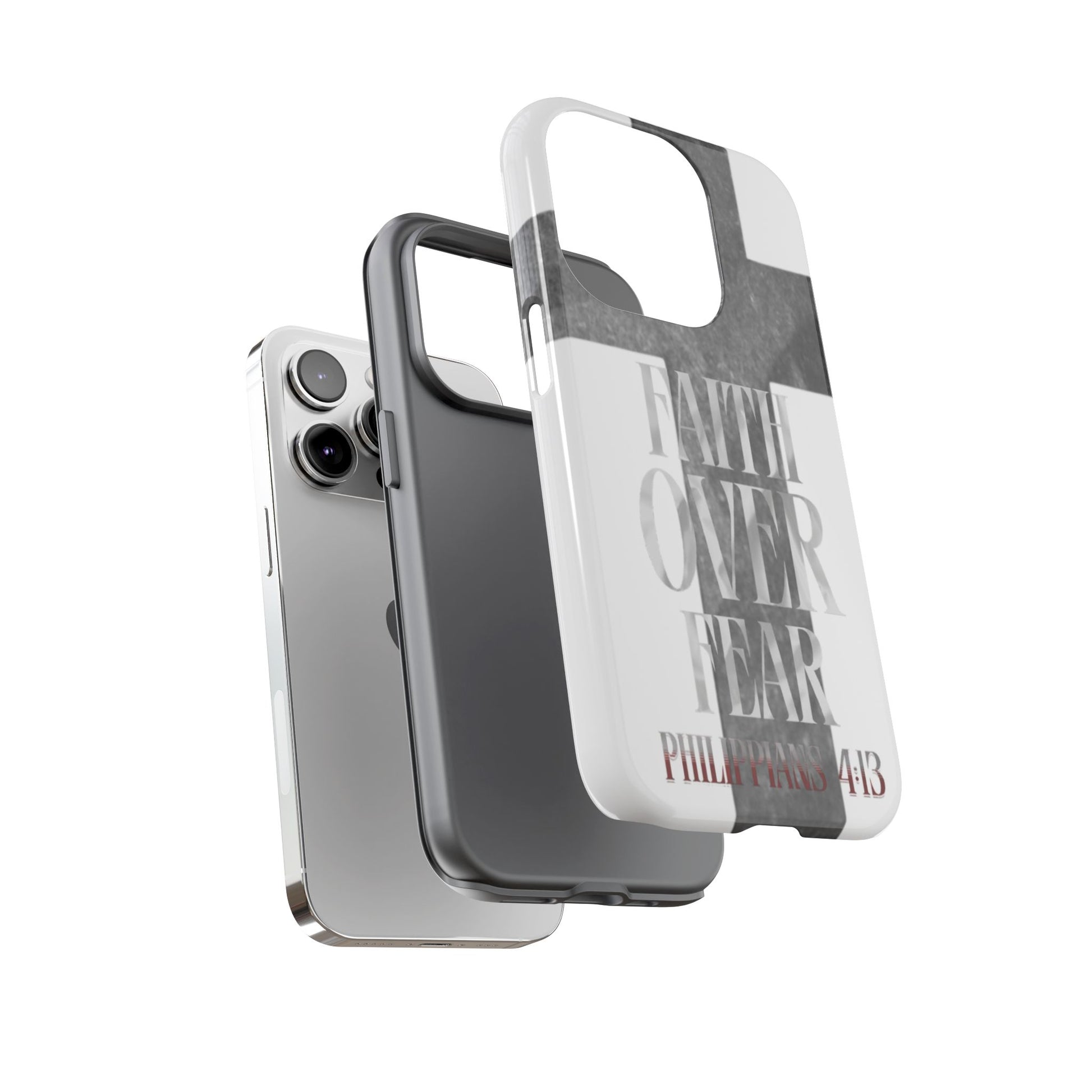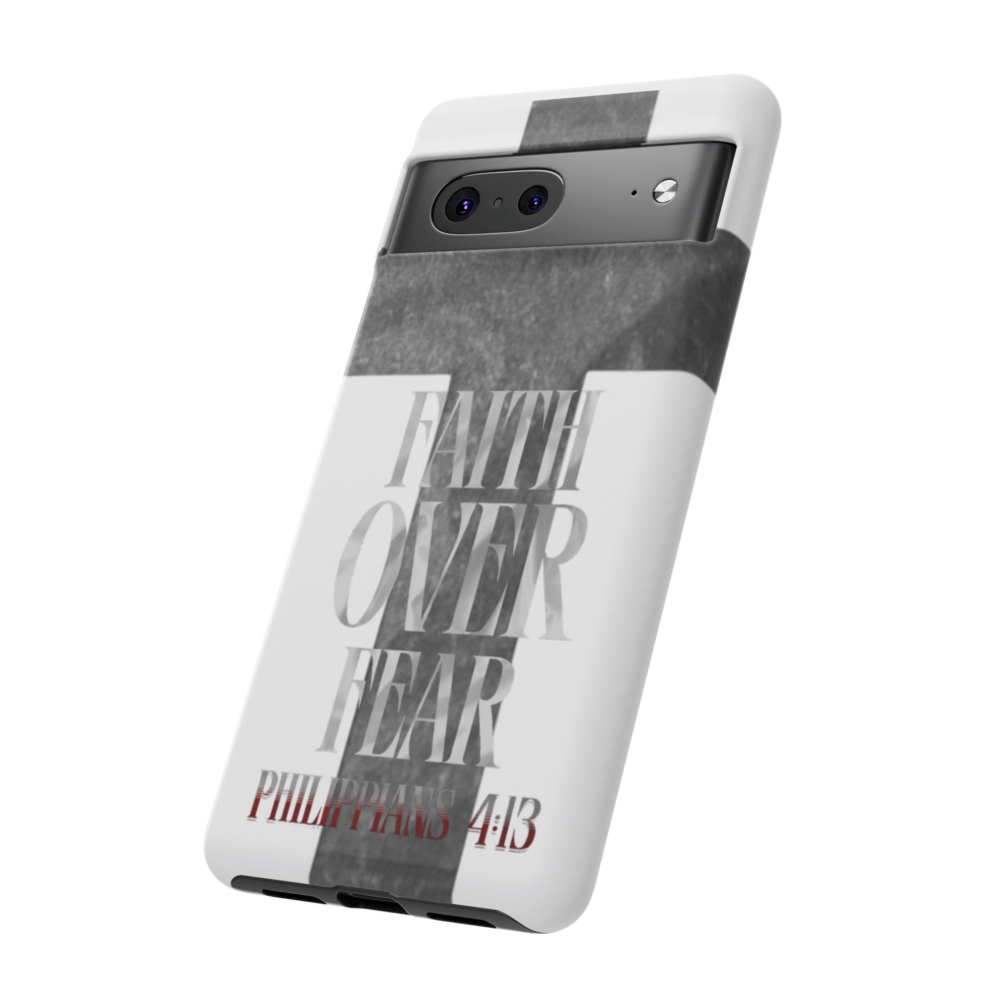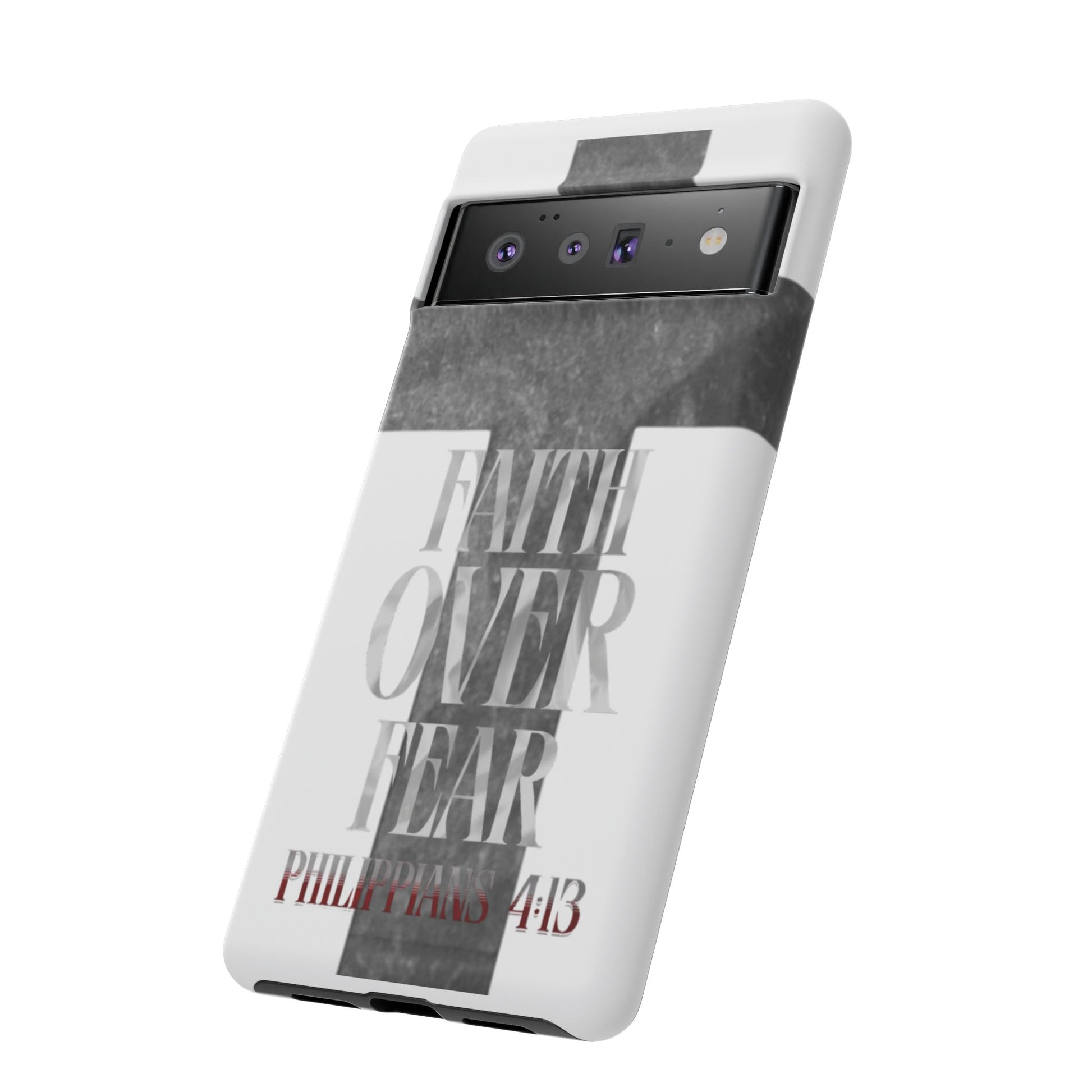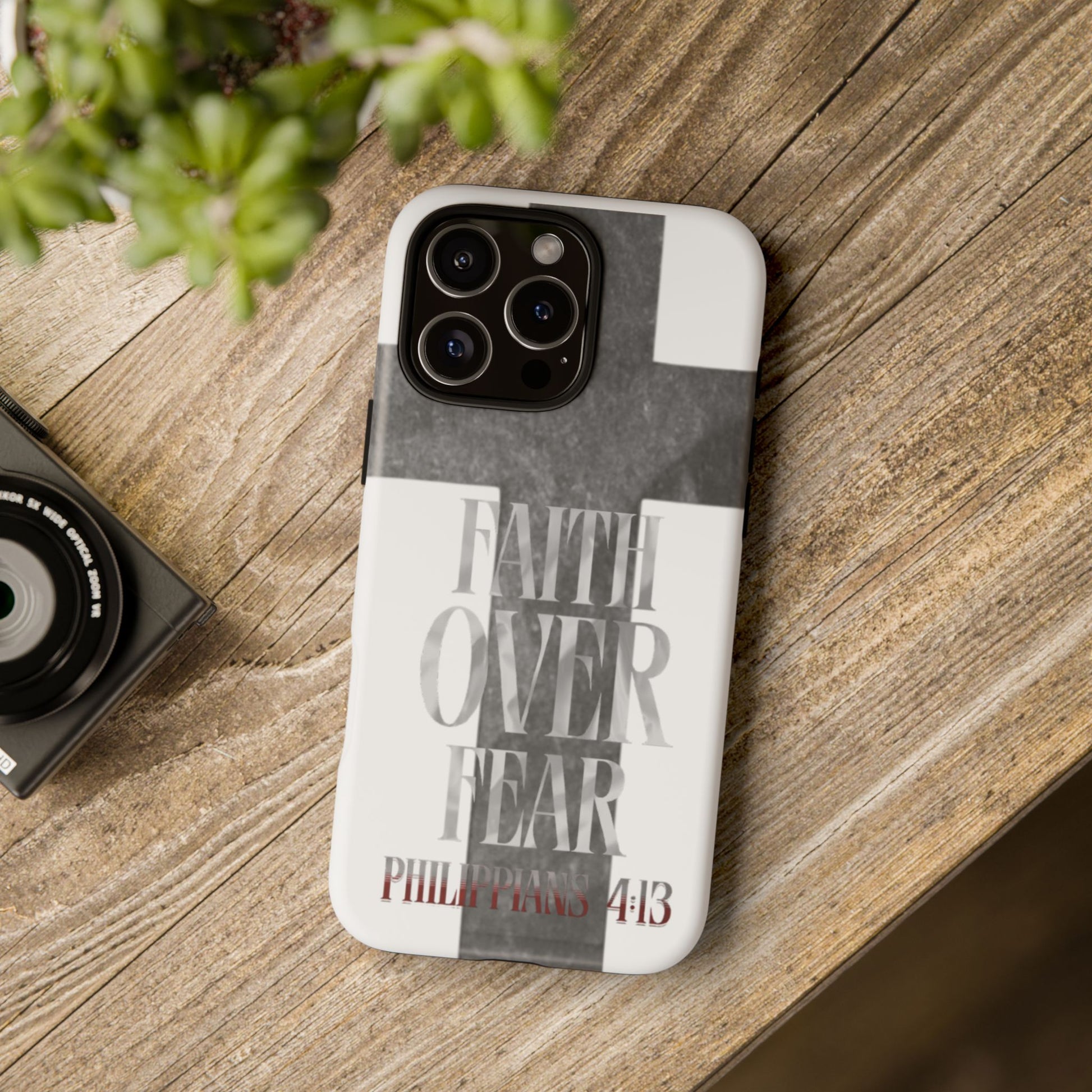 This Phone Case with the design Faith Over Fear on a white background exudes positivity and resilience. Perfect for individuals who value faith and strength in overcoming challenges. Ideal for Christians and spiritual individuals. Relevant for gifts on occasions like birthdays, Christmas, Easter, and as a token of support during tough times.