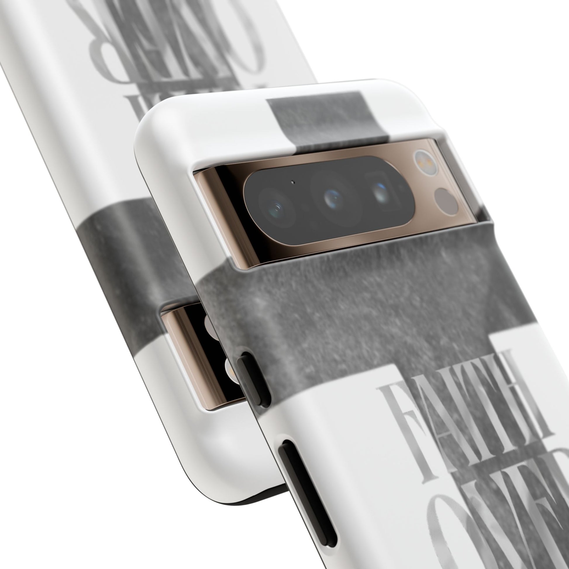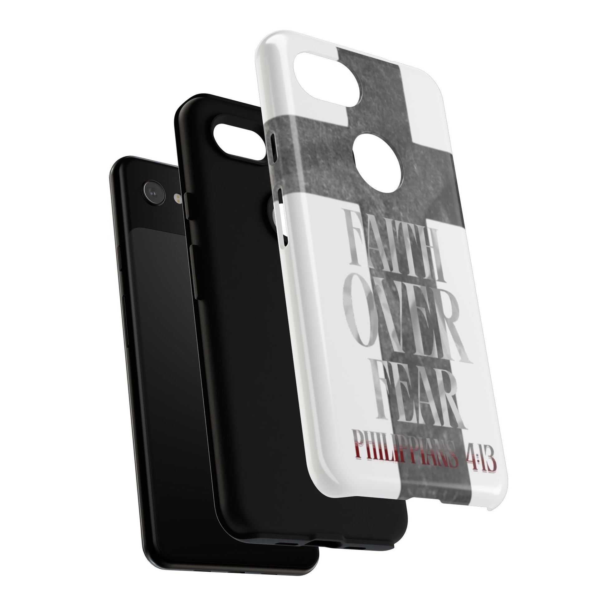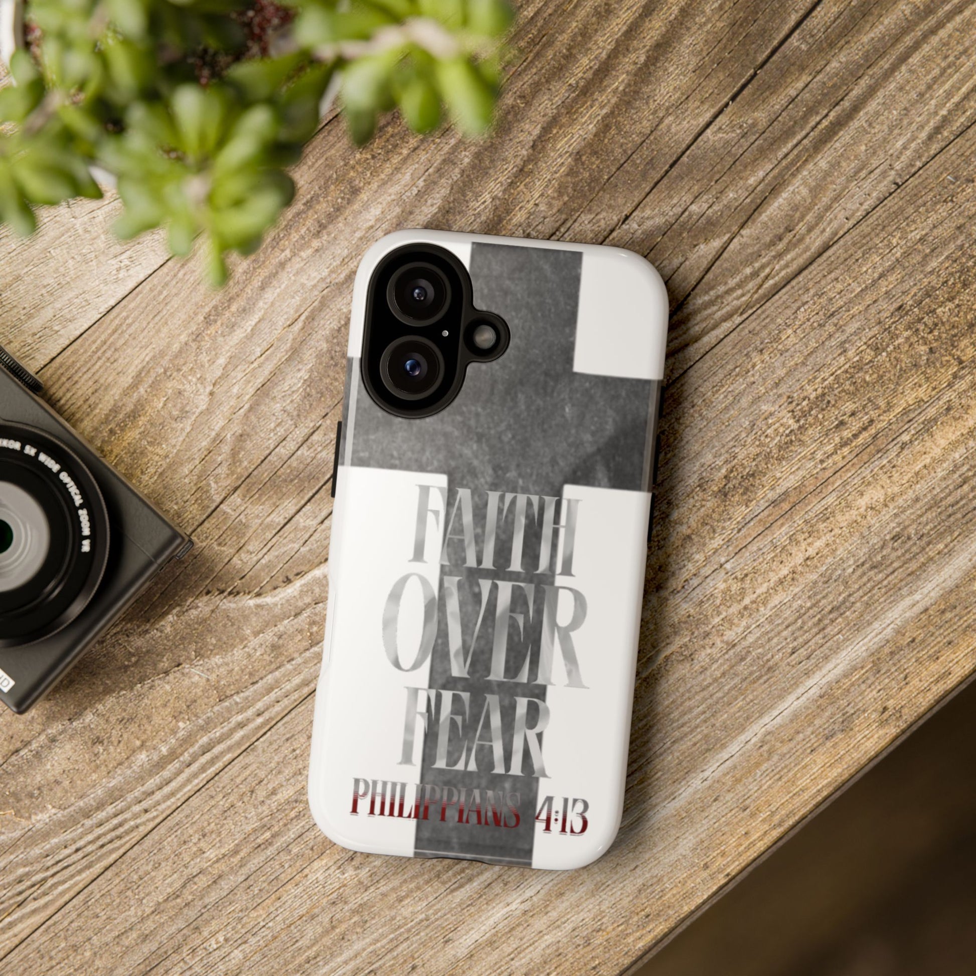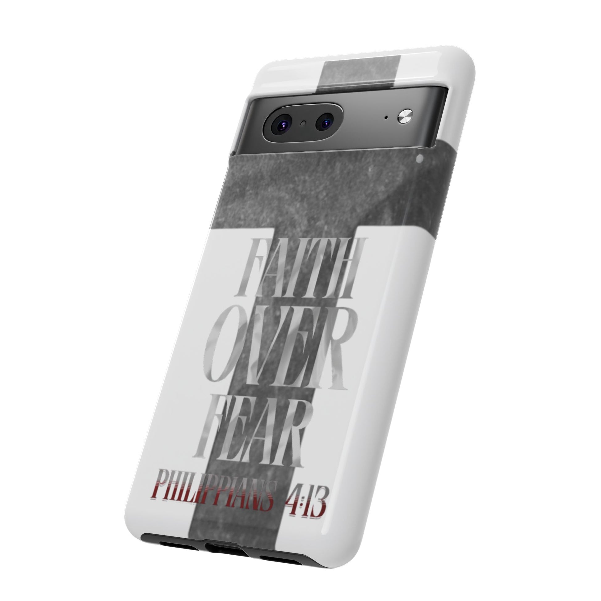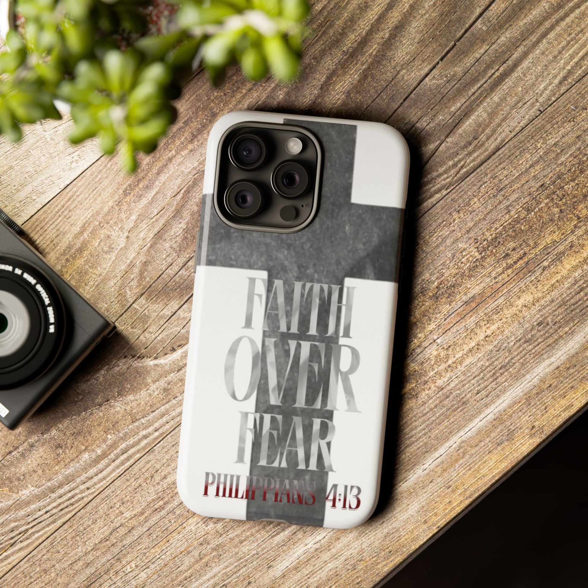 This Phone Case with the design Faith Over Fear on a white background exudes positivity and resilience. Perfect for individuals who value faith and strength in overcoming challenges. Ideal for Christians and spiritual individuals. Relevant for gifts on occasions like birthdays, Christmas, Easter, and as a token of support during tough times.