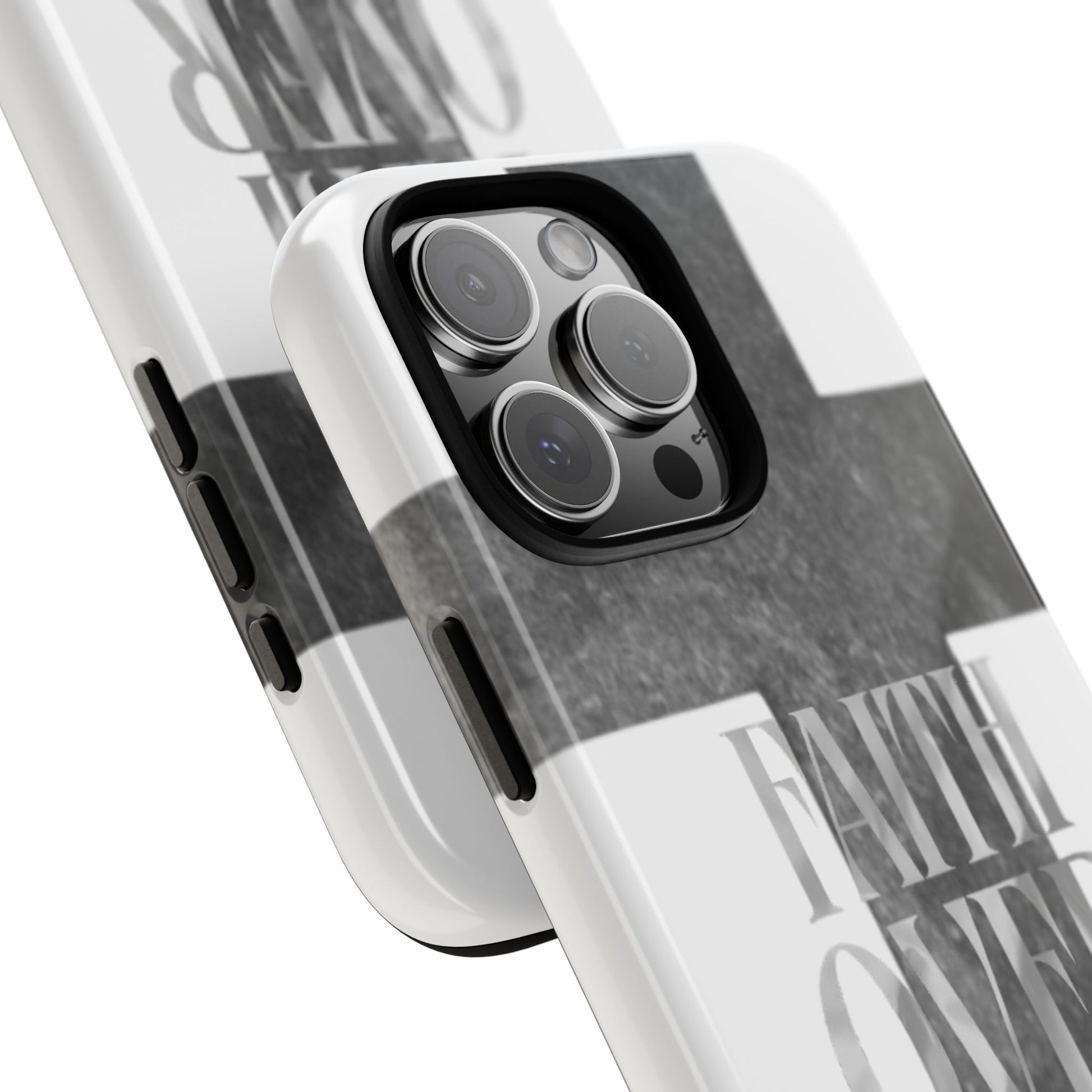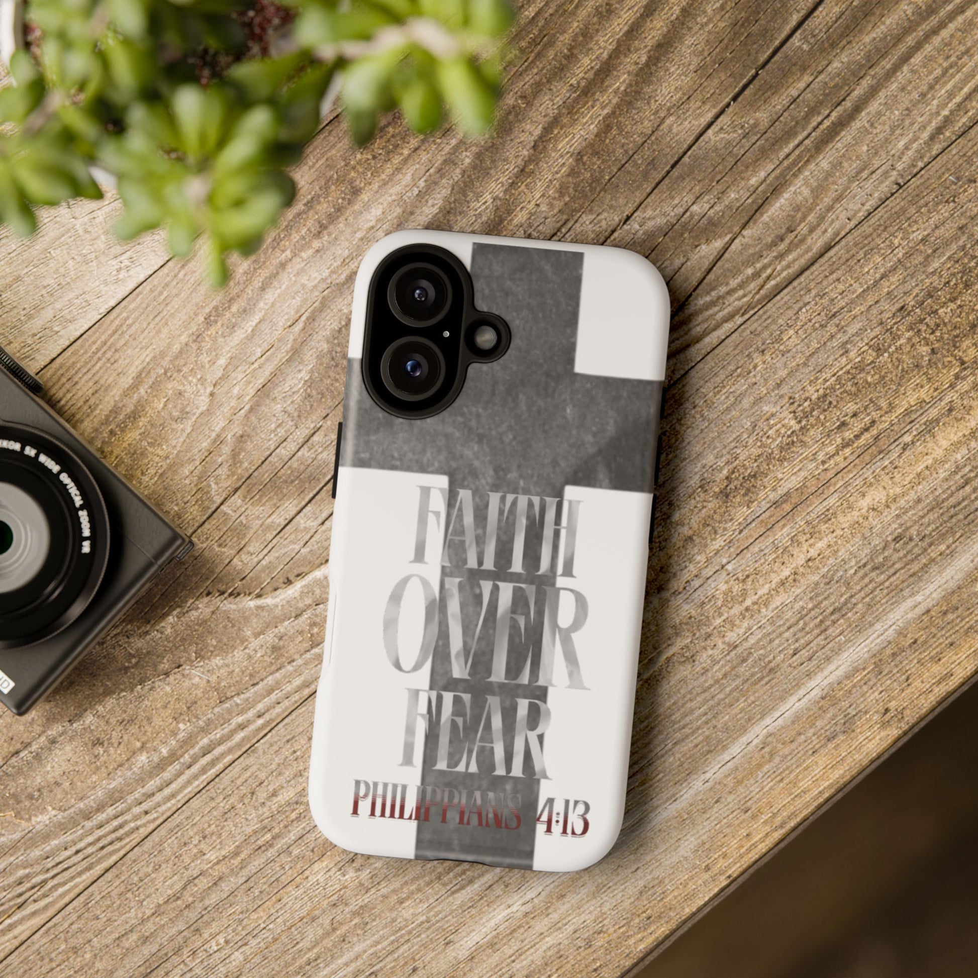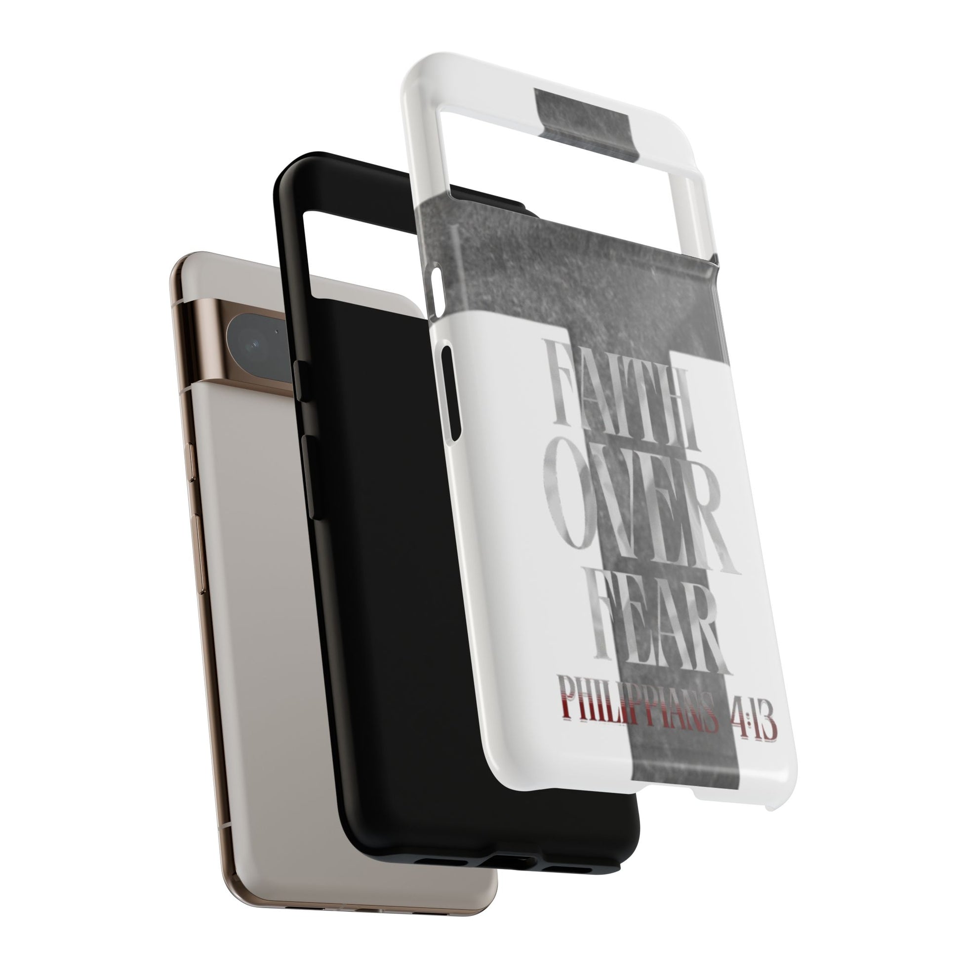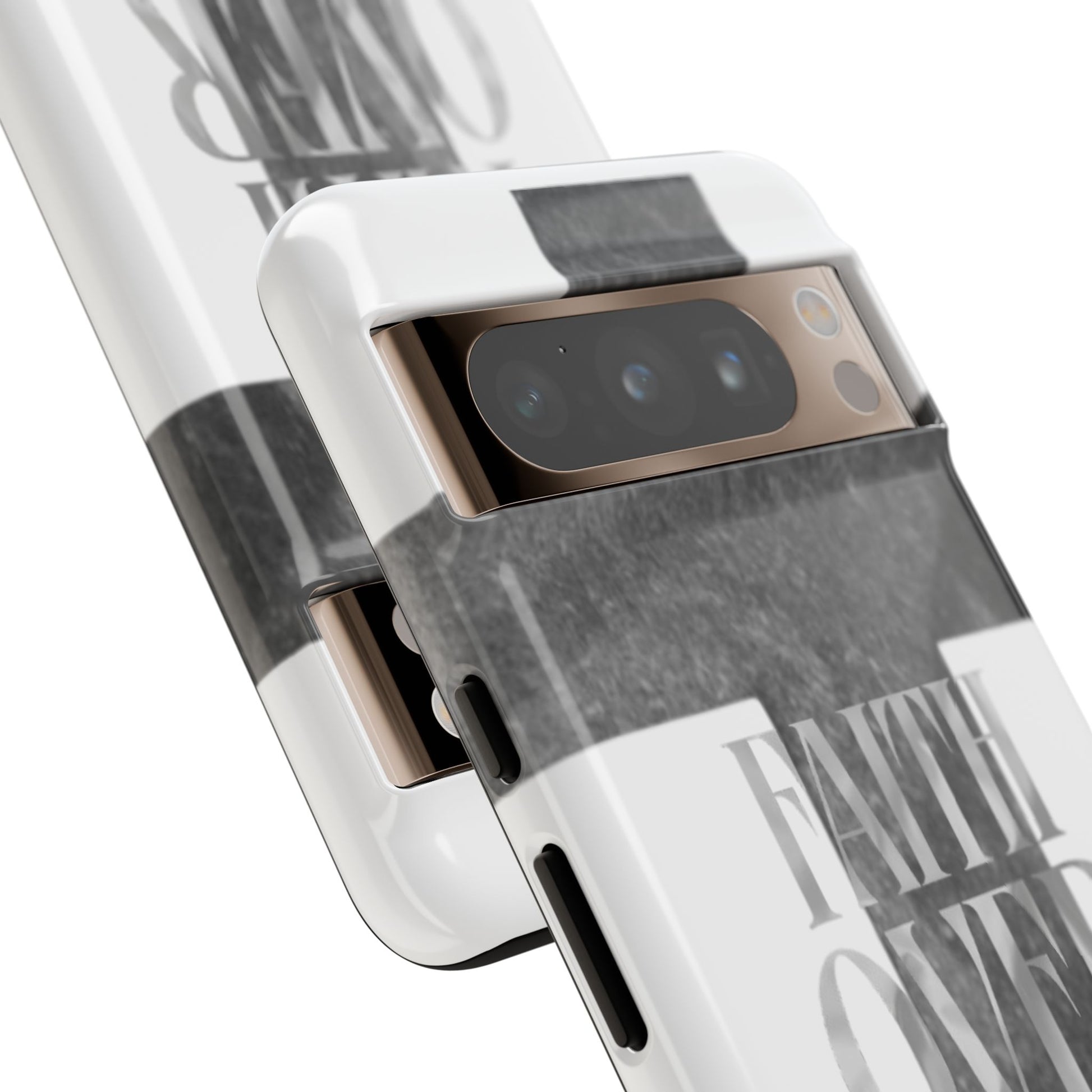 This Phone Case with the design Faith Over Fear on a white background exudes positivity and resilience. Perfect for individuals who value faith and strength in overcoming challenges. Ideal for Christians and spiritual individuals. Relevant for gifts on occasions like birthdays, Christmas, Easter, and as a token of support during tough times.