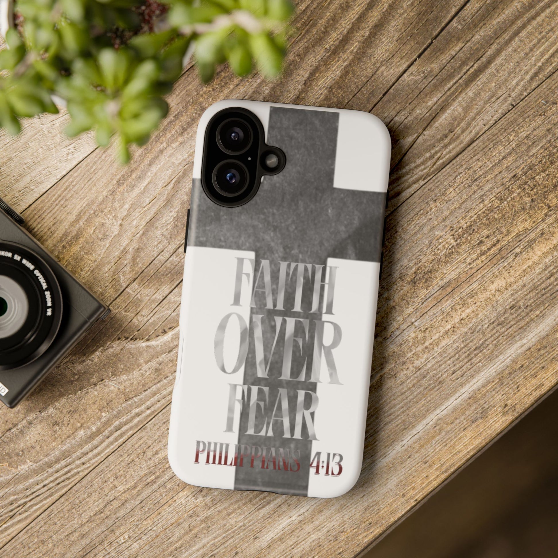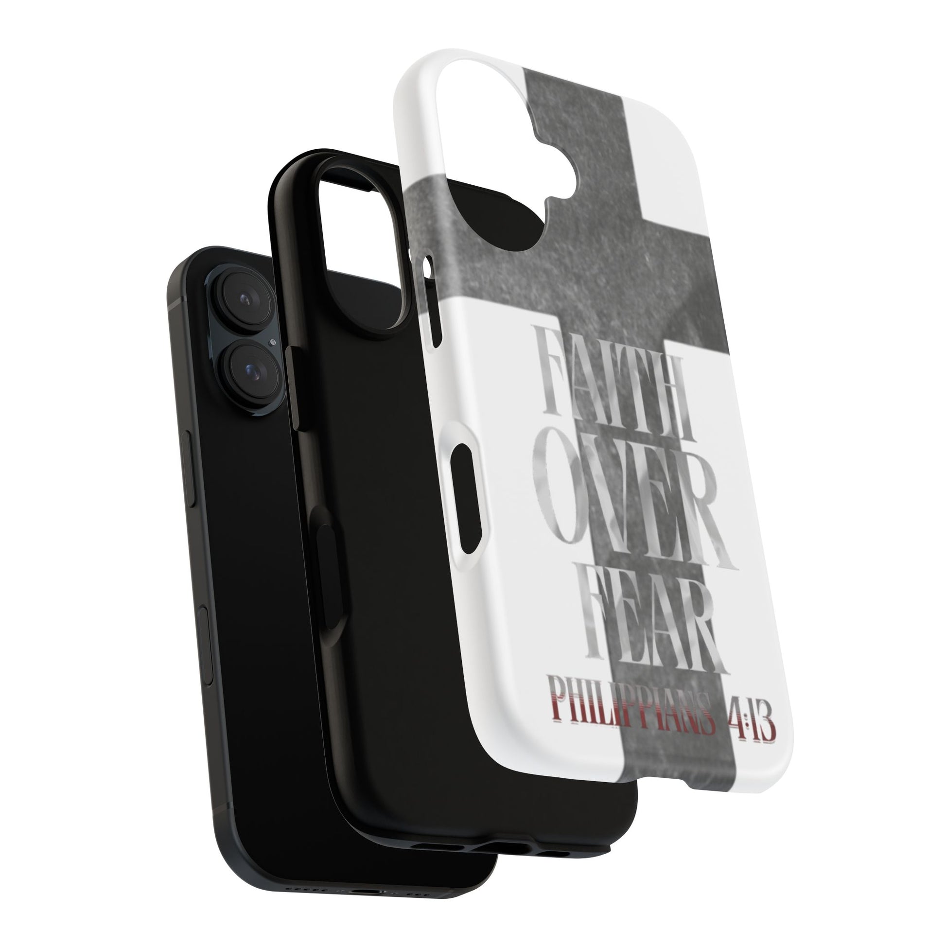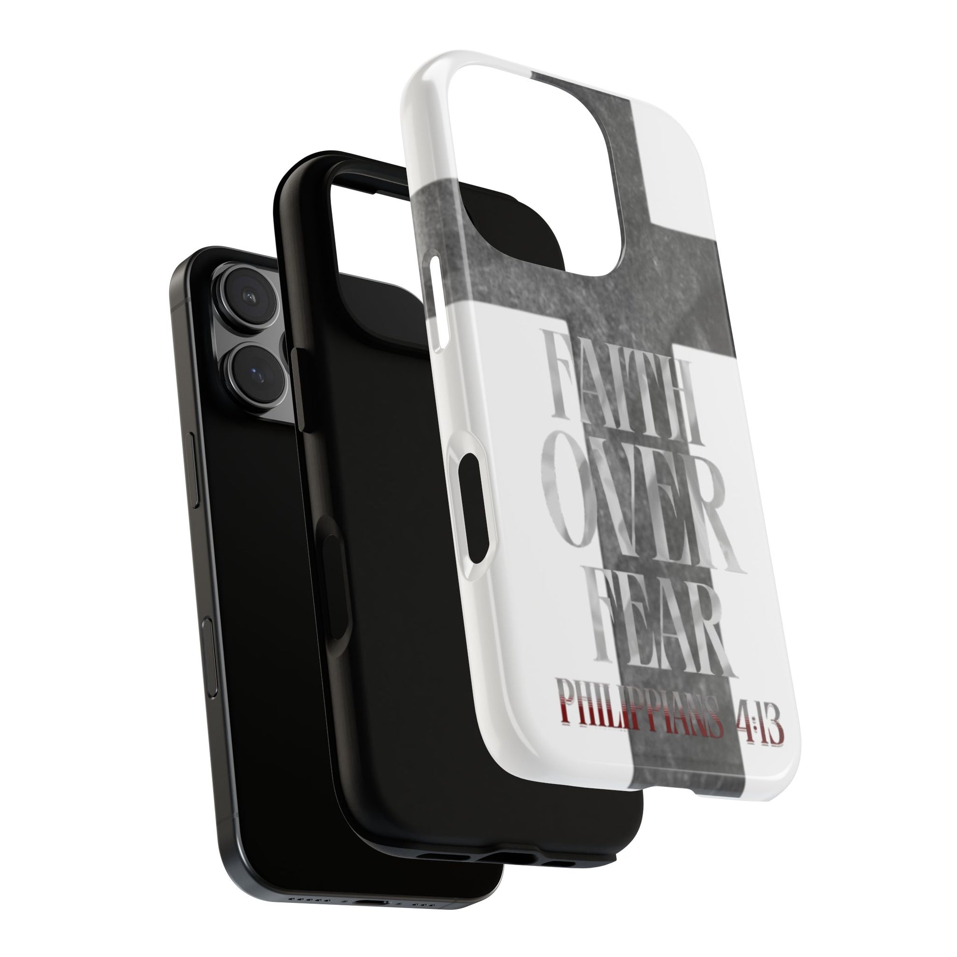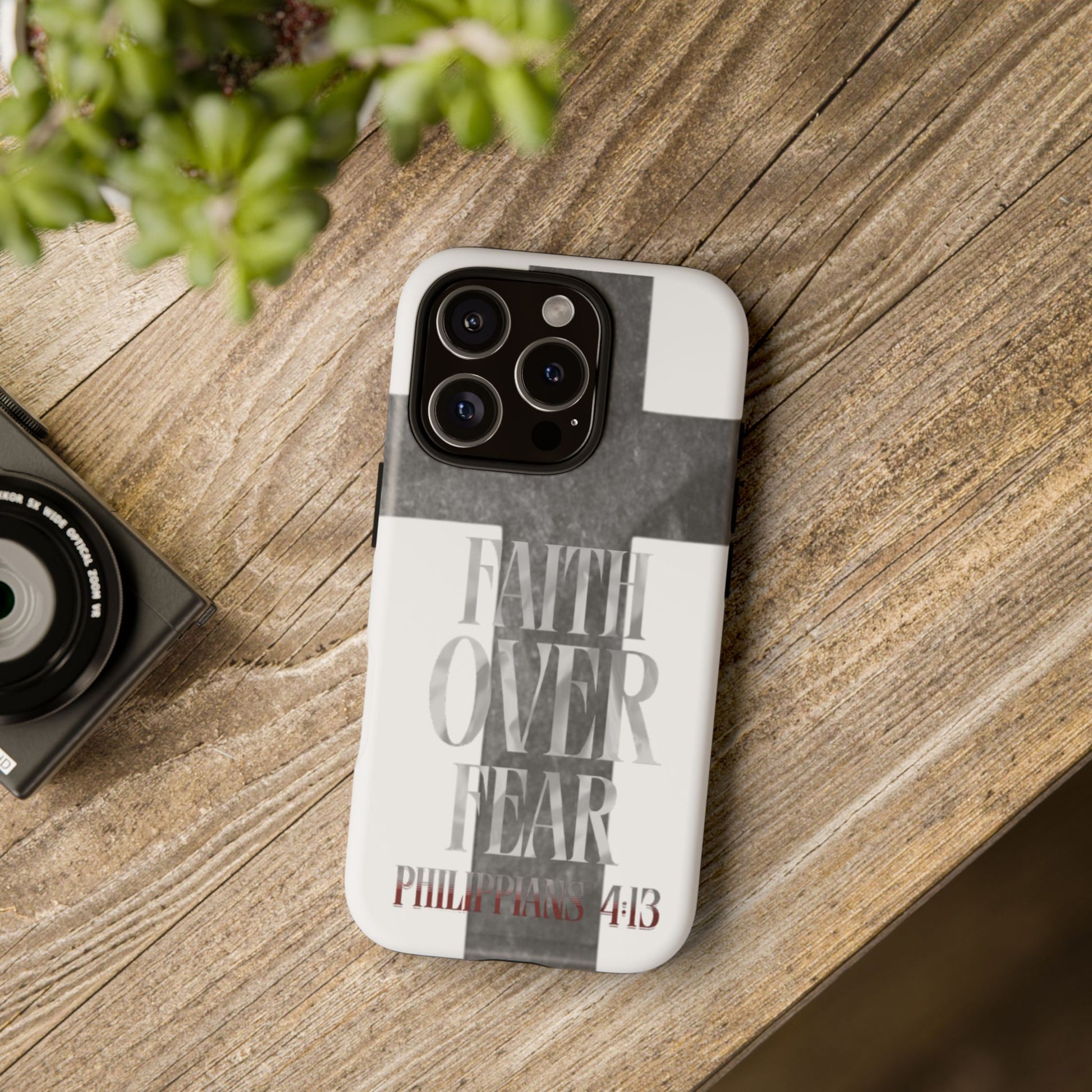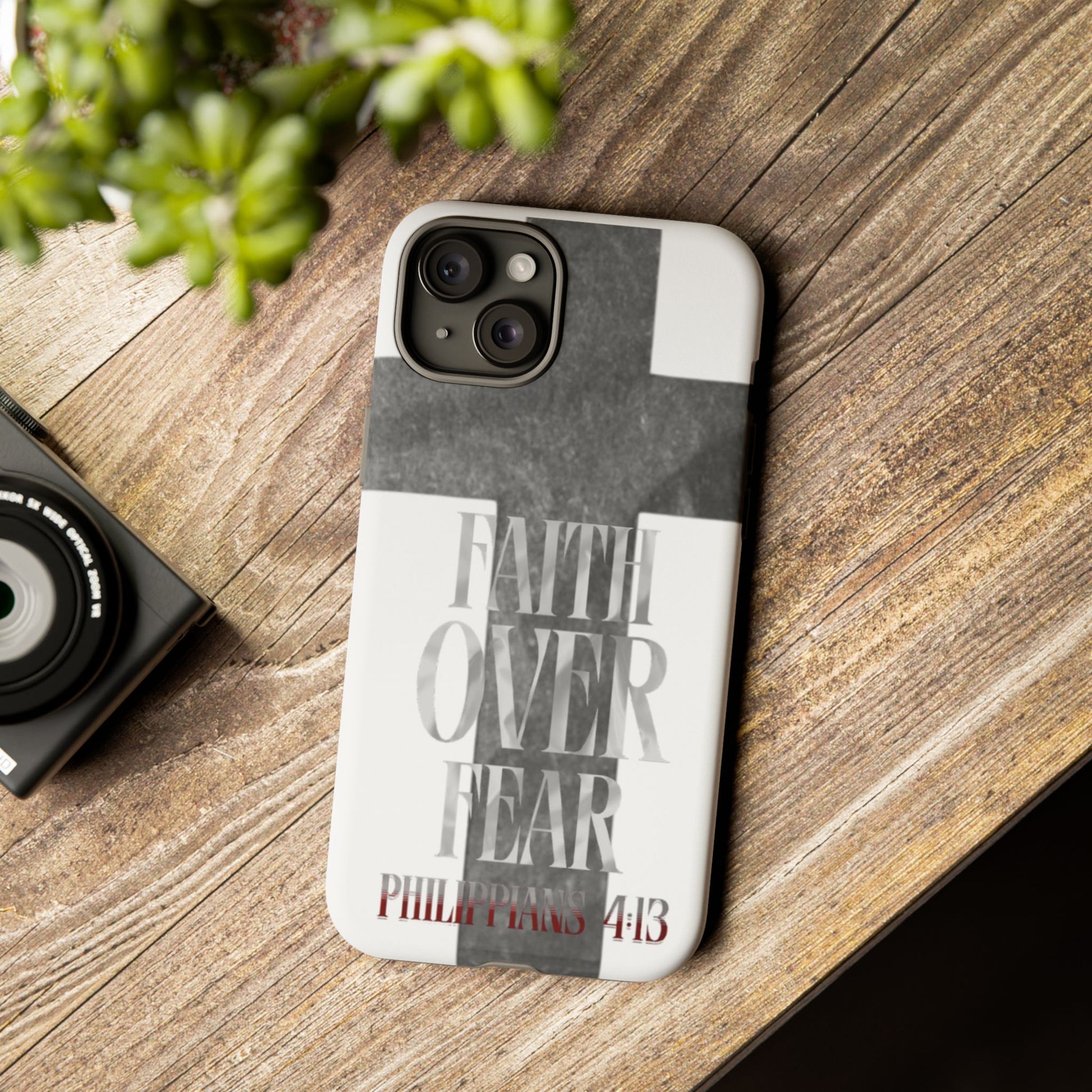 This Phone Case with the design Faith Over Fear on a white background exudes positivity and resilience. Perfect for individuals who value faith and strength in overcoming challenges. Ideal for Christians and spiritual individuals. Relevant for gifts on occasions like birthdays, Christmas, Easter, and as a token of support during tough times.