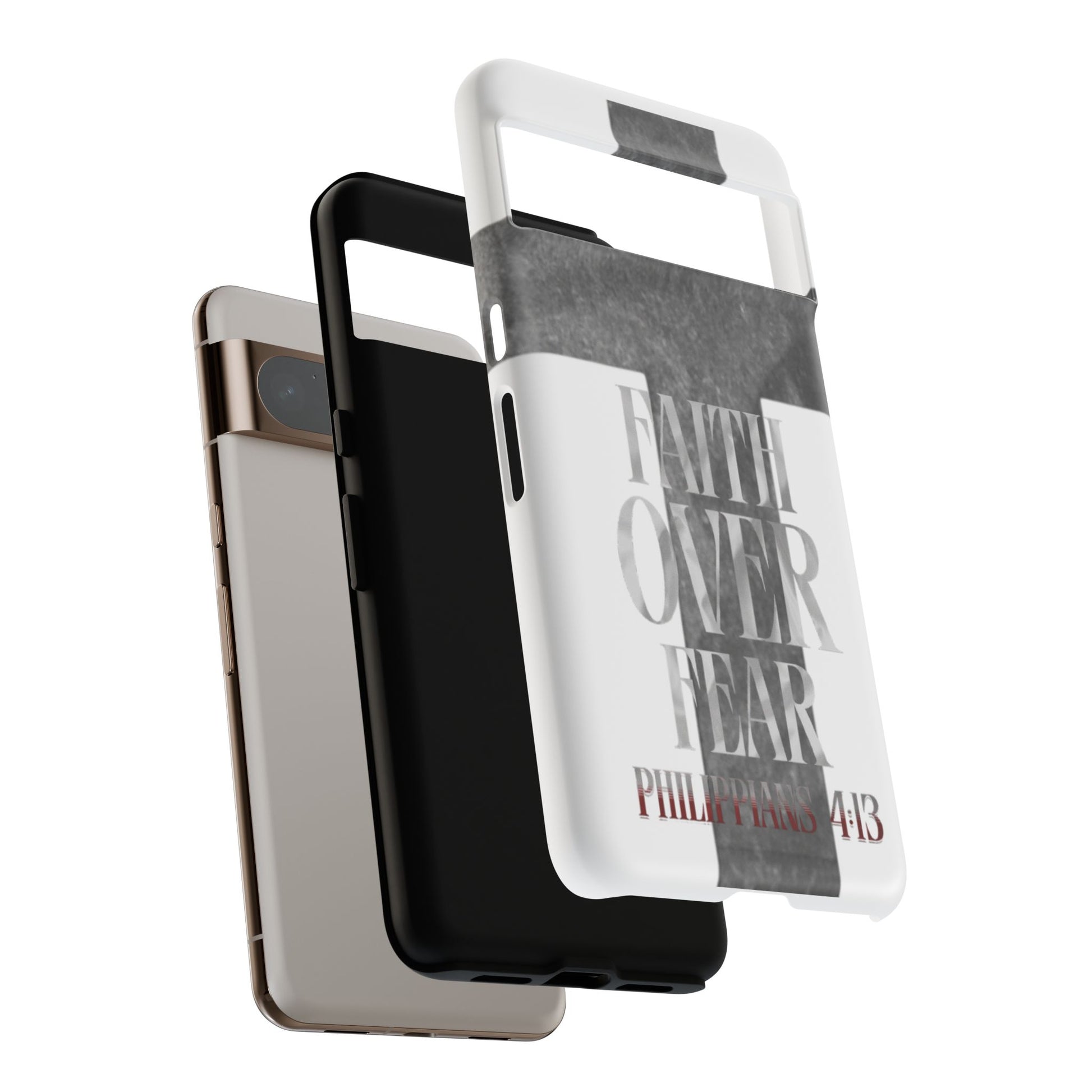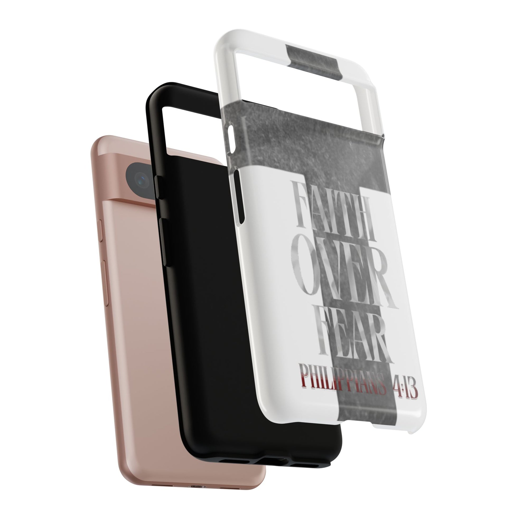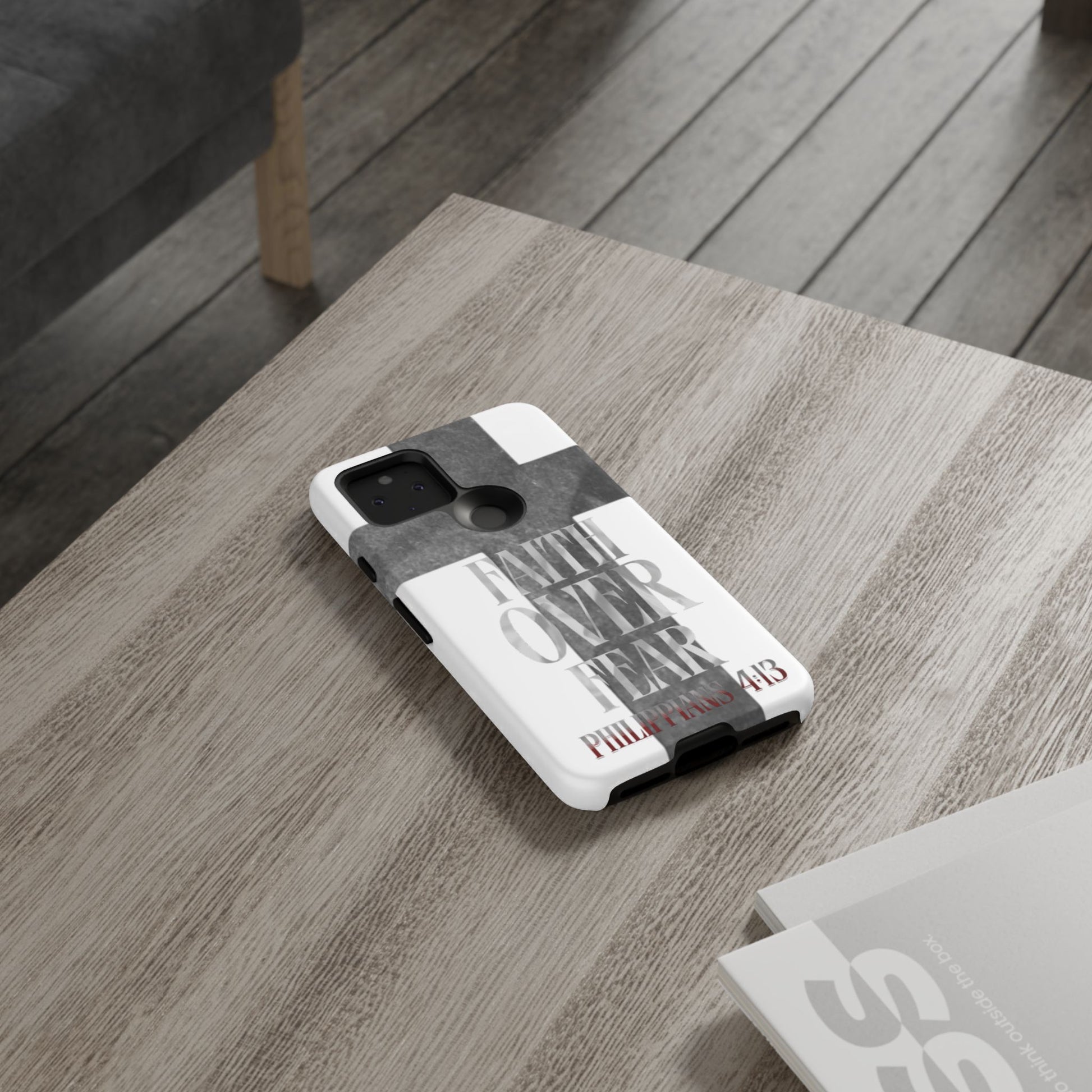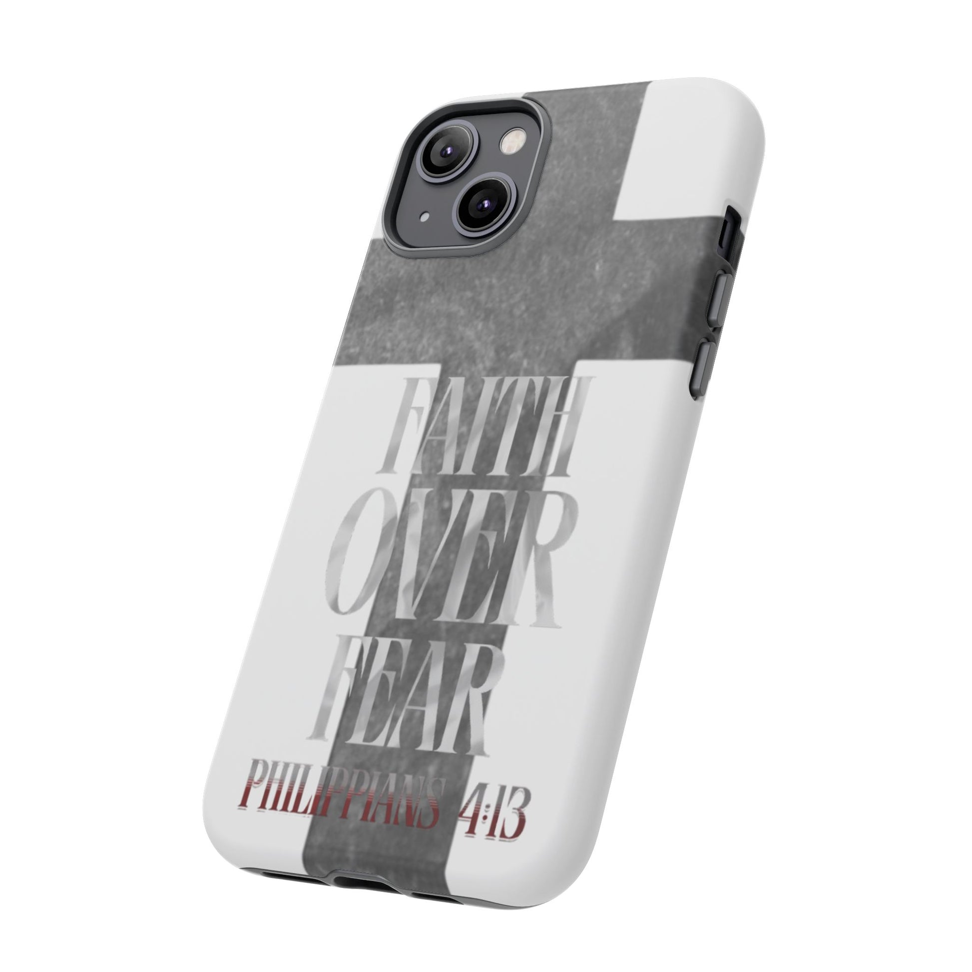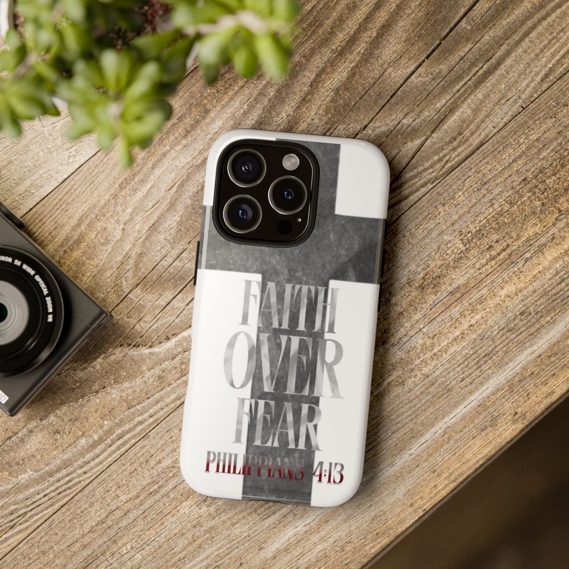 This Phone Case with the design Faith Over Fear on a white background exudes positivity and resilience. Perfect for individuals who value faith and strength in overcoming challenges. Ideal for Christians and spiritual individuals. Relevant for gifts on occasions like birthdays, Christmas, Easter, and as a token of support during tough times.
