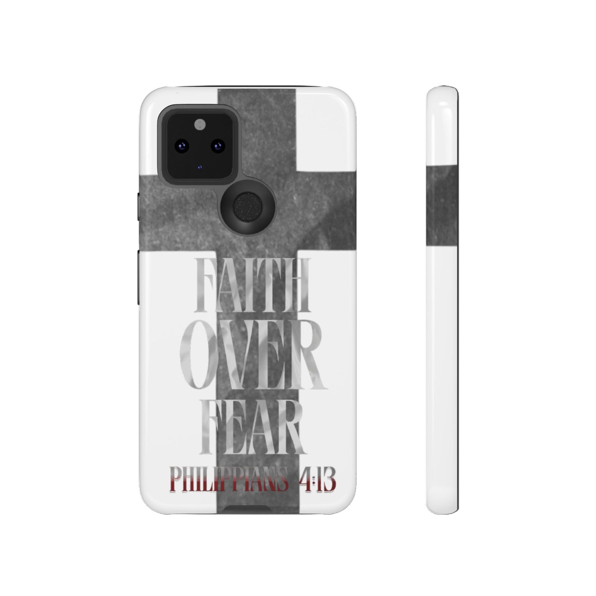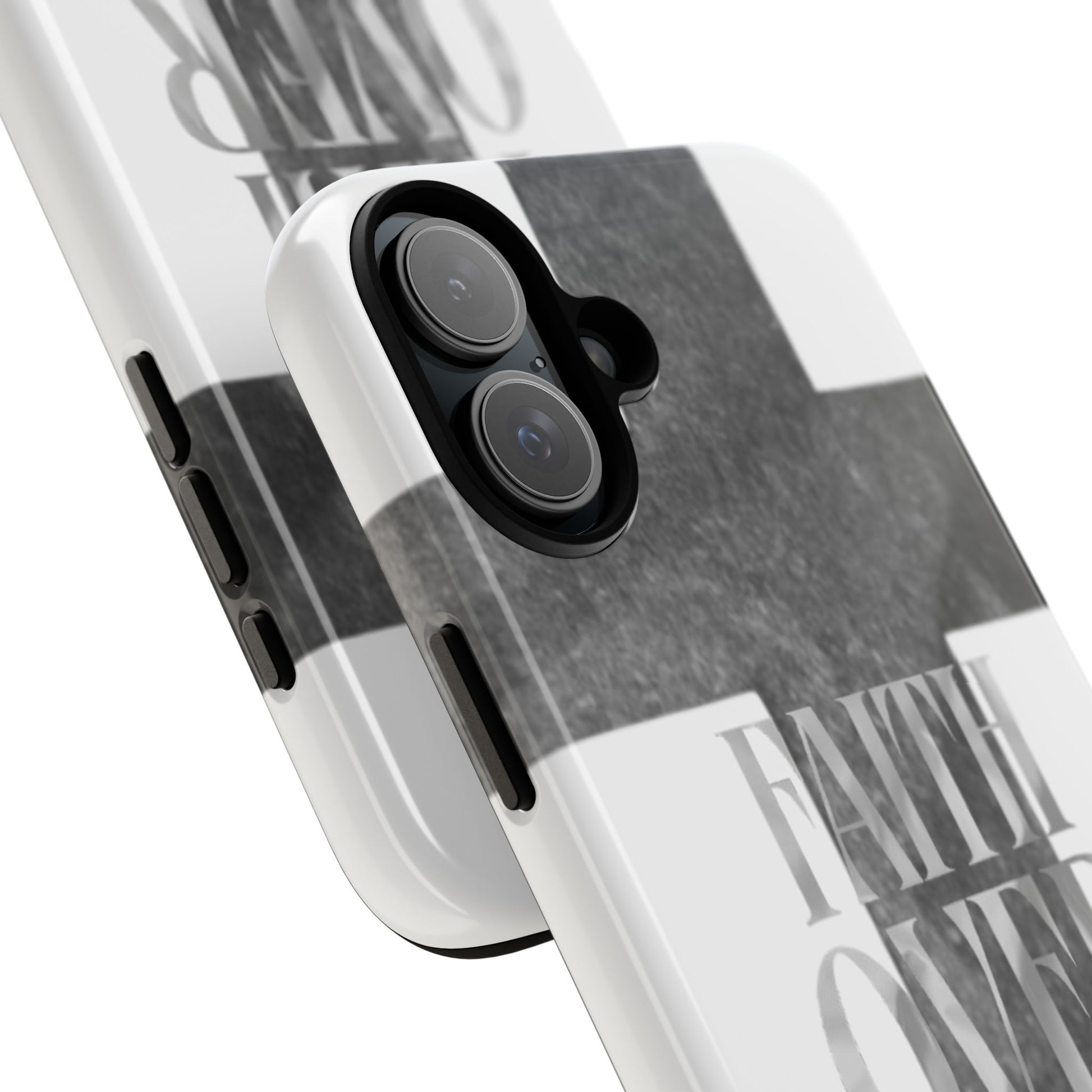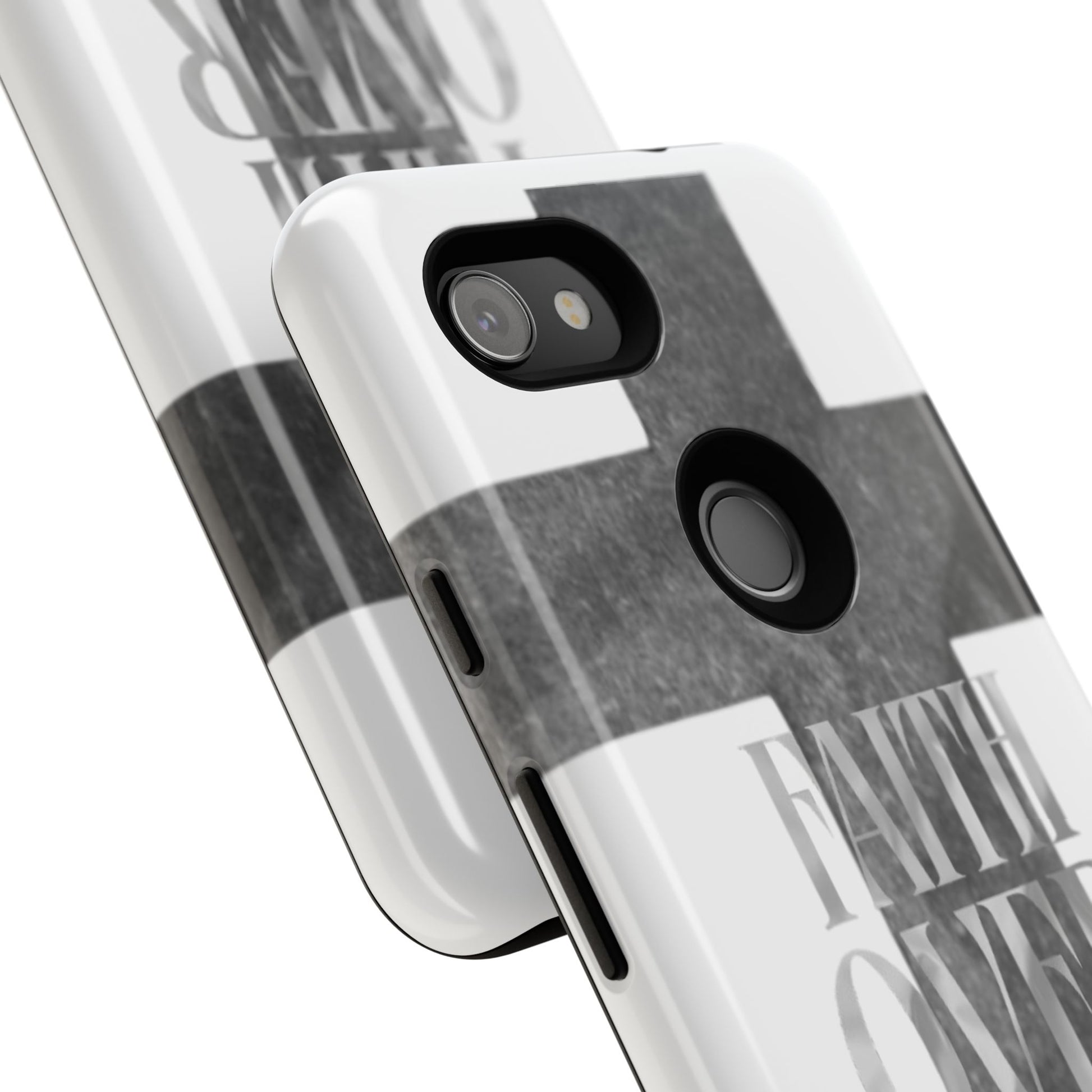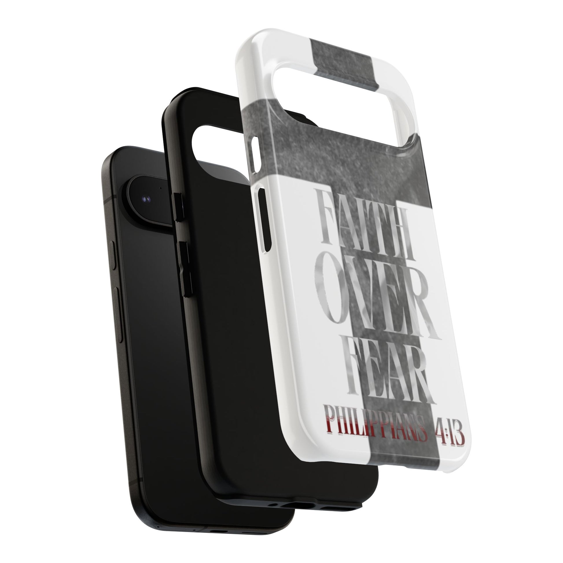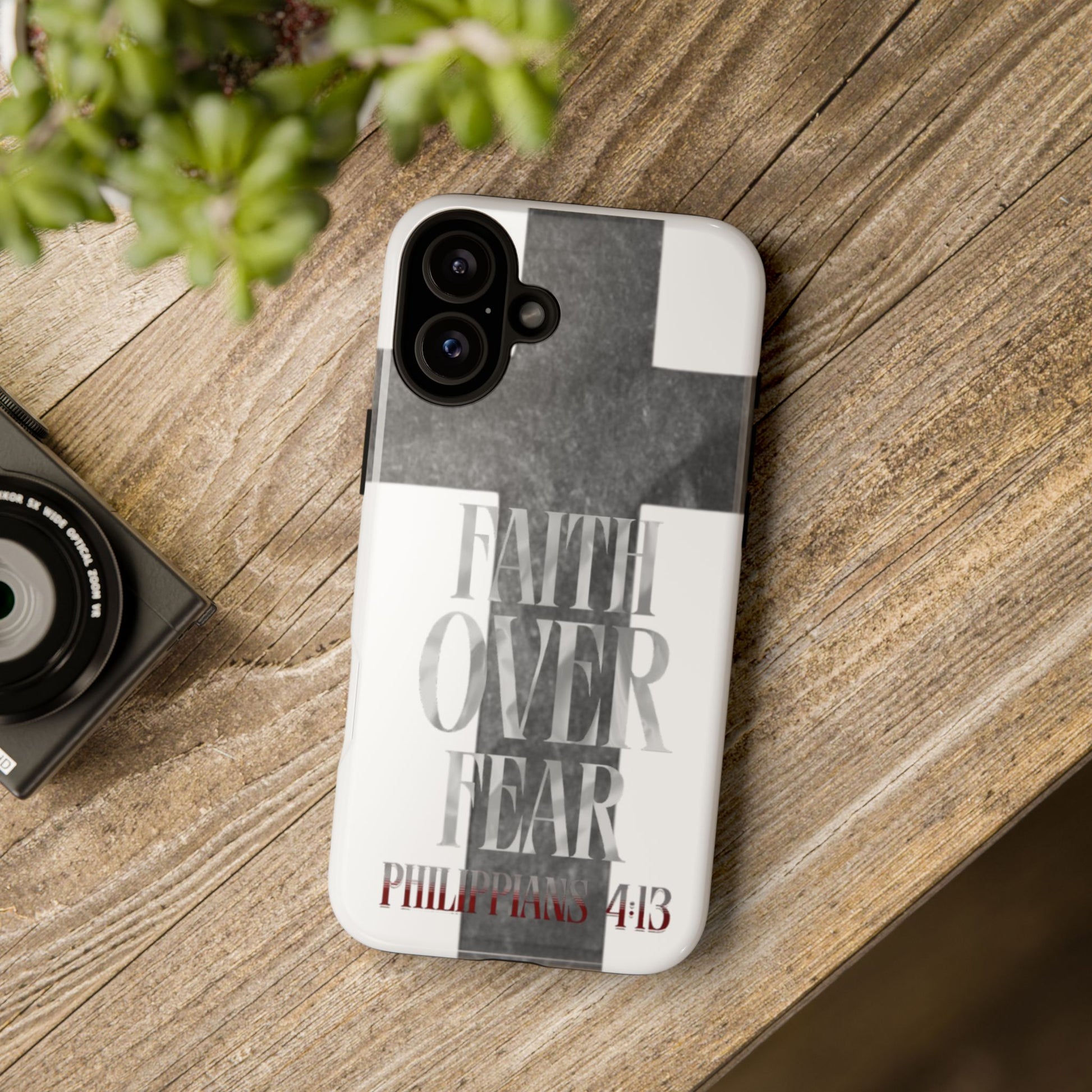 This Phone Case with the design Faith Over Fear on a white background exudes positivity and resilience. Perfect for individuals who value faith and strength in overcoming challenges. Ideal for Christians and spiritual individuals. Relevant for gifts on occasions like birthdays, Christmas, Easter, and as a token of support during tough times.