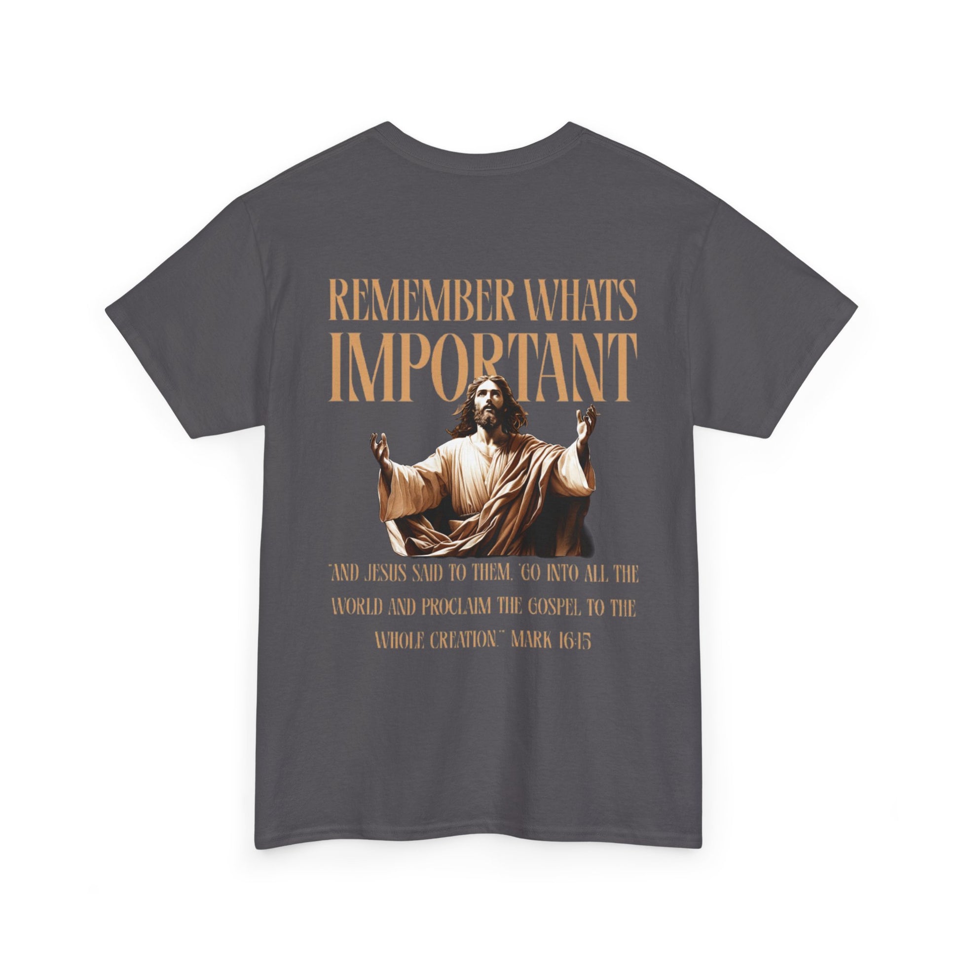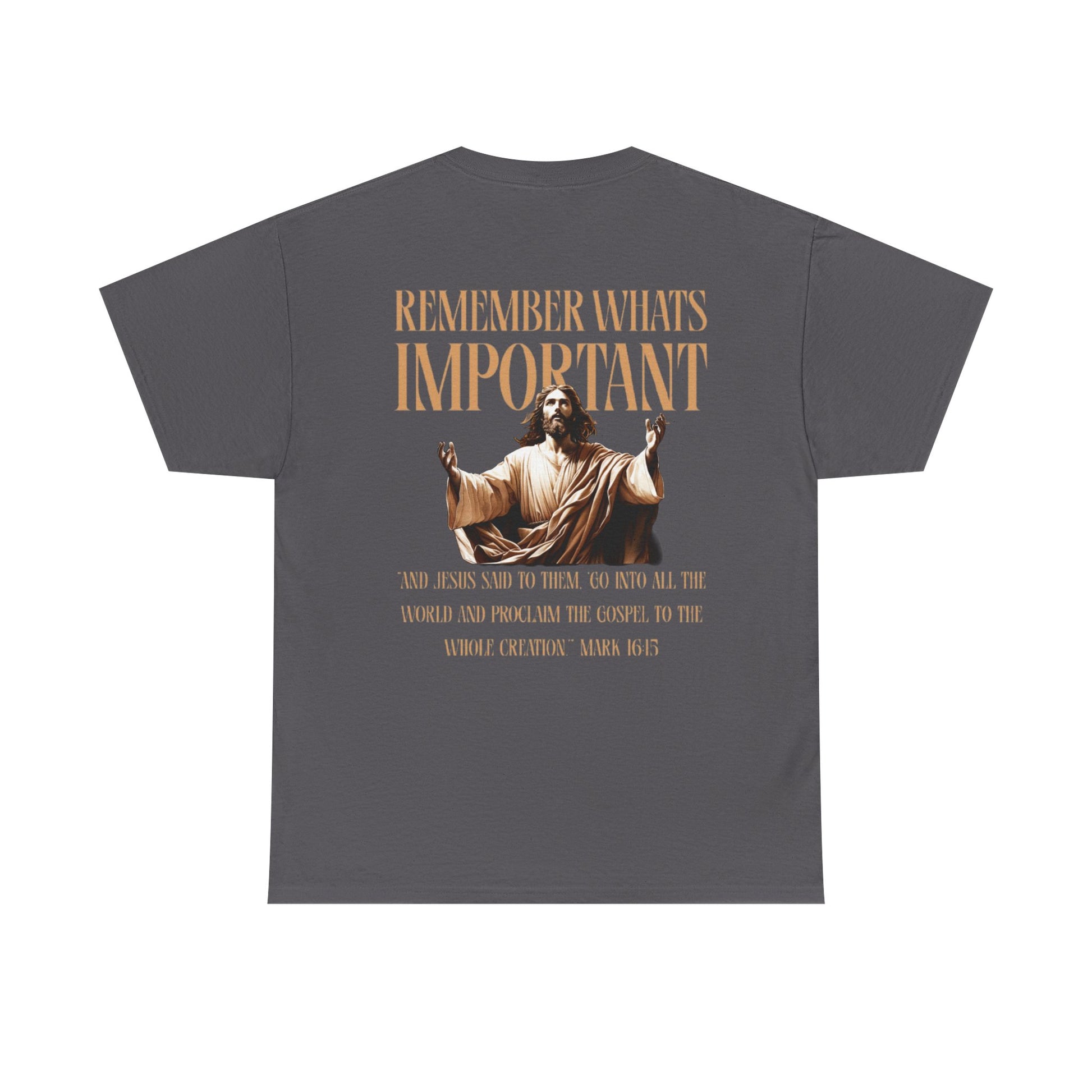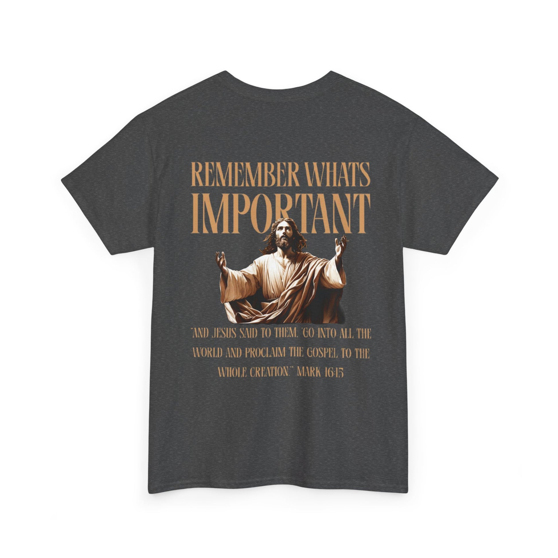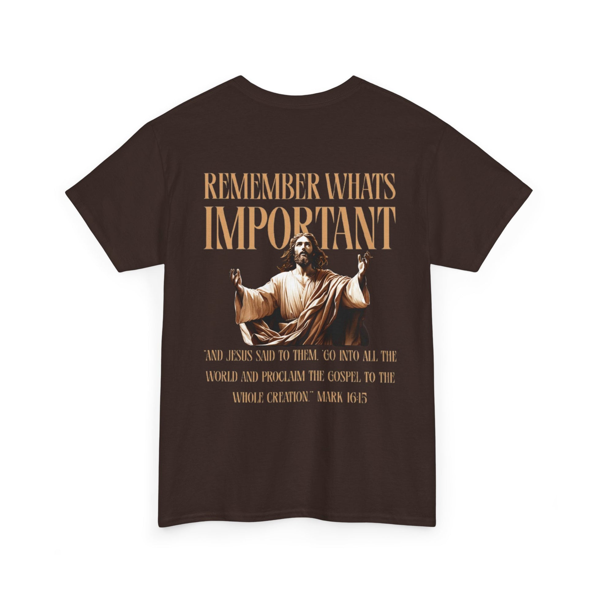A unisex cotton tee with a 'remember what's important' design. This tee exudes a relaxed and casual vibe, perfect for everyday wear or lounging around. Ideal for adults who appreciate comfortable and stylish clothing. Relevant for holidays, birthdays, and casual gatherings.