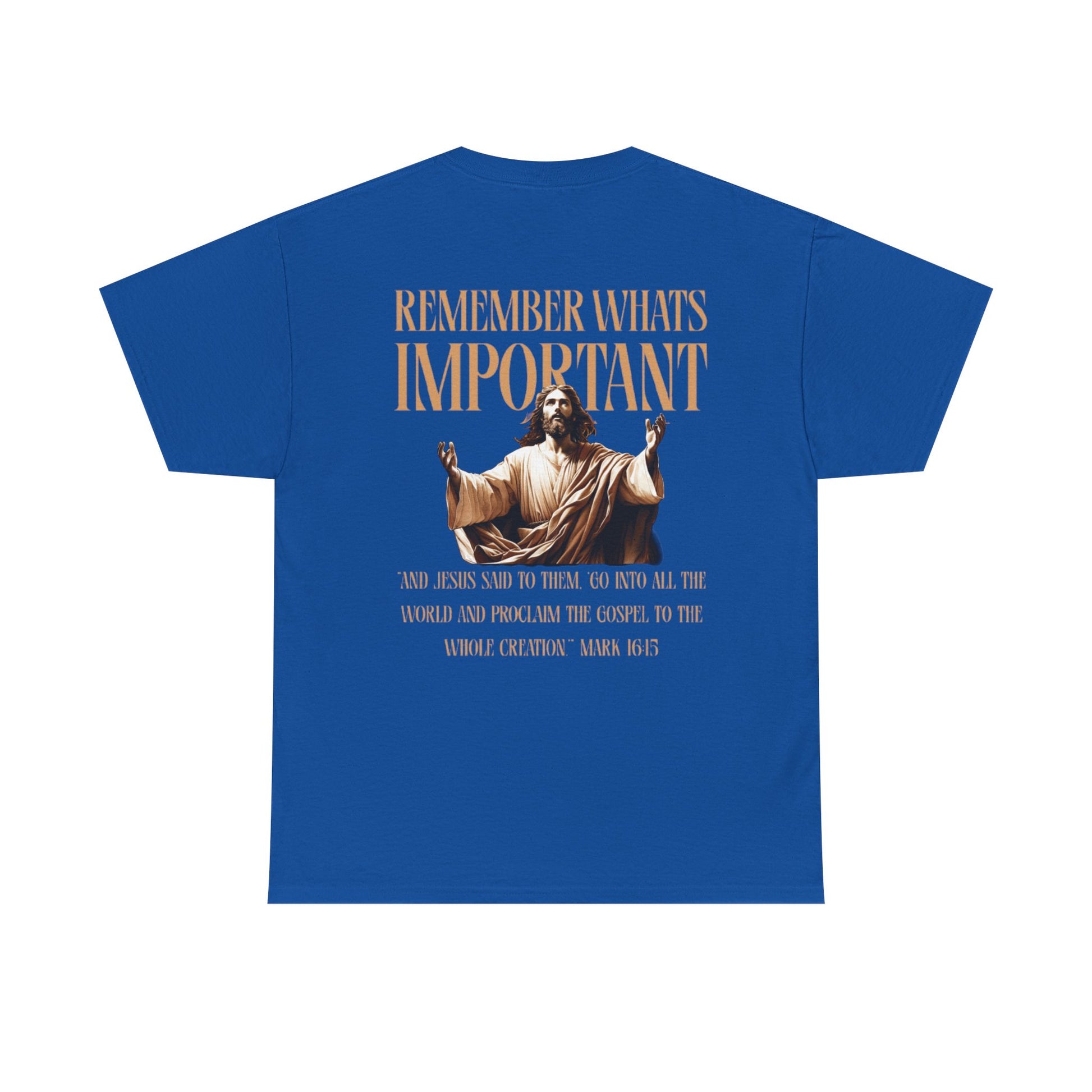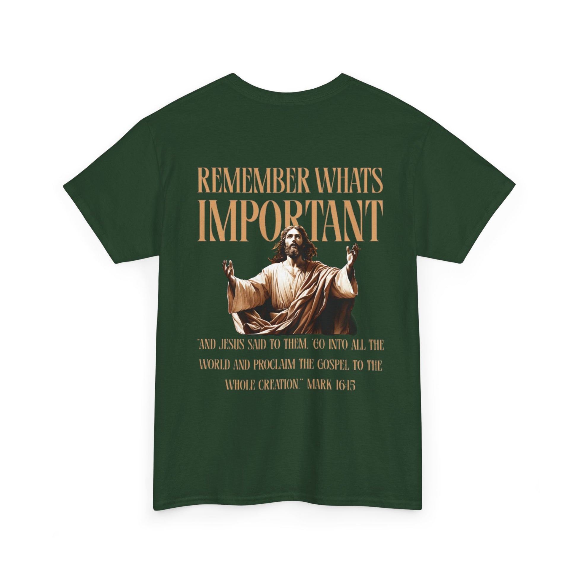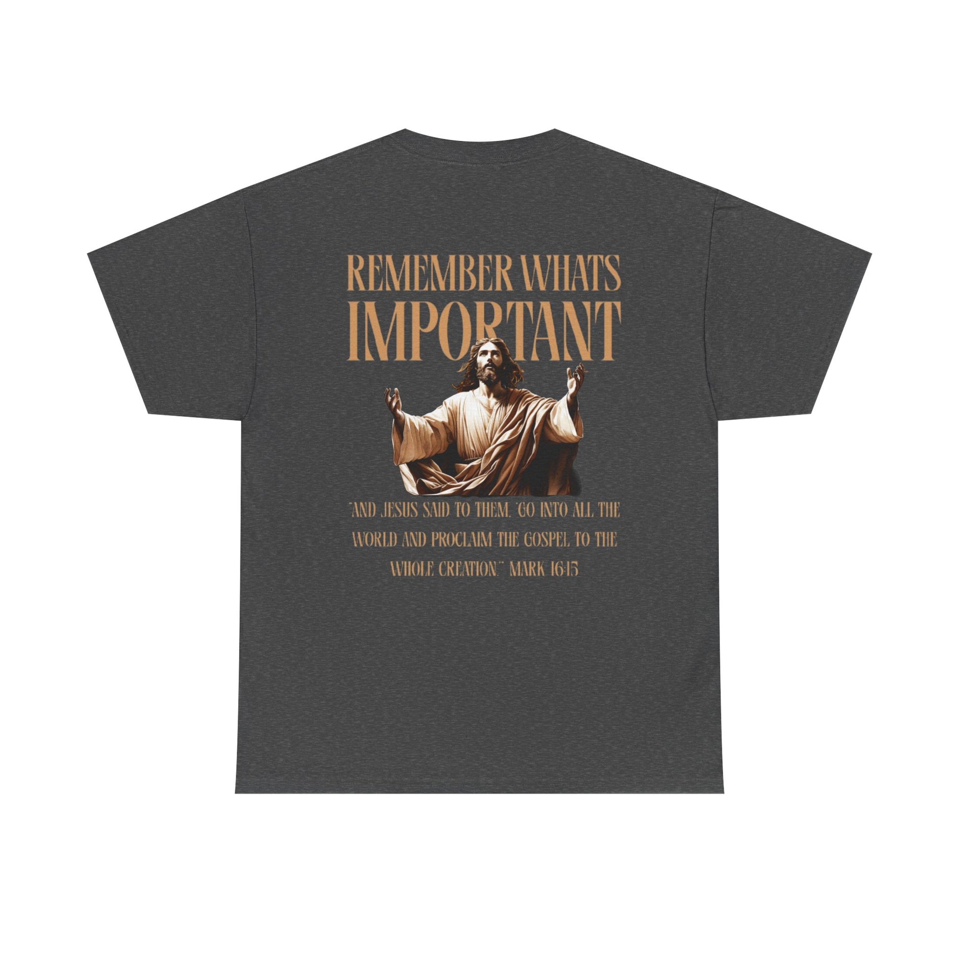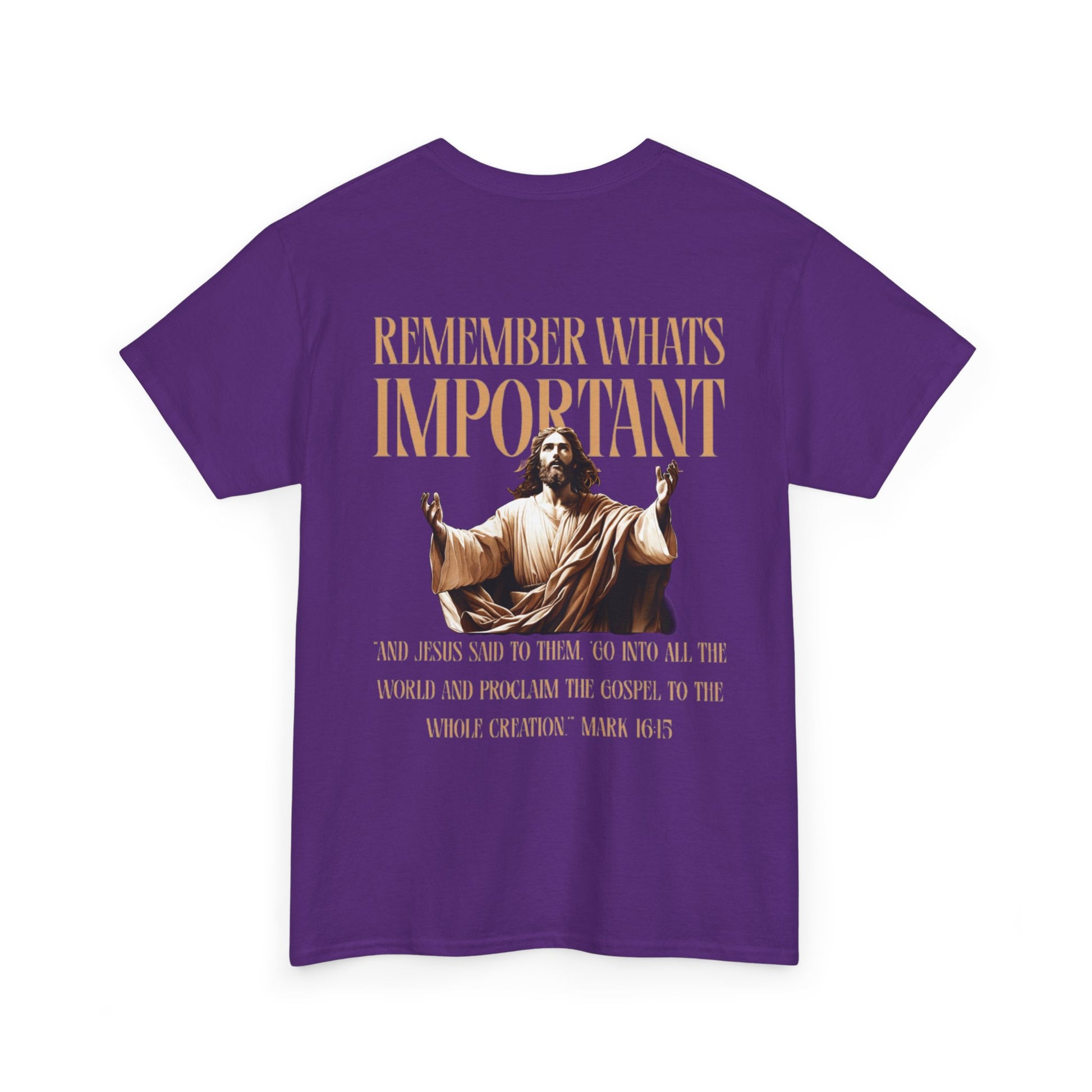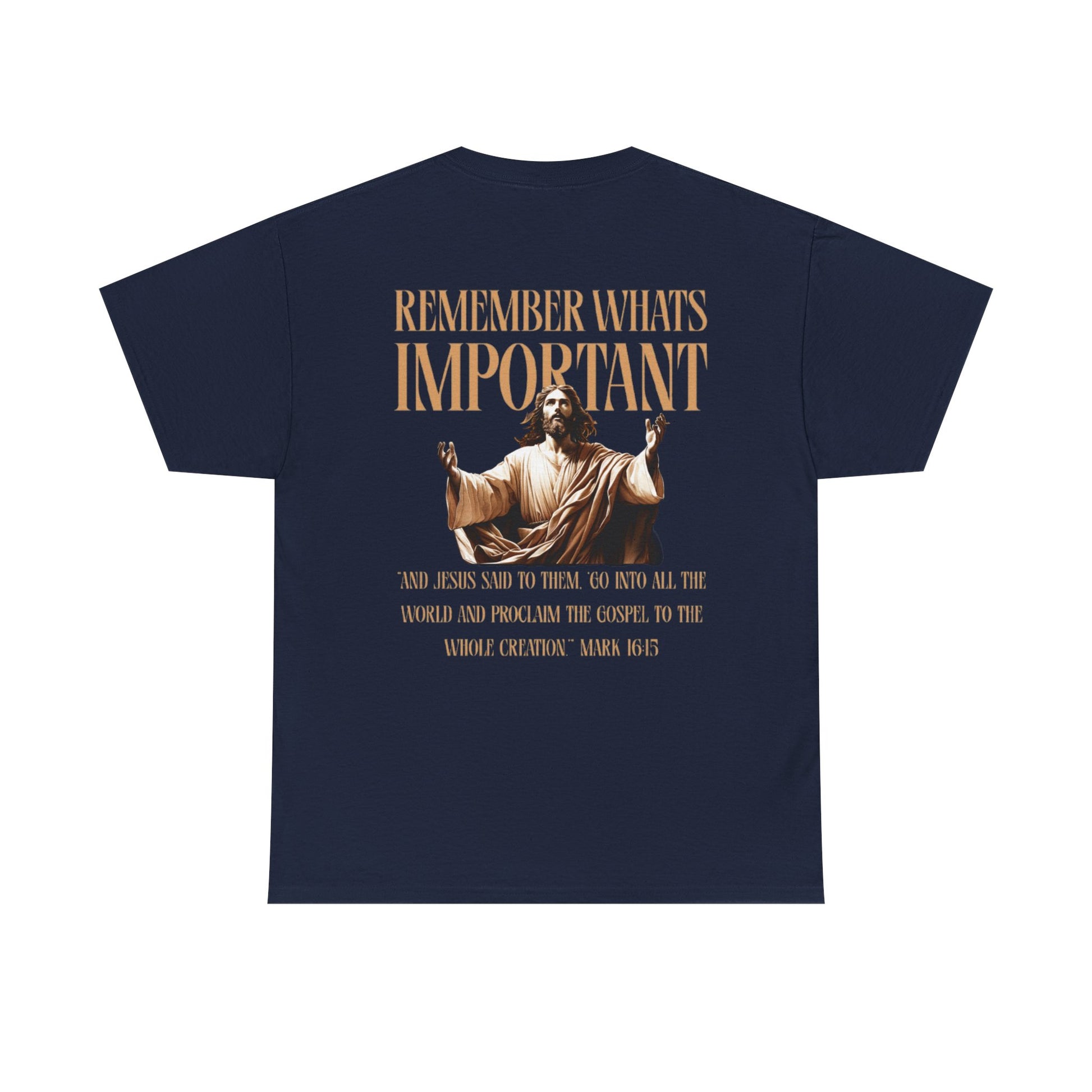 A unisex cotton tee with a 'remember what's important' design. This tee exudes a relaxed and casual vibe, perfect for everyday wear or lounging around. Ideal for adults who appreciate comfortable and stylish clothing. Relevant for holidays, birthdays, and casual gatherings.
