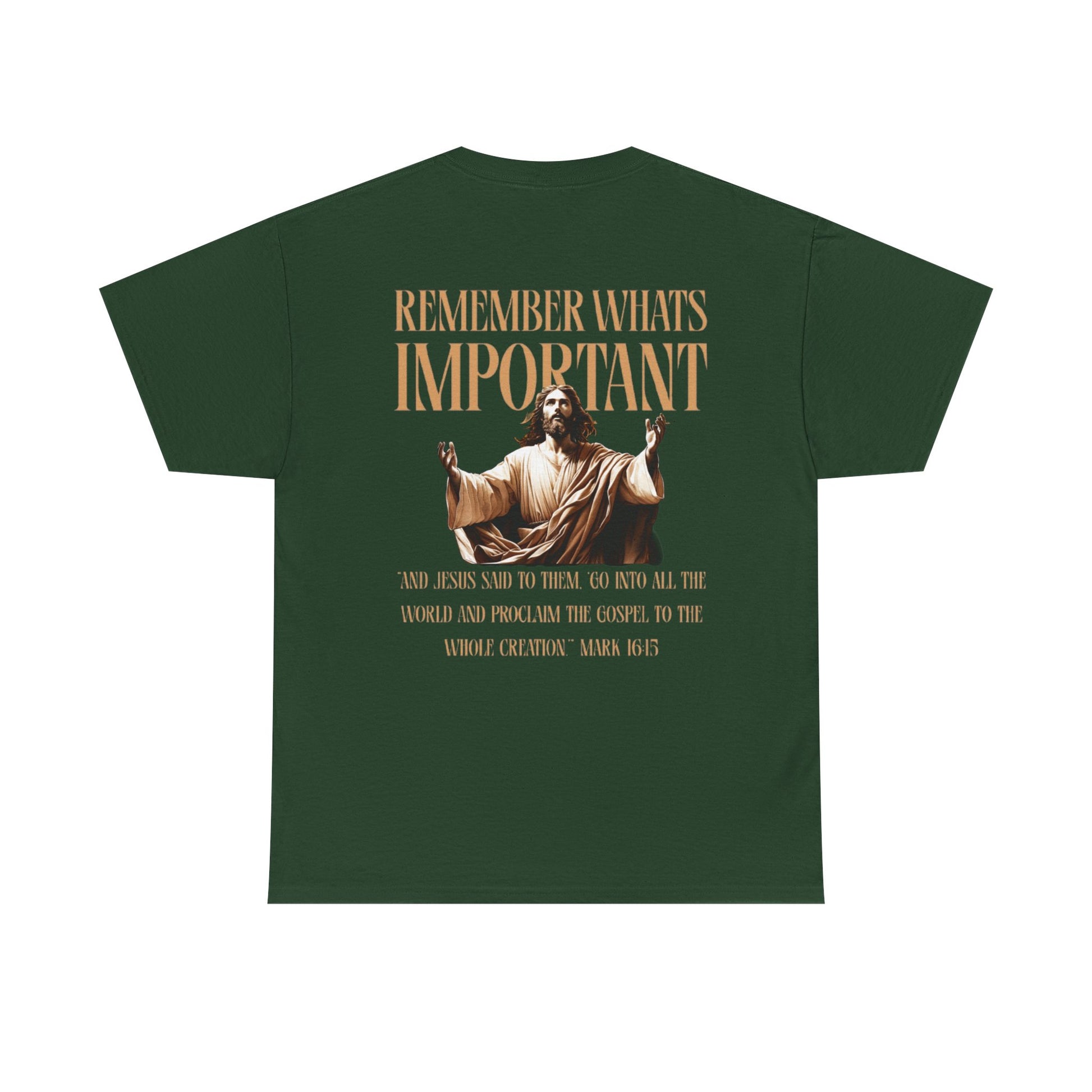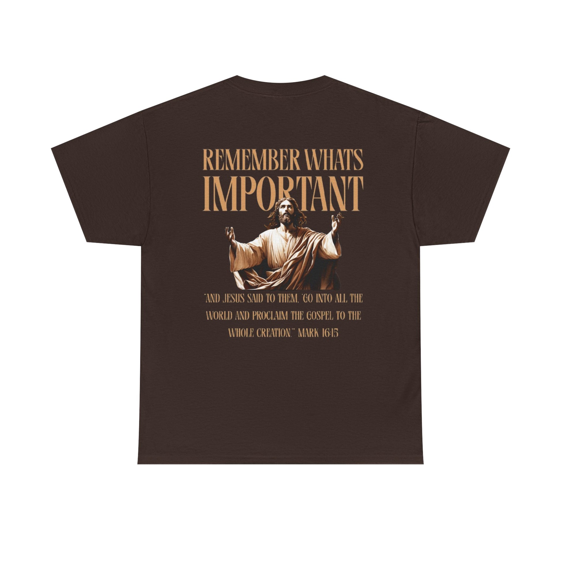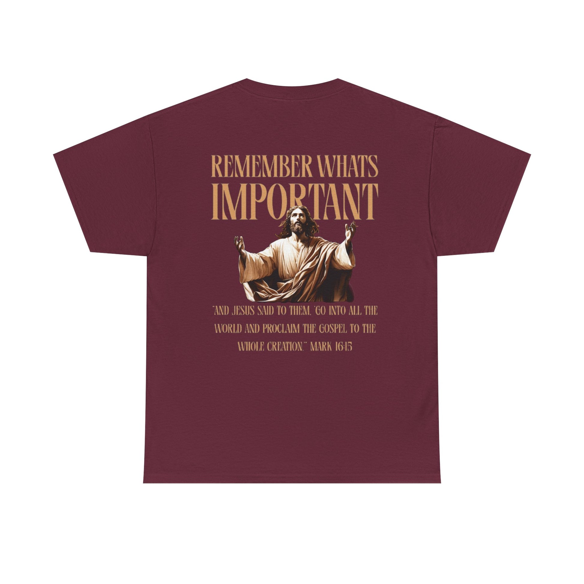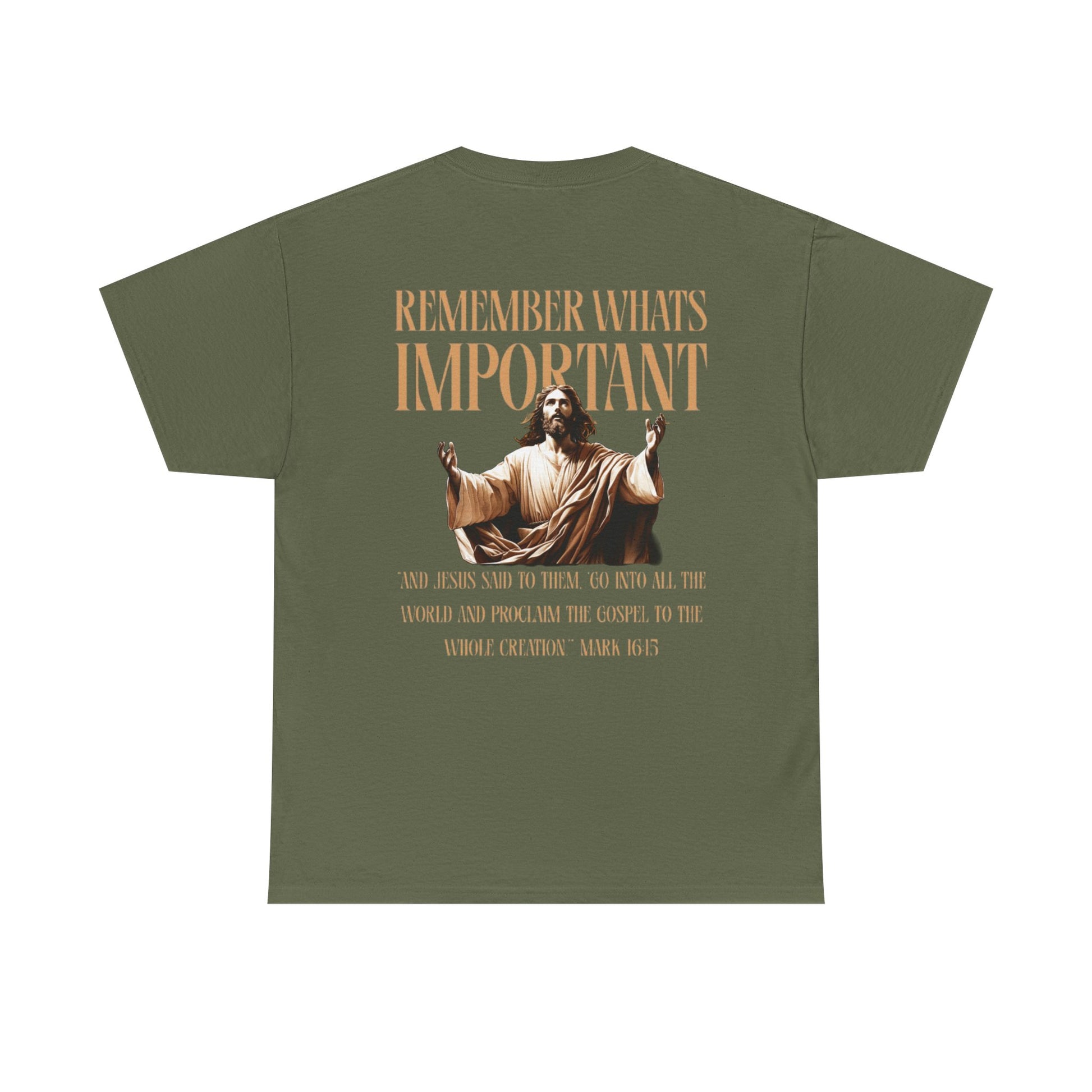 A unisex cotton tee with a 'remember what's important' design. This tee exudes a relaxed and casual vibe, perfect for everyday wear or lounging around. Ideal for adults who appreciate comfortable and stylish clothing. Relevant for holidays, birthdays, and casual gatherings.